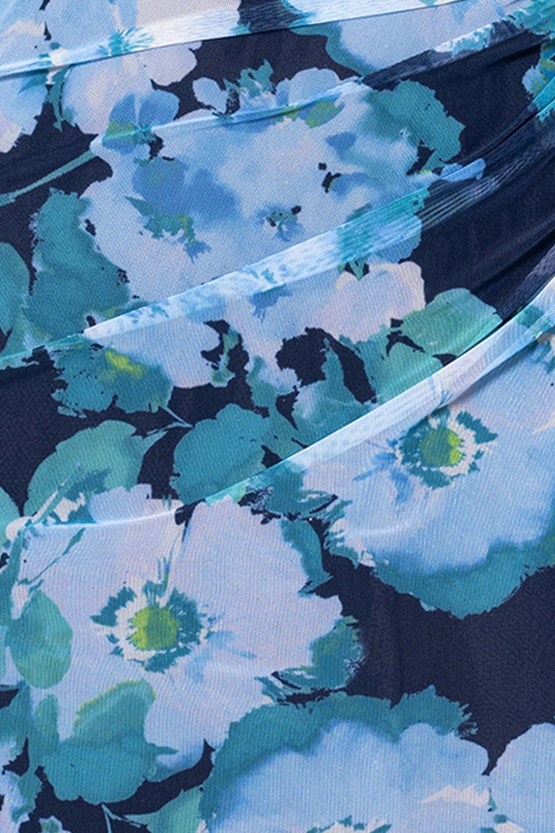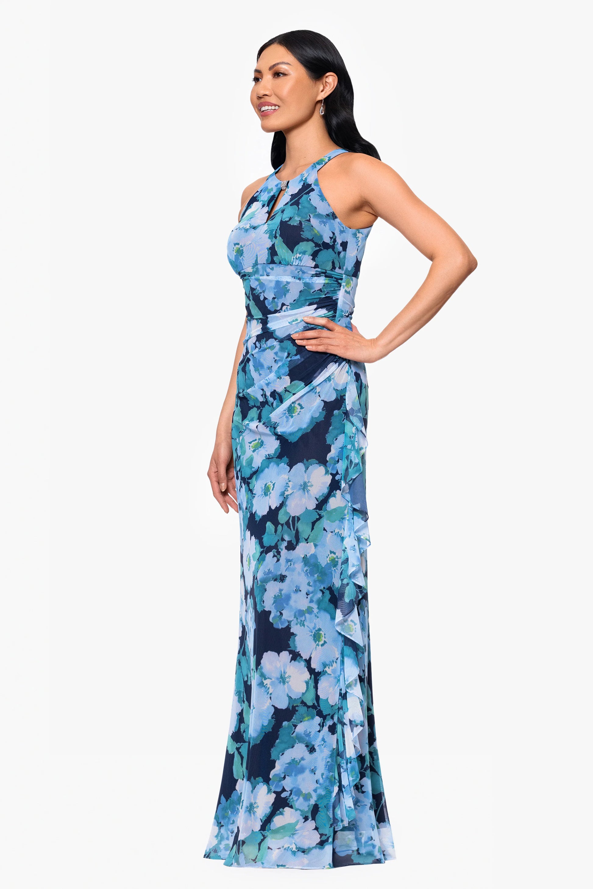 Breeze into your next celebration in this floral printed gown featuring a gathered bodice with keyhole detail, flattering side ruching, and cascading ruffle drape. A soft, flowy silhouette ensures effortless elegance from ceremony to dance floor.
