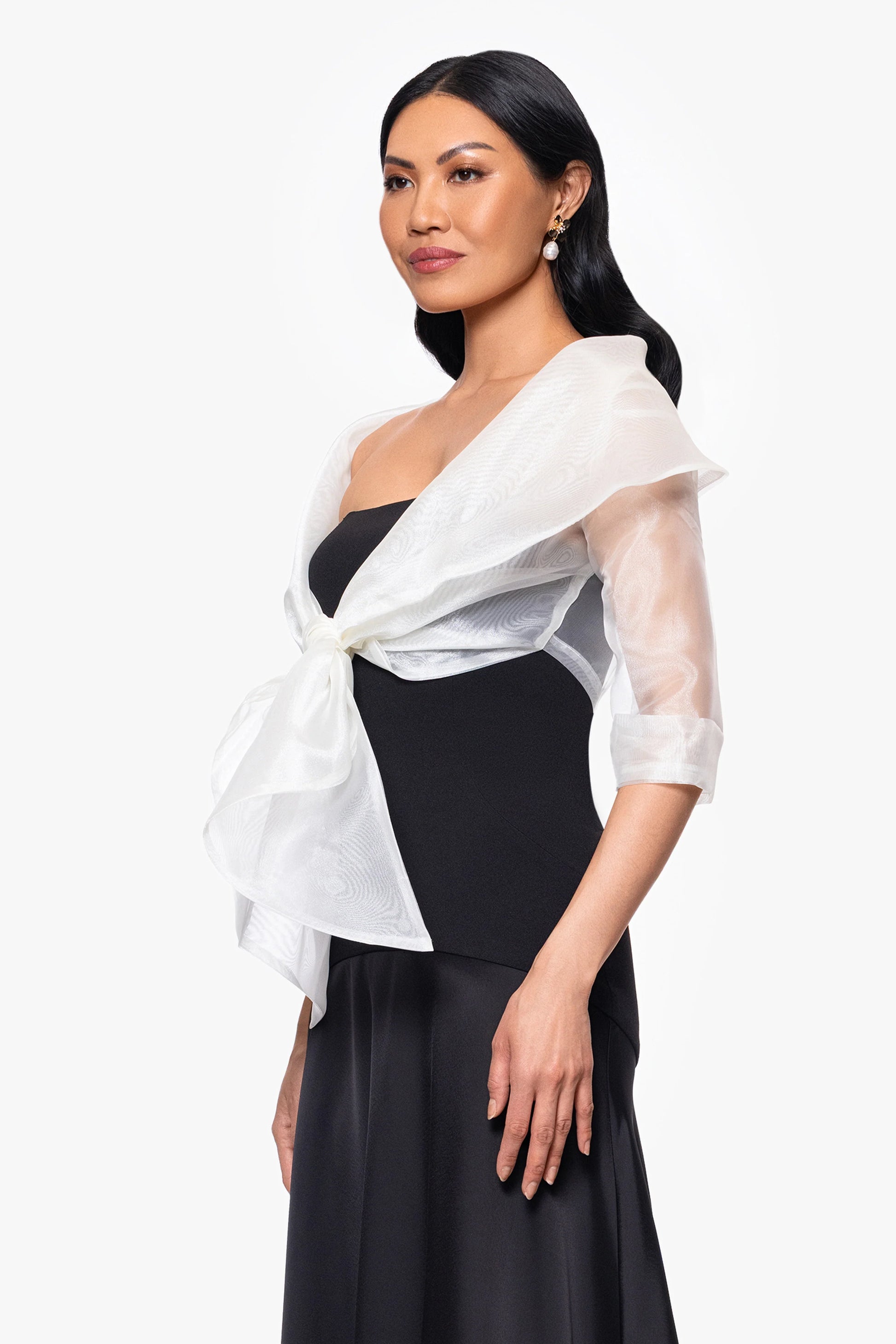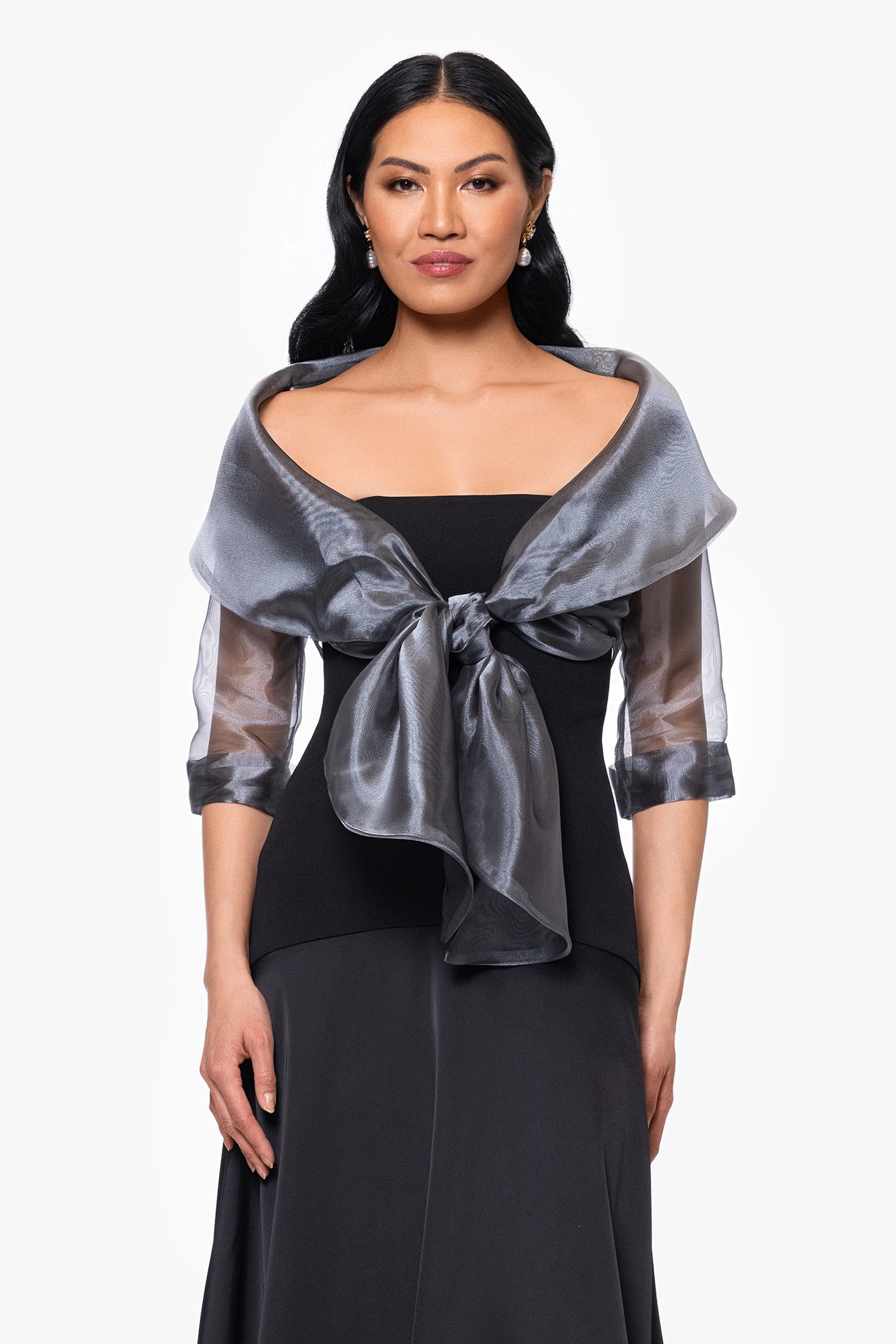 This refined shawl wrap is crafted from a sheer, lightweight fabric with a soft, shimmering finish. It features 3/4 length sleeves with rolled cuffs, offering an elegant and timeless look. The wrap ties at the front in a chic knot, draping beautifully over the shoulders and framing the face. Perfect for enhancing any formal ensemble, this accessory adds sophistication with its graceful design.