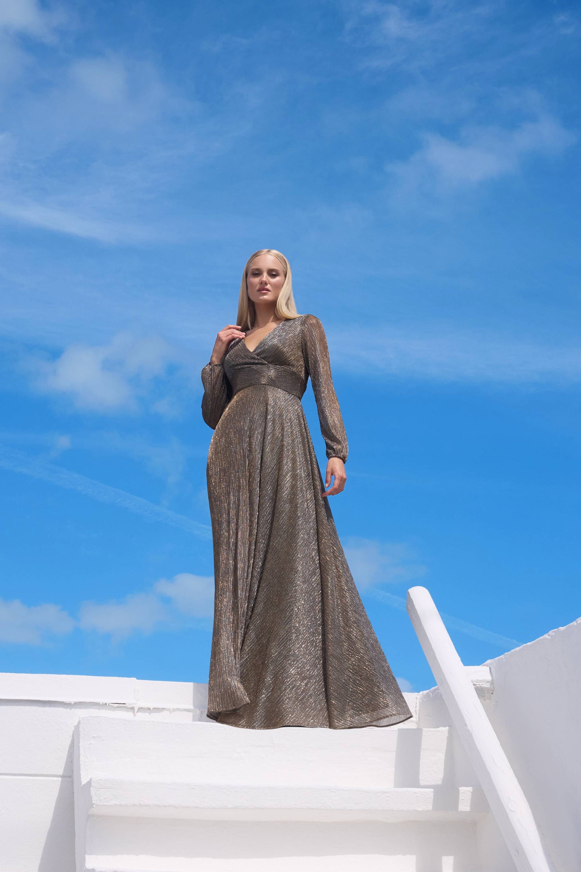 Get ready to shine in our "Alexa" Long Sleeve Metallic Knit Dress! Made of a stunning metallic knit material, this dress features a hidden back zipper and illusion long sleeves for a sleek look. The v-neck and waist band add extra detail, making you stand out from the crowd. Stay fully lined and looking fabulous all night long!
