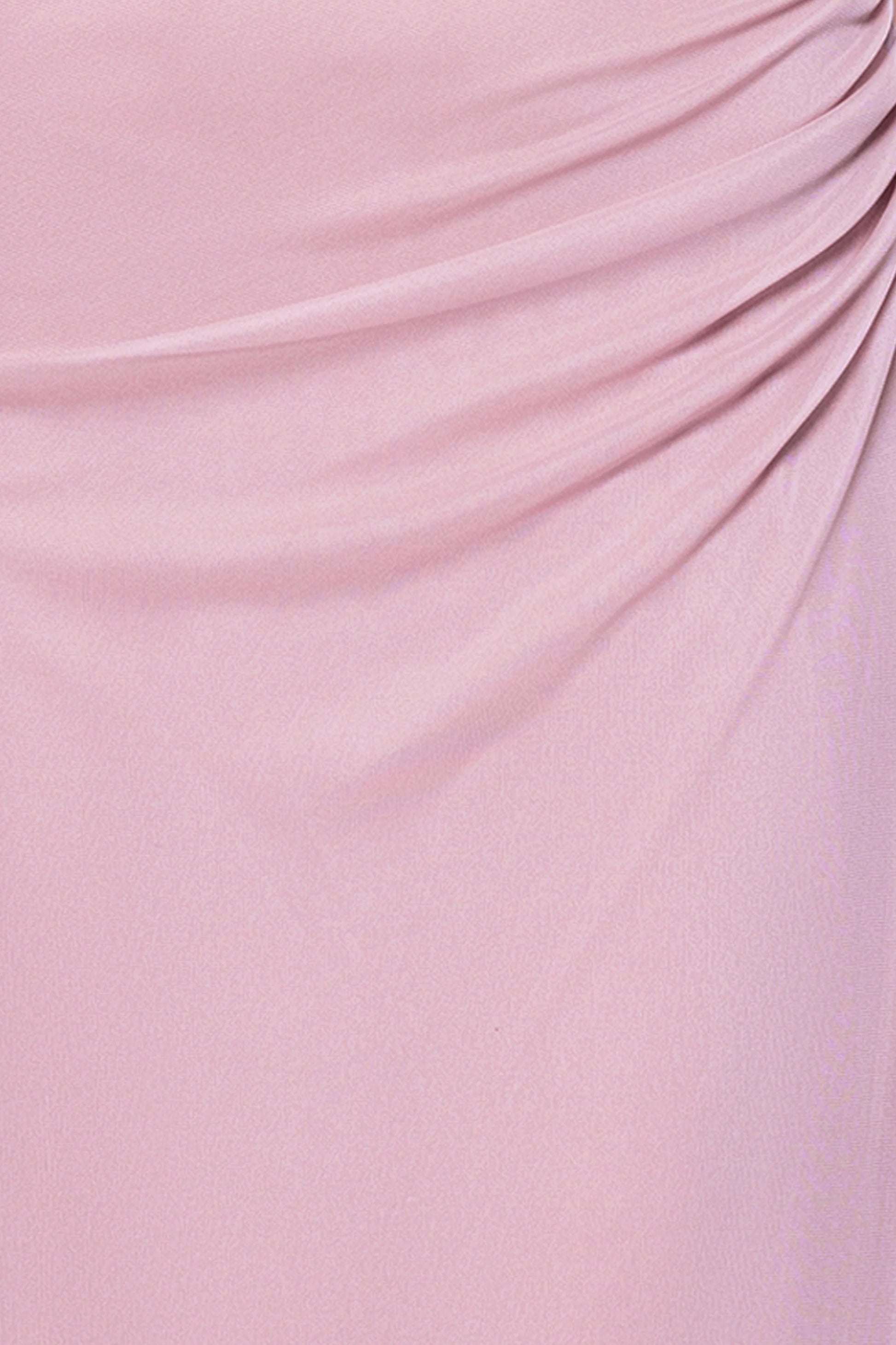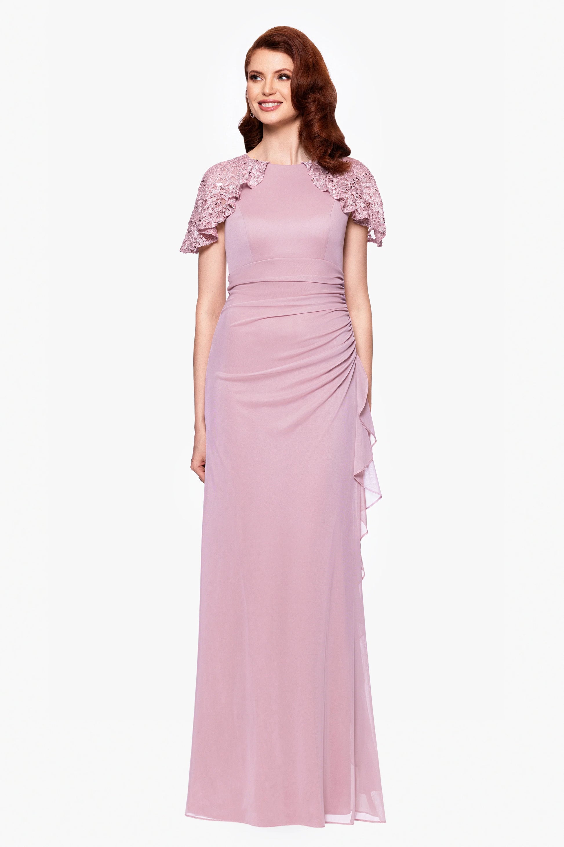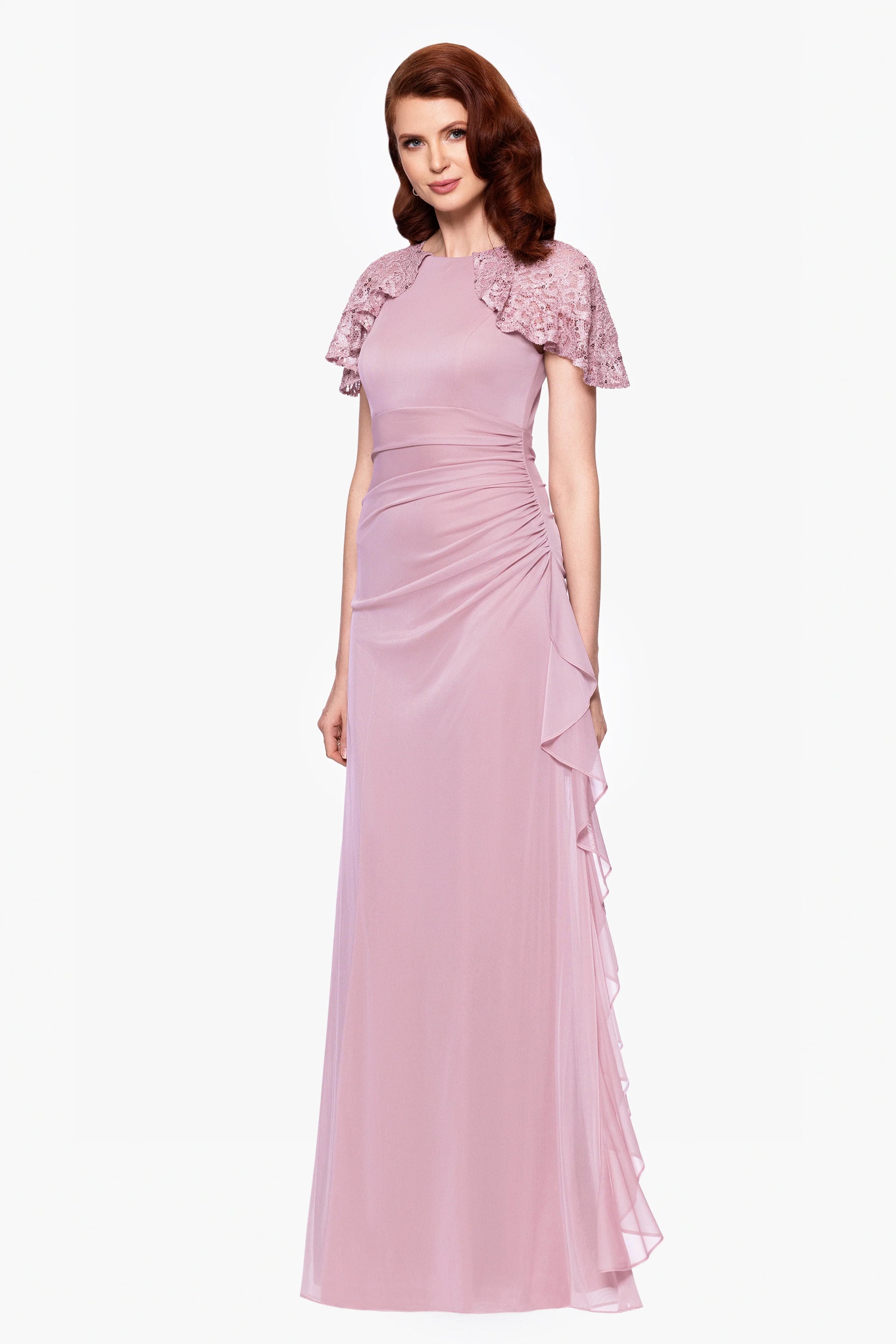 Grace meets sophistication in this stunning gown, featuring delicate lace cap sleeves and elegant ruching for a flattering silhouette. The soft rose hue adds a romantic touch, while cascading side draping brings effortless movement. A perfect choice for formal events!