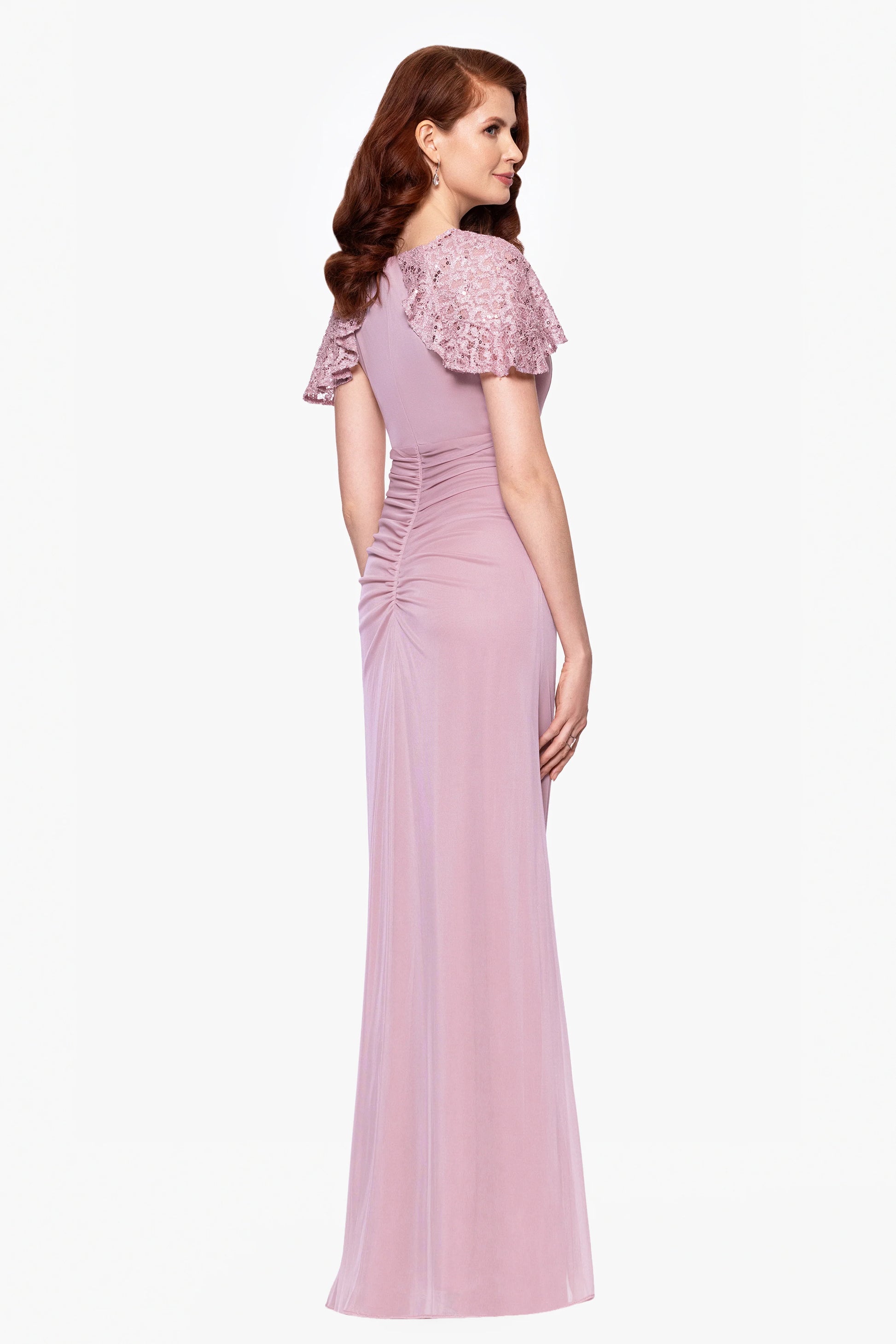 "Alexia" Sheer Matte Jersey With Lace Sleeves Floor Length Dress