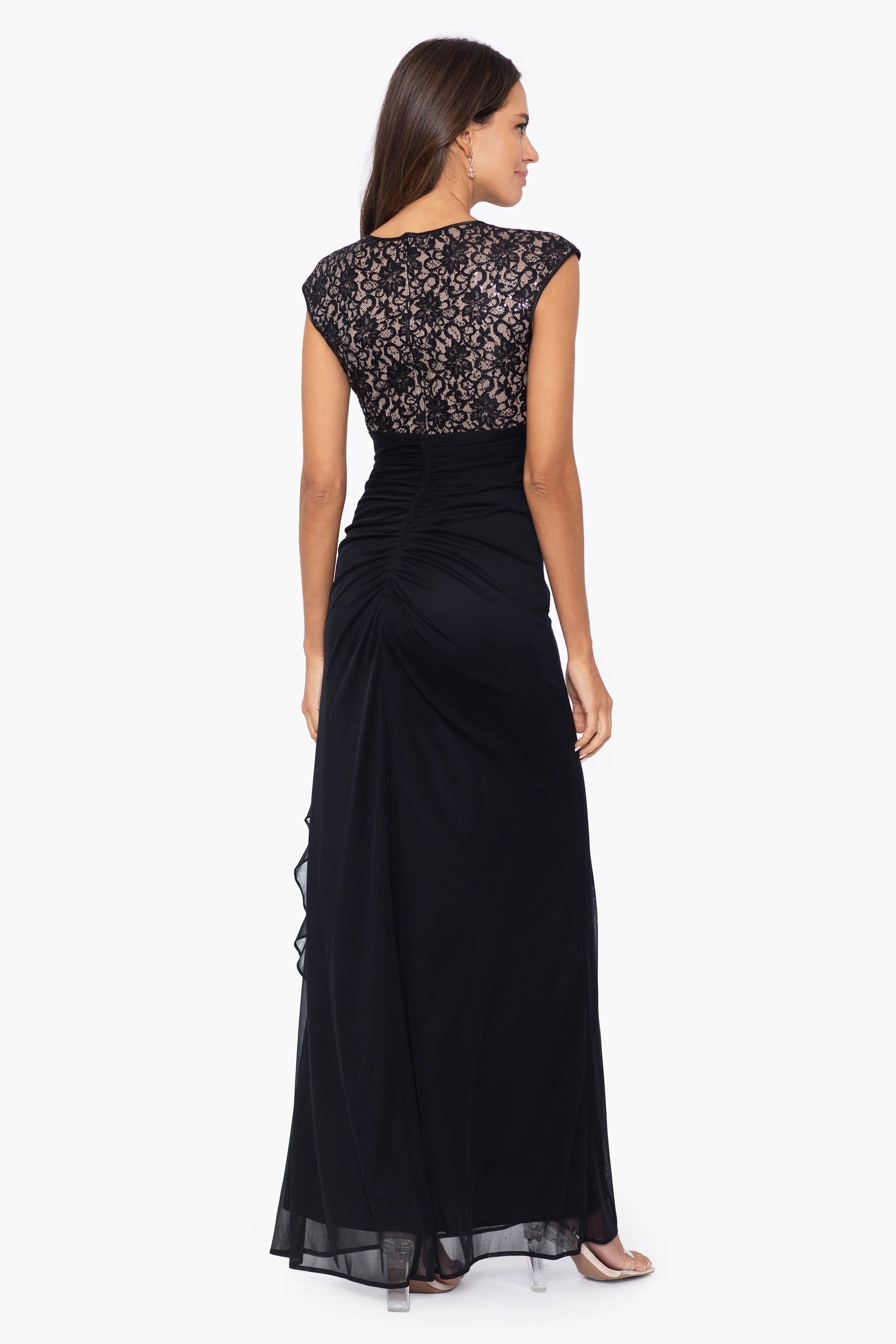 Make a statement in this elegant gown featuring a delicate lace bodice with a keyhole neckline and cap sleeves. The fitted waist flows into a floor-length skirt with cascading ruffle accents, creating a sophisticated silhouette. Perfect for formal evenings or special occasions.