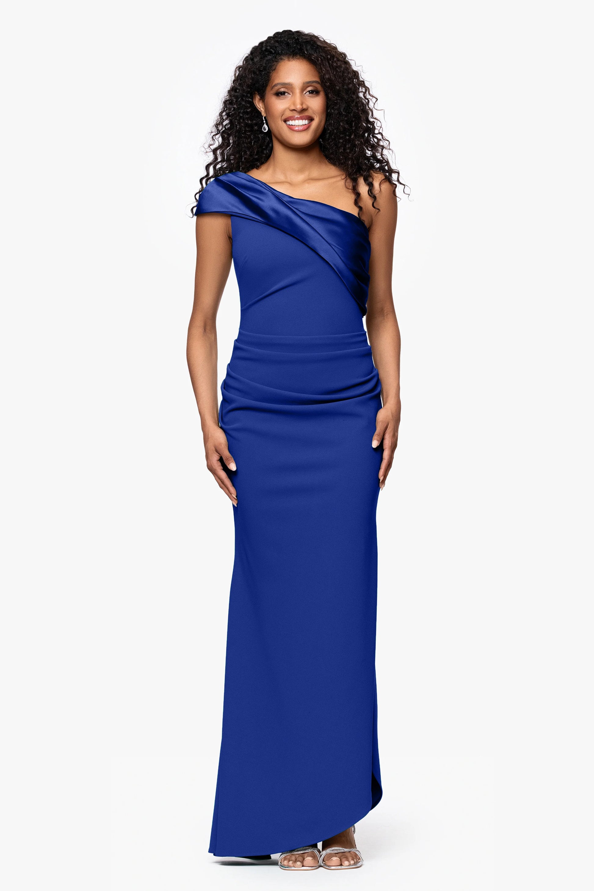 "Belinda" Scuba Crepe Drop Shoulder Satin Banded Neckline Floor Length Dress