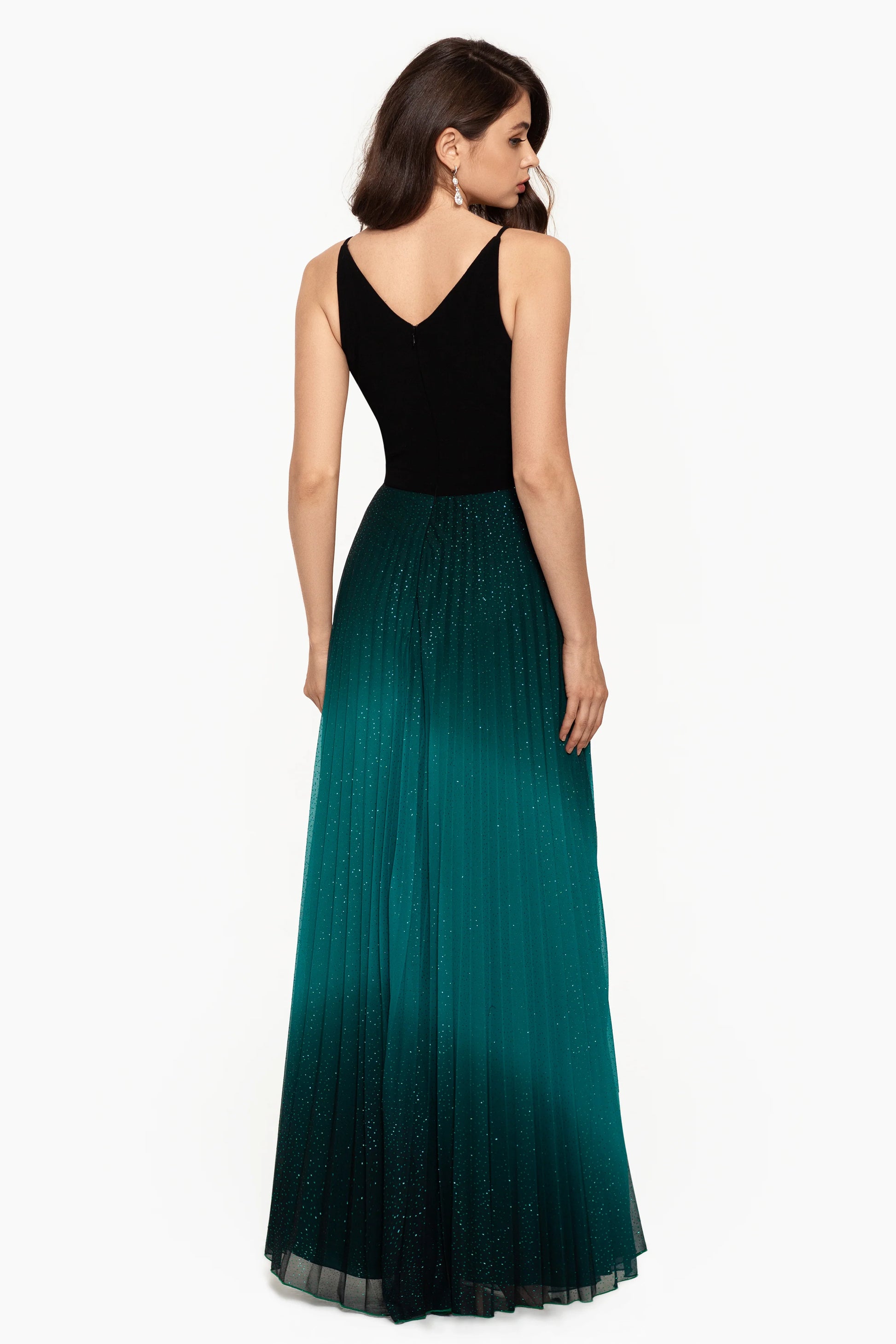 "Berkley" Long V- Neck Jersey Knit Pleated Glitter Skirt Dress