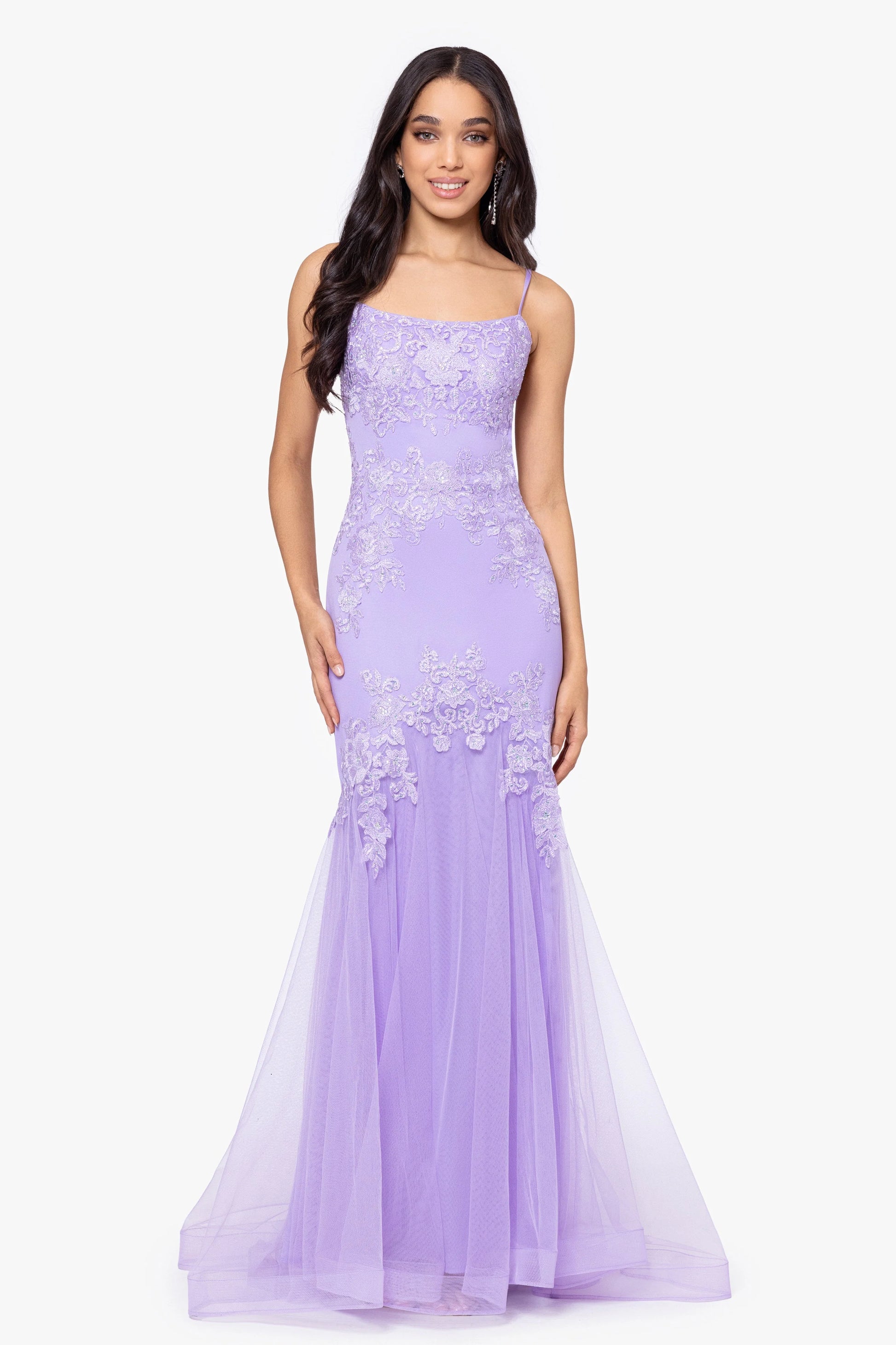 Blondie Nites "Faith" Long Slim Spaghetti Strap Mesh Applique Dress
