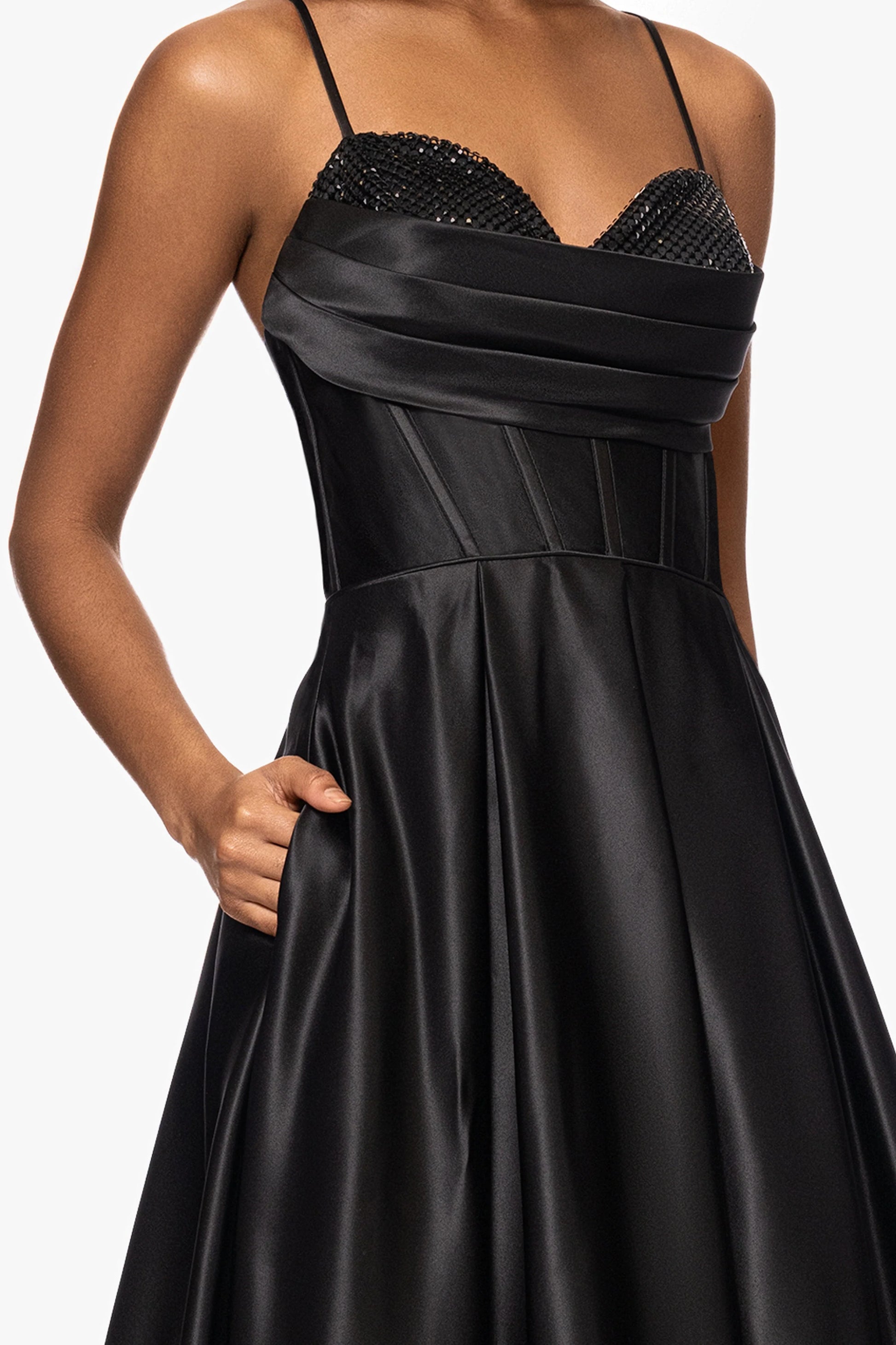 This floor-length gown features a structured bodice, shimmering sweetheart neckline, and delicate spaghetti straps for effortless elegance. With its full A-line skirt, it’s perfect for proms, weddings, or formal events. A timeless design that blends modern detailing with classic charm.