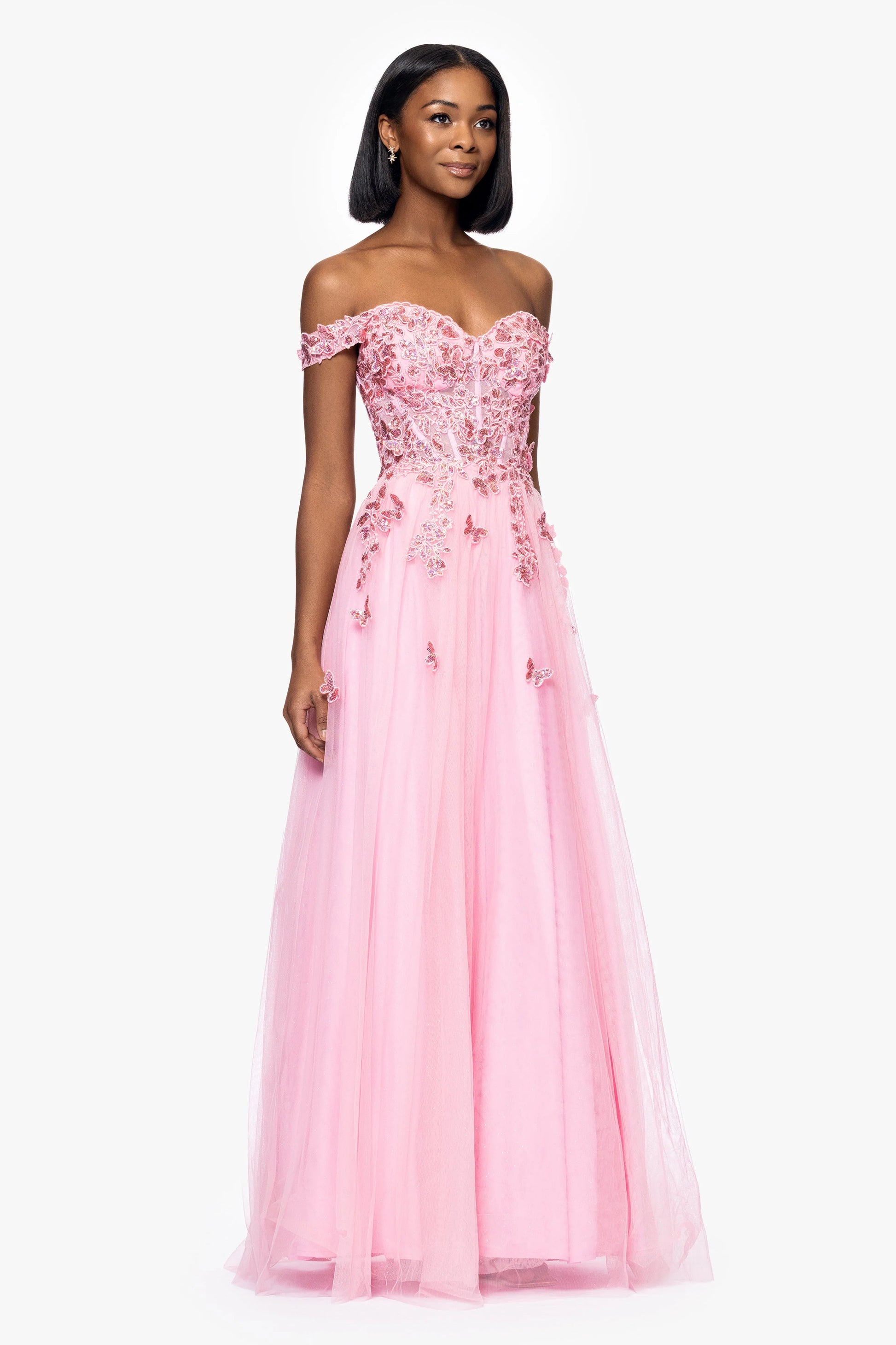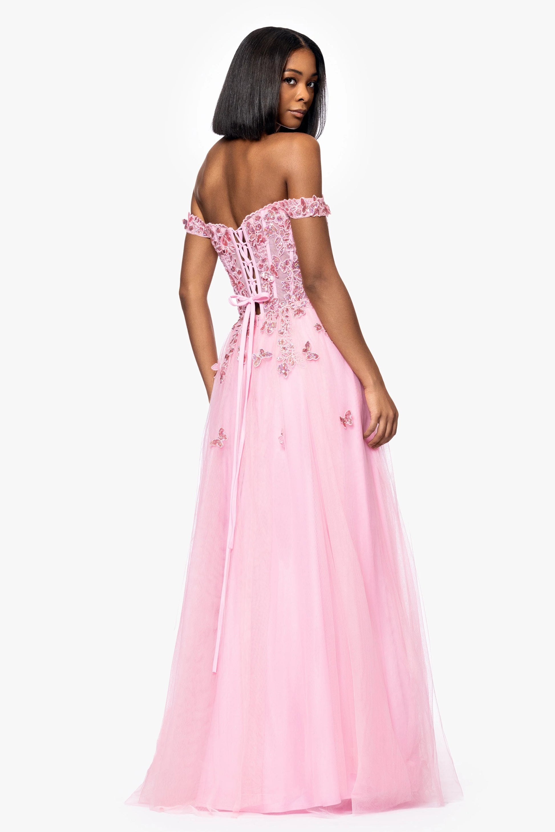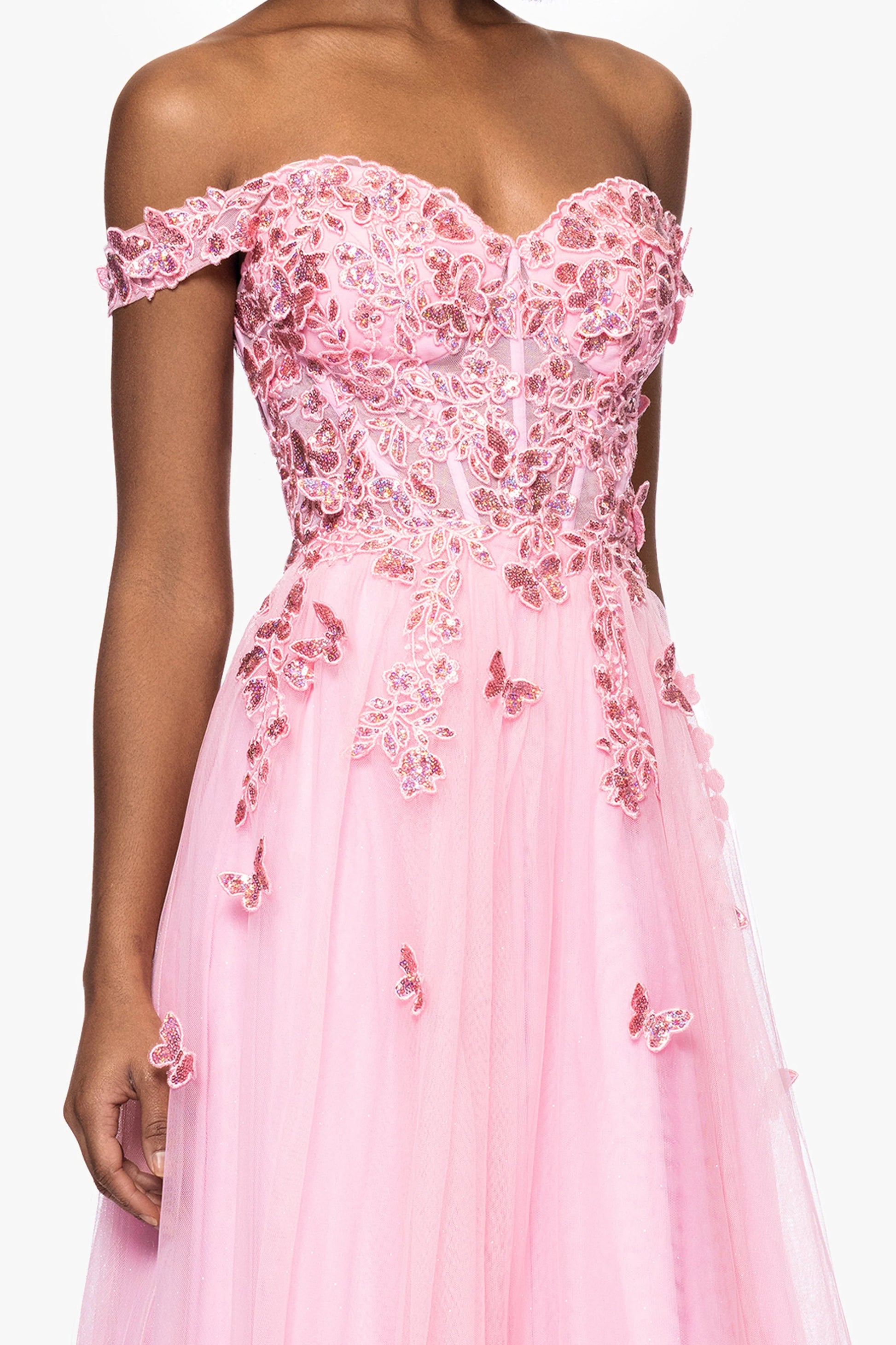 Blondie Nites "Luna" Long Off the Shoulder 3D Butterfly Embellished Gown