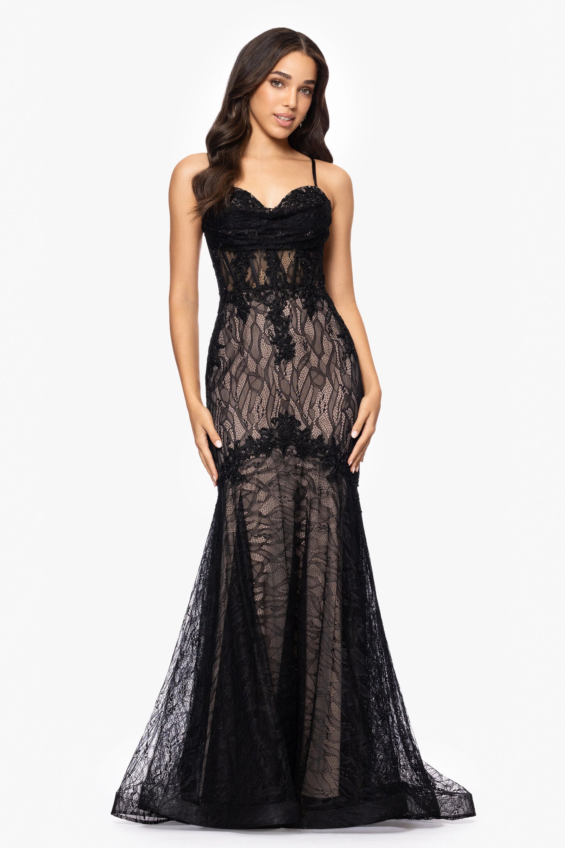 Blondie Nites "Marina" Lace Applique Floor Length Dress