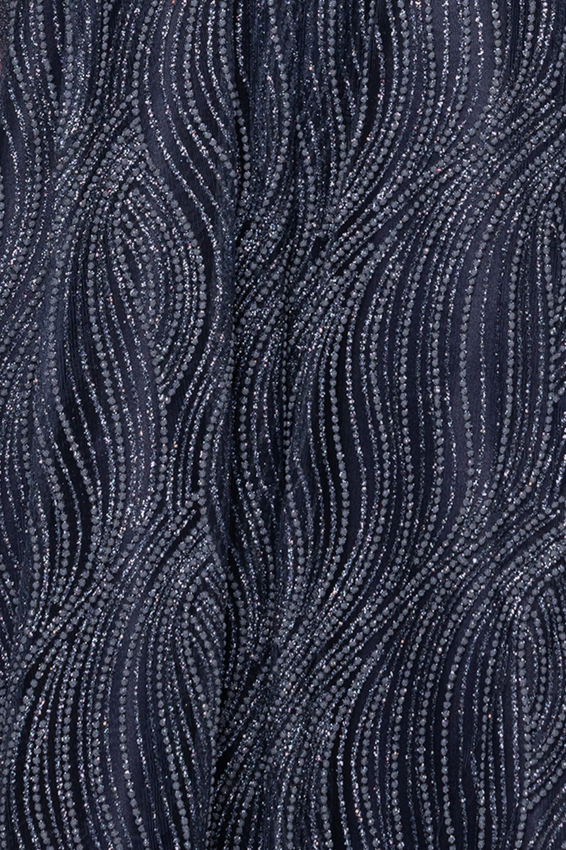 This dress features a structured bodice with delicate spaghetti straps, adorned with an intricate design that creates a flowing, wave-like effect. The soft, full skirt offers a flattering silhouette, making it ideal for formal events or evening occasions. The elegant details shine in this timeless piece.