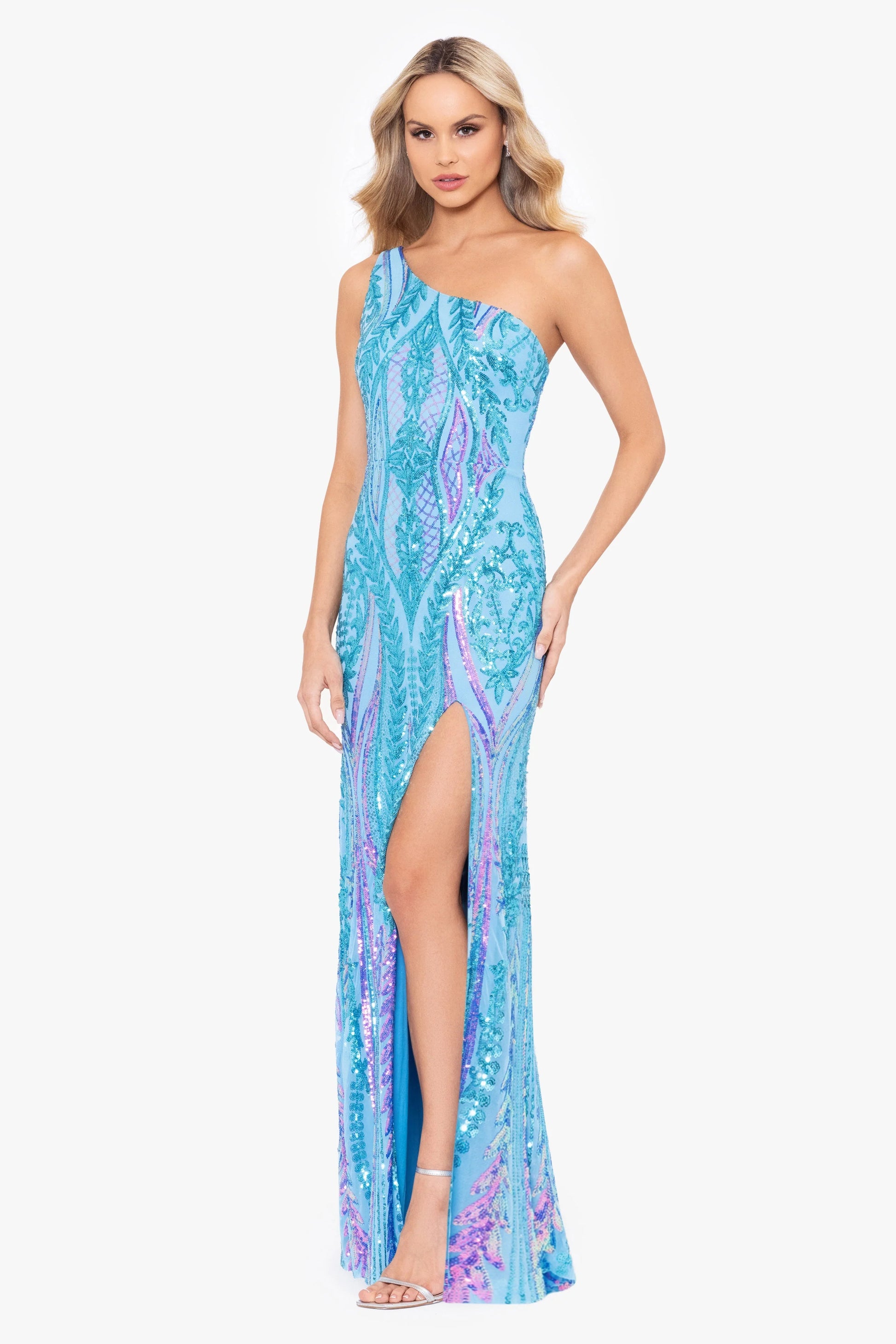 Blondie Nites "Terri" Long Placement Sequin One Shoulder Dress