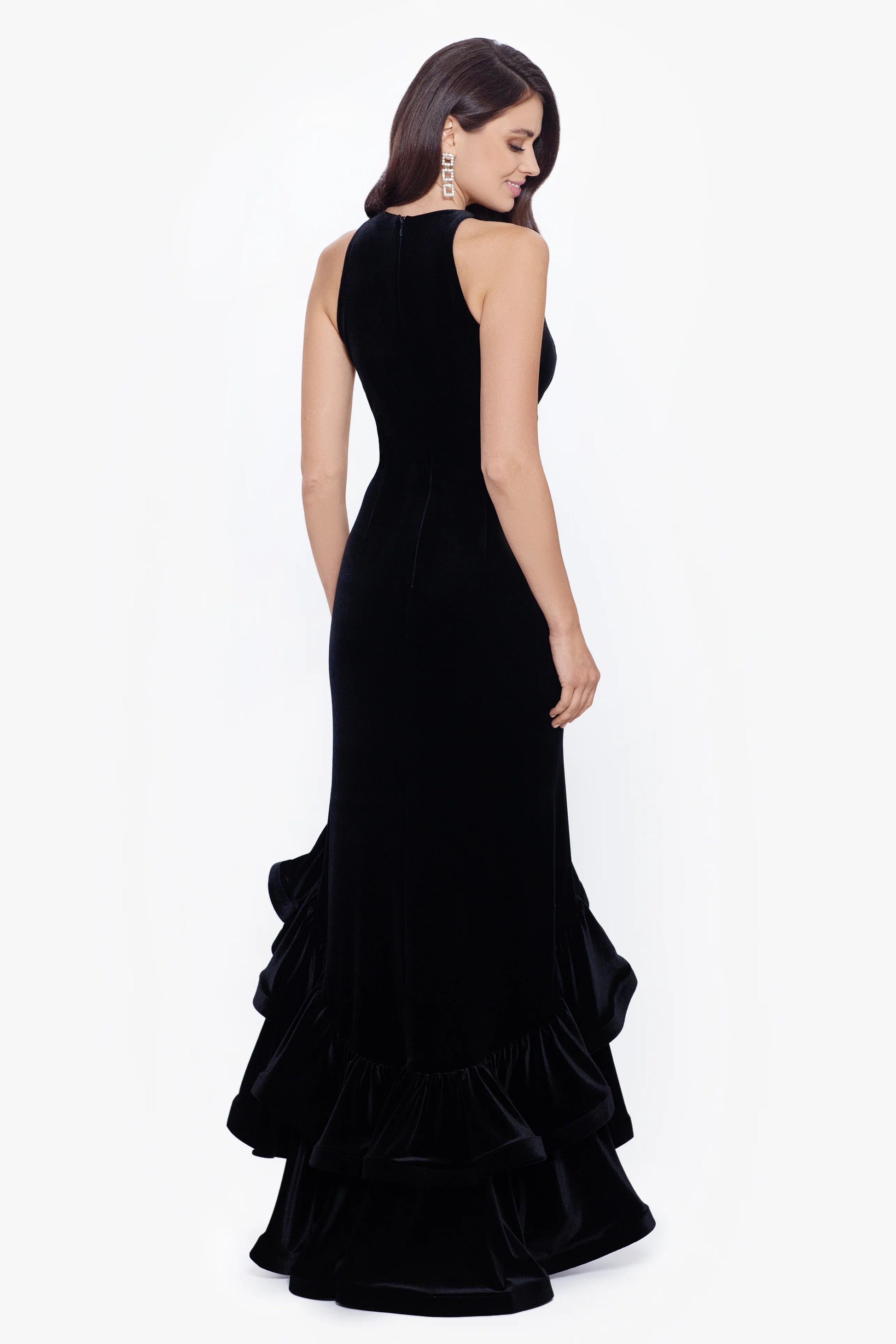 Dance the night away in the "Brandi" Ruffle Tier Velvet Dress. Made with luxurious velvet and fully lined, this dress features a hidden back zipper and a scoop neck. The long, flowy design and ruffle bottom add a touch of whimsy and charm. Perfect for any special occasion!