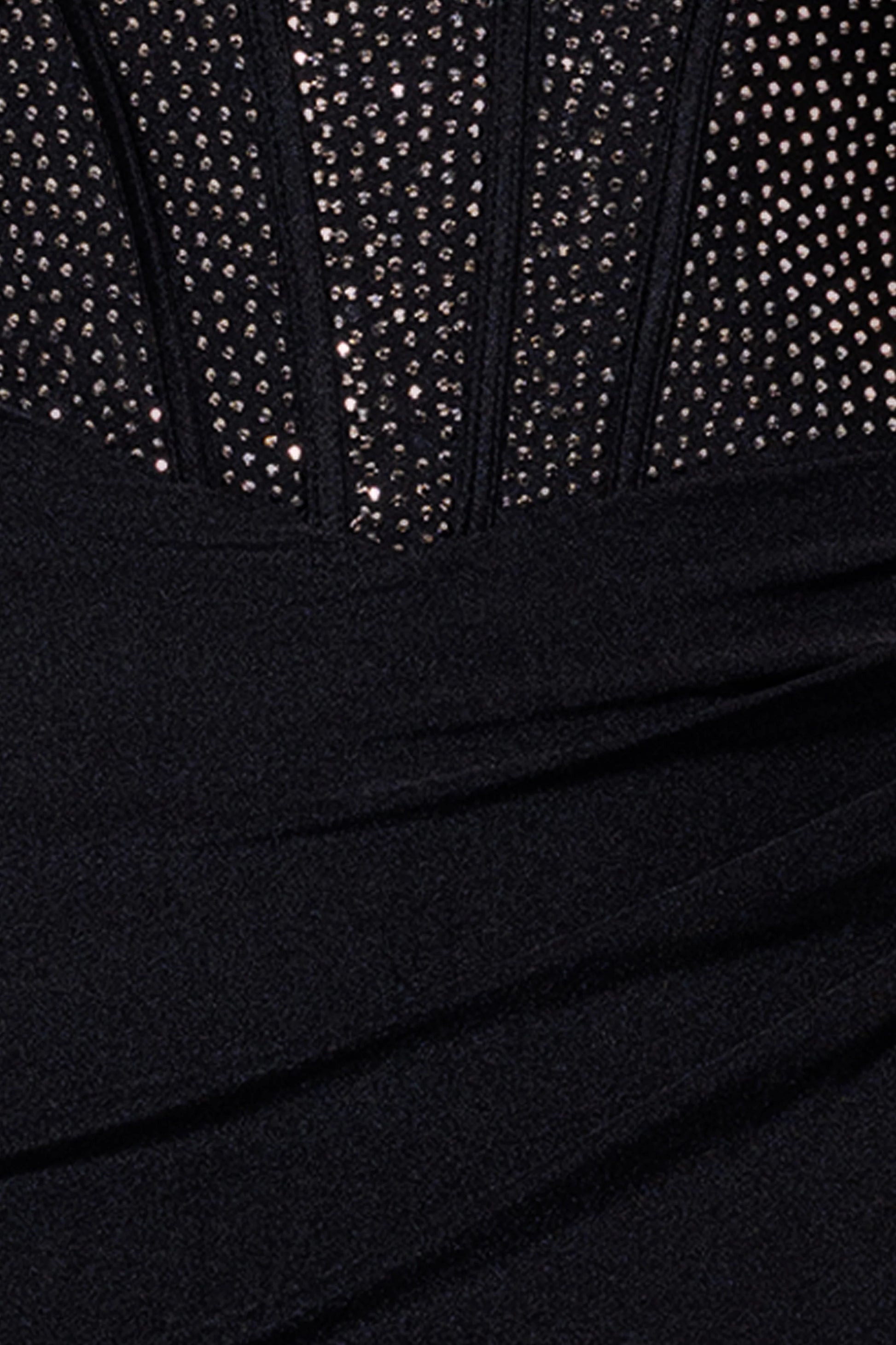 This elegant evening gown features a dazzling corset-style bodice embellished with shimmering details, offering a sophisticated and refined look. Its fitted silhouette flows into a gracefully draped skirt, creating a flattering and timeless design. Perfect for formal events, the dress combines glamour and elegance effortlessly.