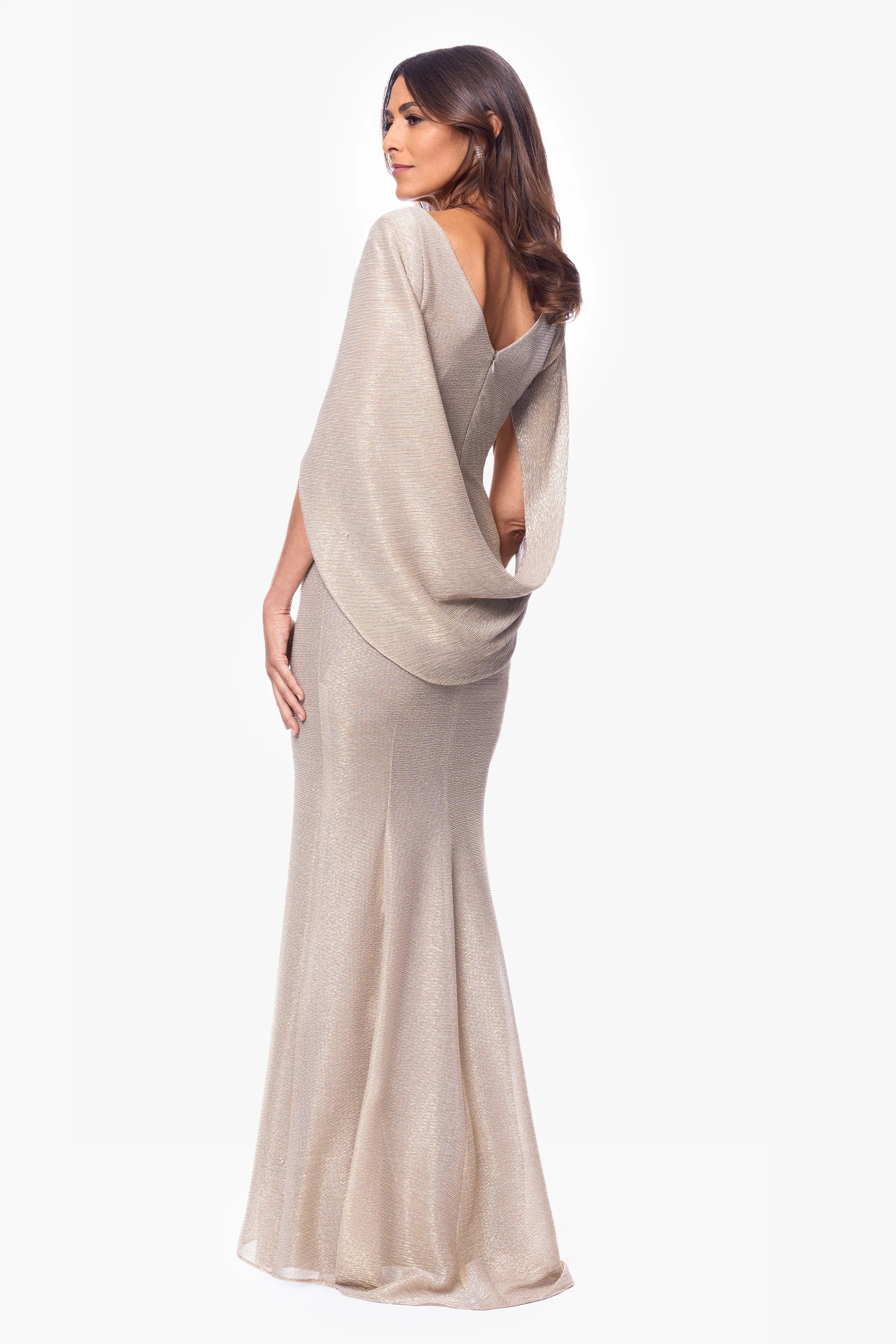 Ignite your daring spirit in the "Celine" Boat Neck Crinkle Gown. The metallic crinkle knit and fully lined design provide an alluring texture, while the boat neckline and draped sleeves exude confidence. With a hidden back zipper for a sleek finish, this straight fit gown is a beautiful and flattering choice for any occasion.