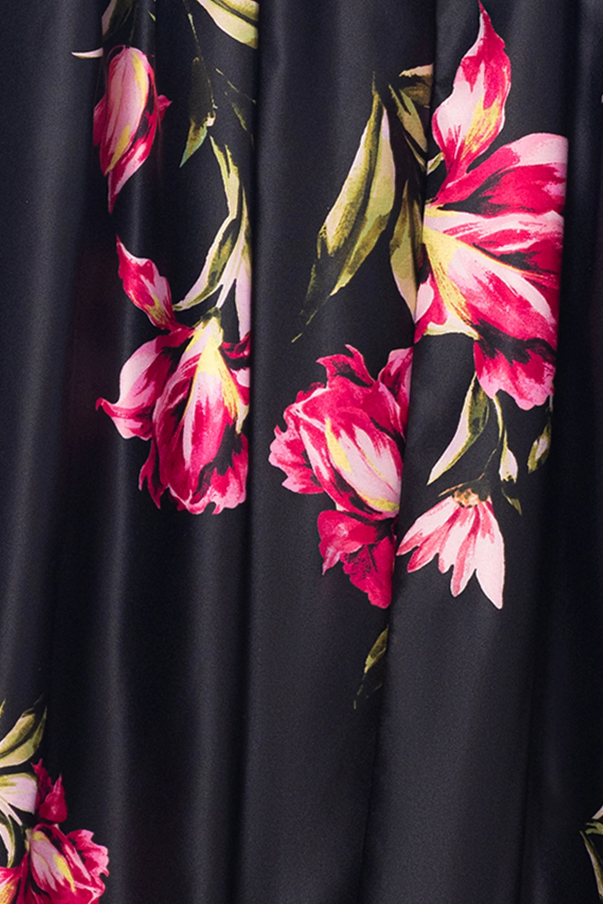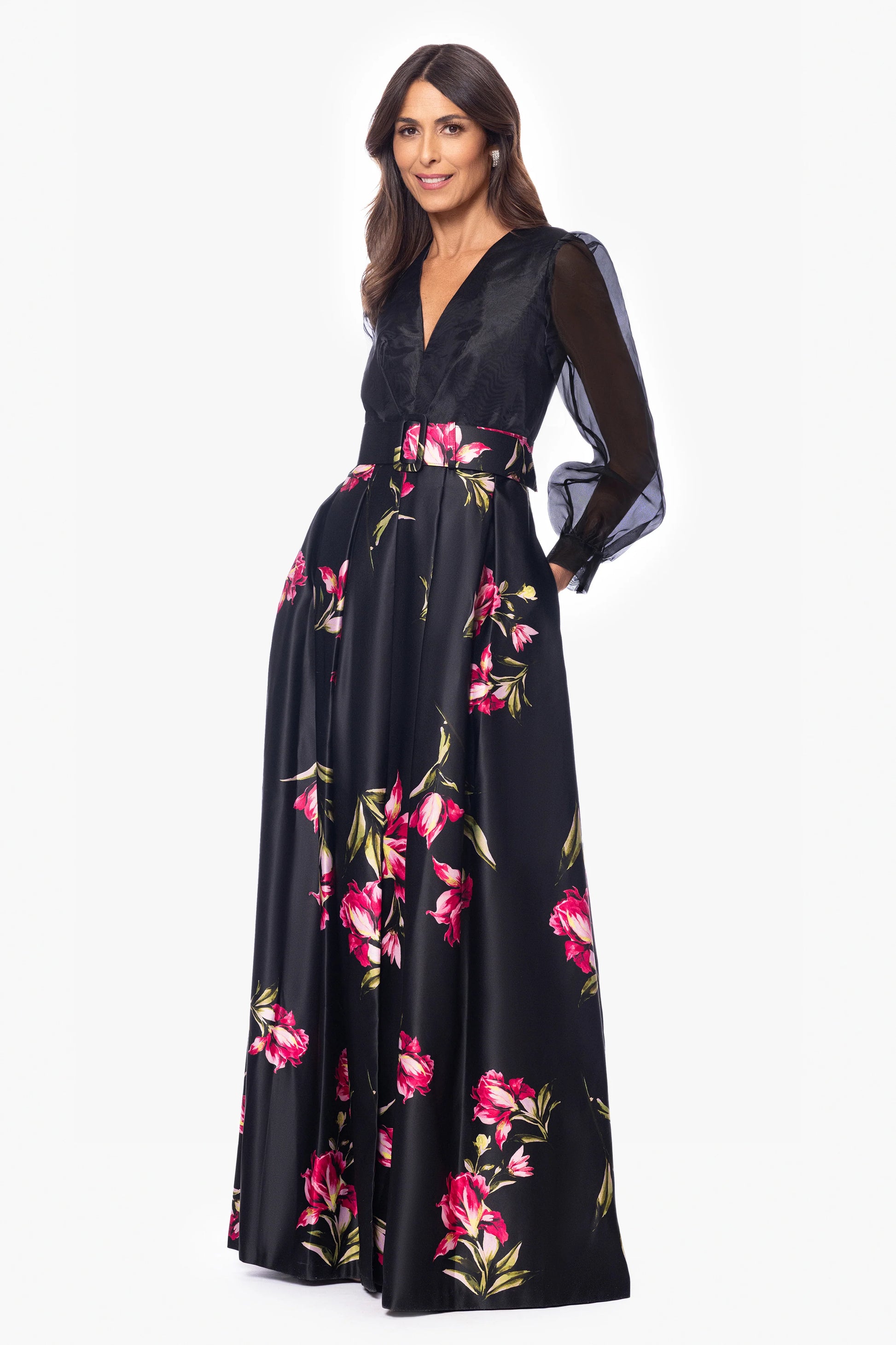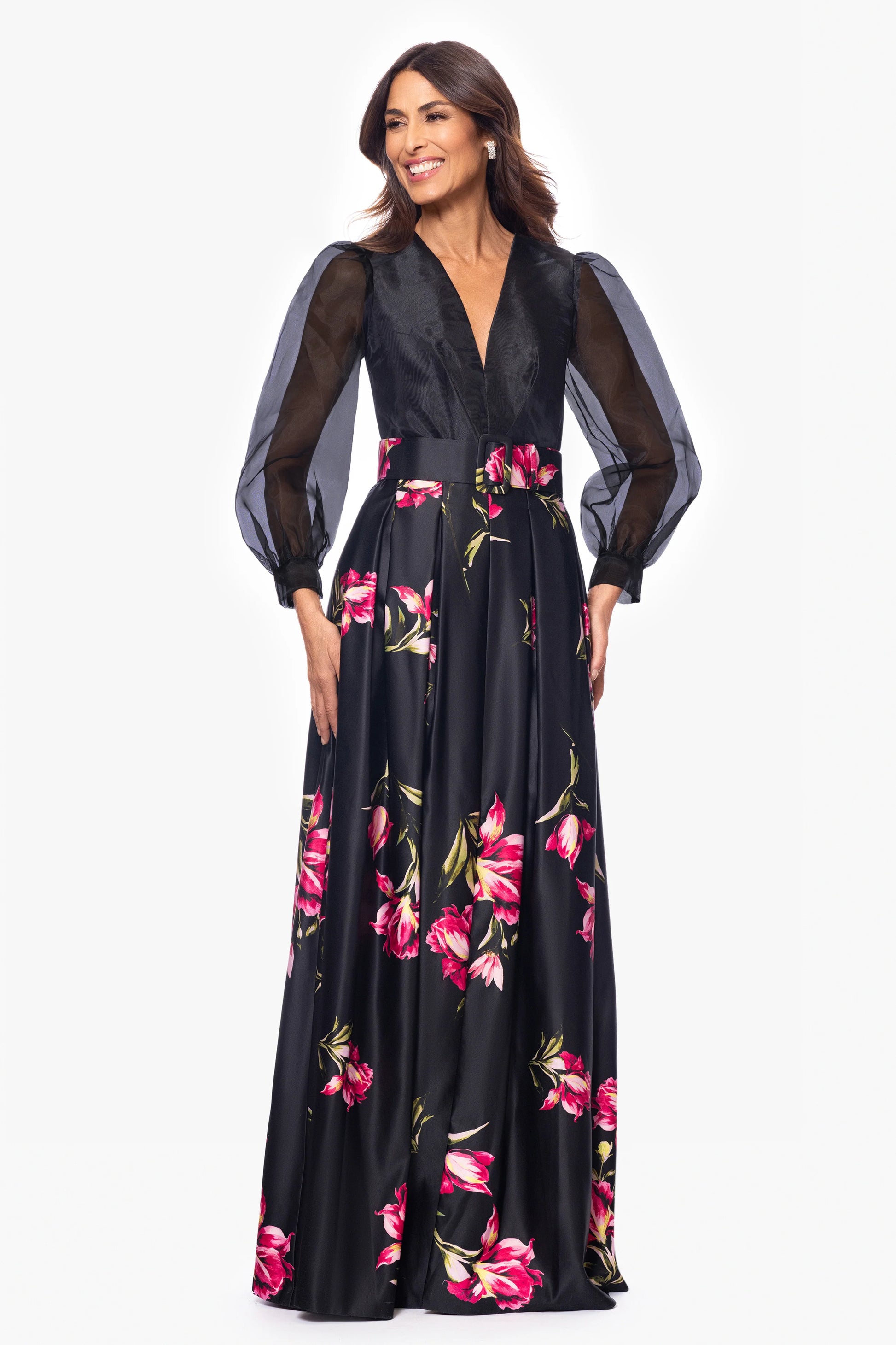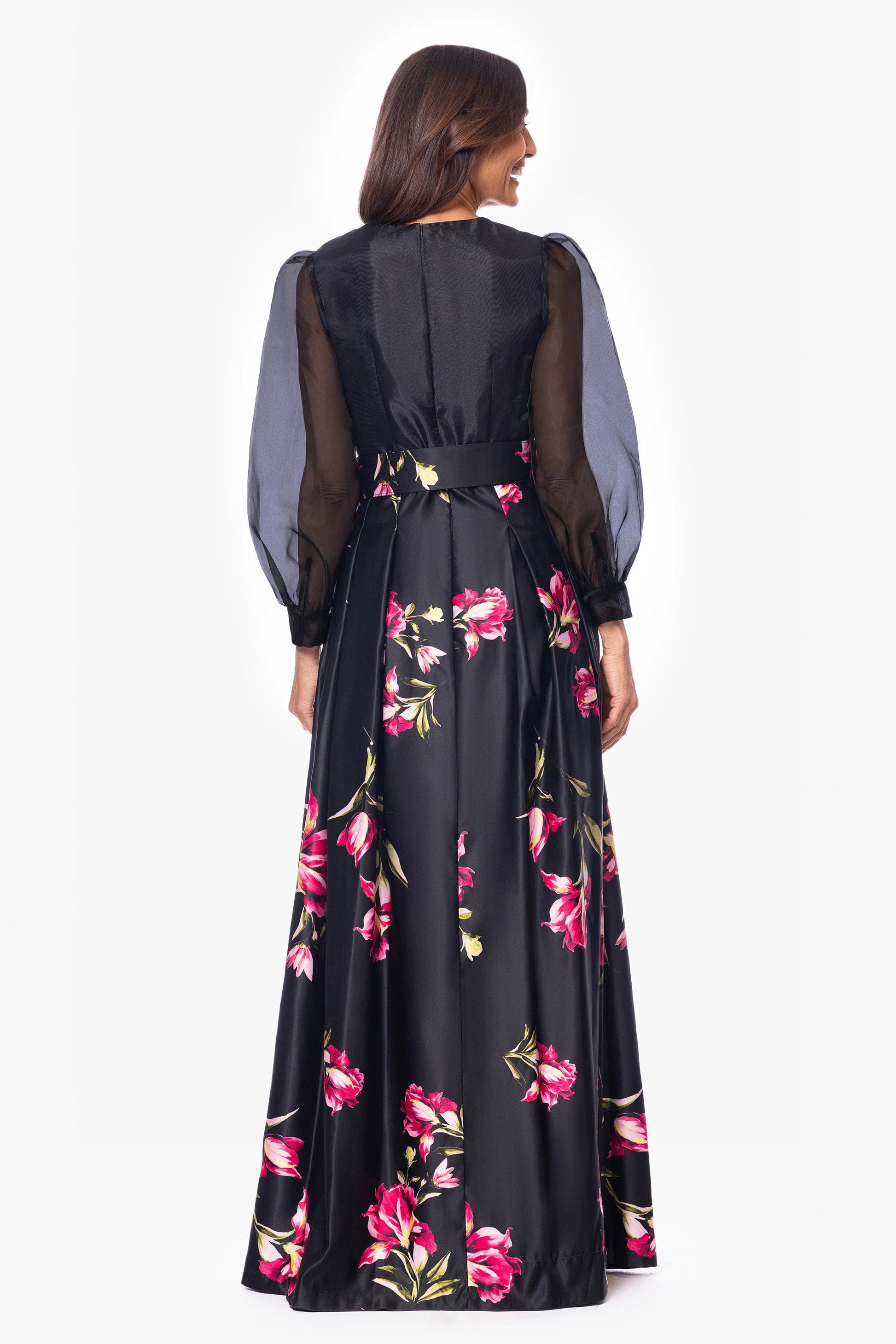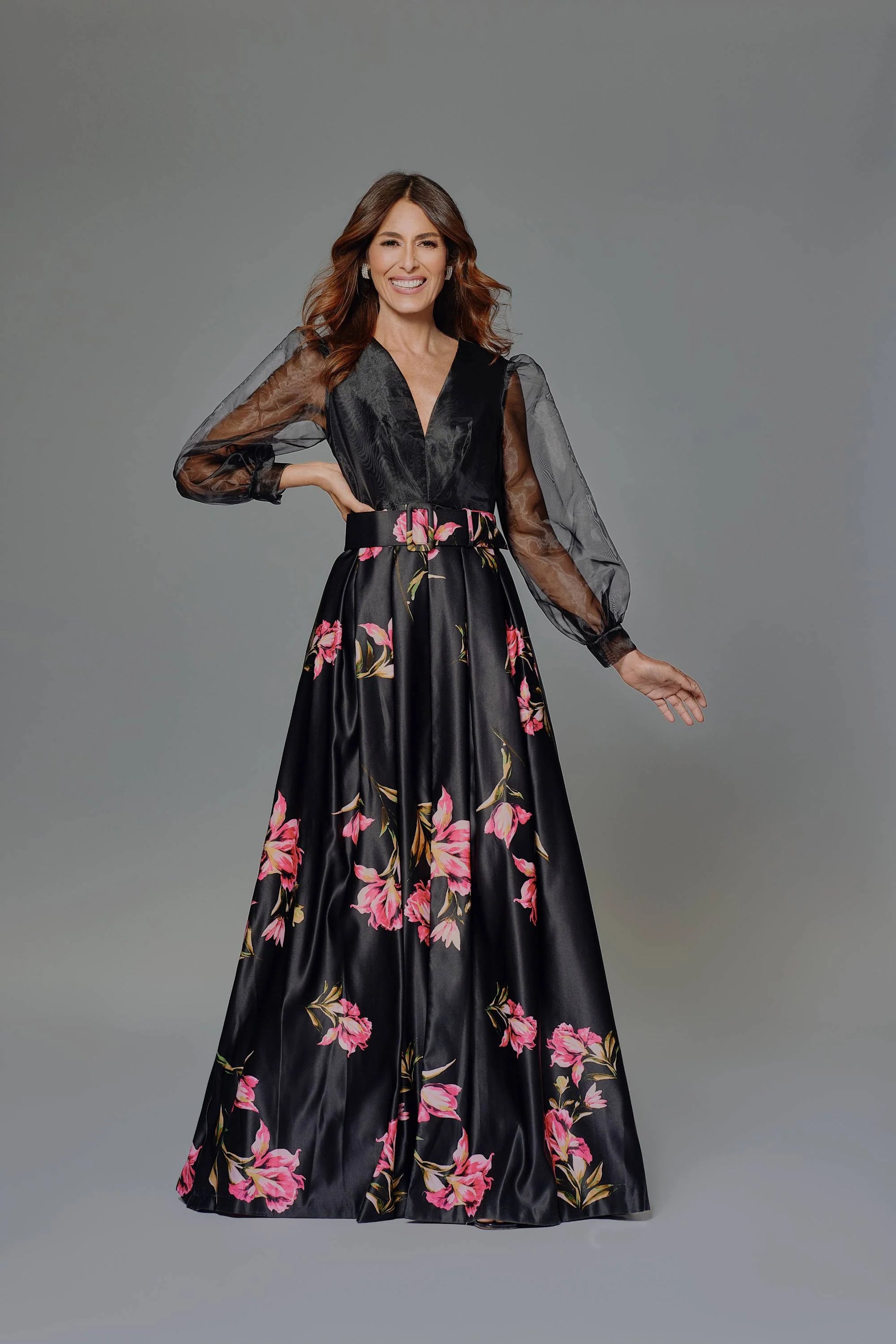 This elegant gown combines modern and classic elements. The deep V-neckline and sheer puffed sleeves add a sophisticated touch to the fitted bodice, while the full satin skirt, adorned with vibrant floral prints, brings a bold, feminine flair. Perfect for galas, weddings, or any formal occasion where you want to make a statement.