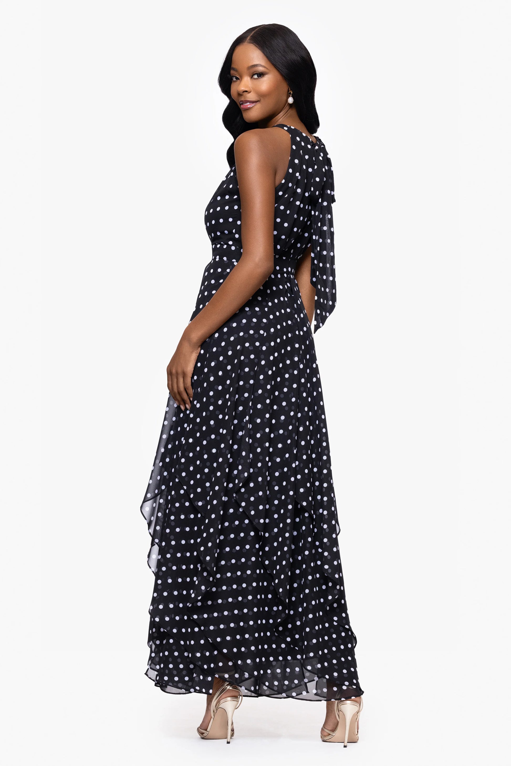 Playful yet polished, this polka dot chiffon gown features a high neckline, a flattering cinched waist, and a layered handkerchief hem that adds soft movement with every step—perfect for brunches, garden parties, and everything in between.