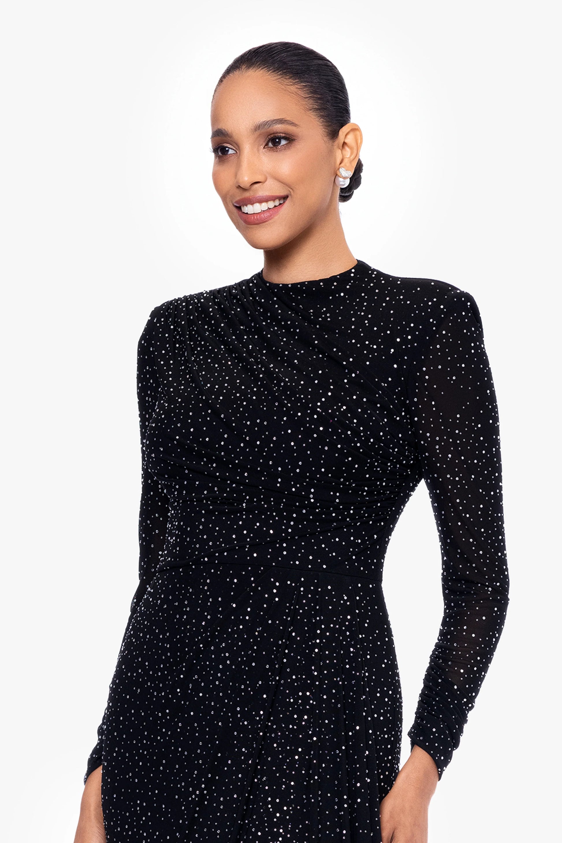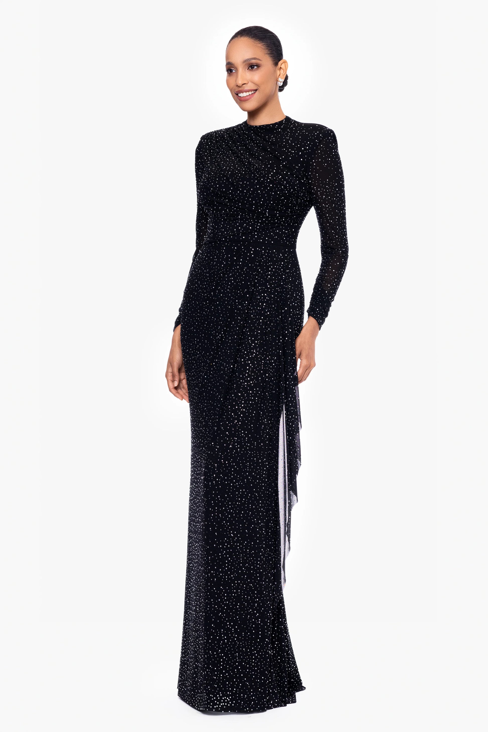 - Details: Long Sleeves, Beaded Details, Side Ruffle