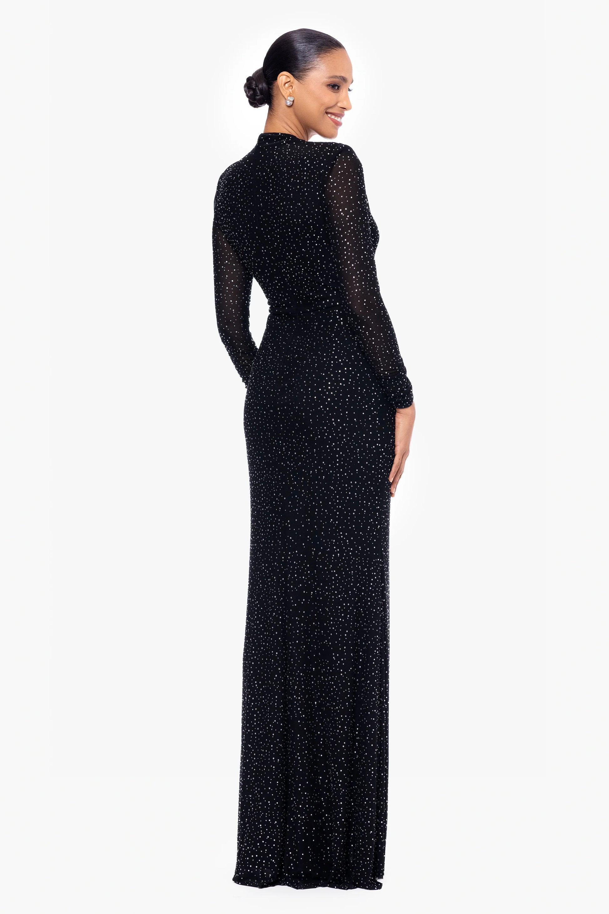 This stunning evening gown features a floor-length design adorned with shimmering details, creating a dazzling effect. The high neckline and long, sheer sleeves add an element of sophistication and elegance. The dress is tailored to hug the body's curves, offering a flattering and feminine silhouette. Perfect for upscale events and formal occasions, this gown ensures you'll stand out in a crowd. Its timeless style and luxurious feel make it a must-have for any special event.