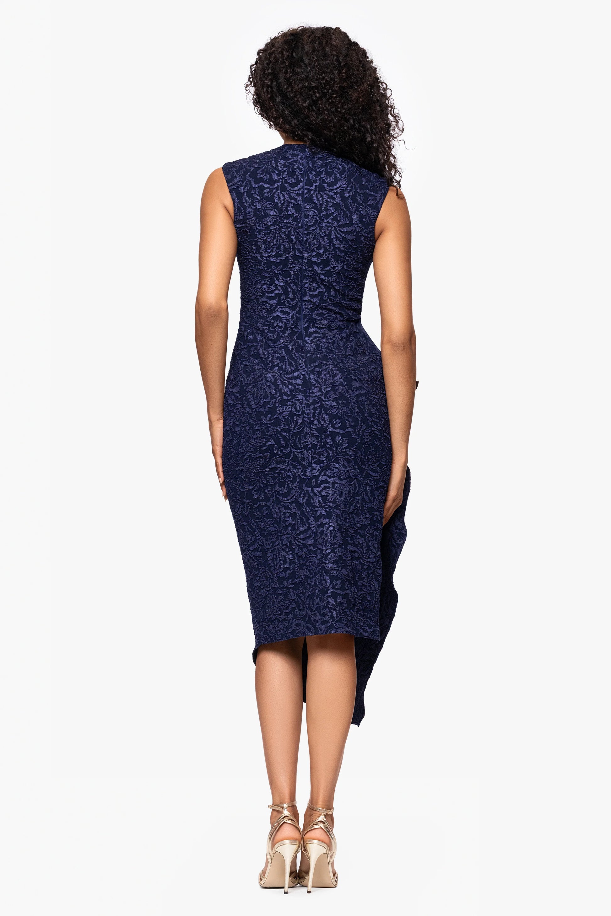 Elegant jacquard cocktail dress featuring a flattering square neckline, sculpted bodice, and asymmetrical draped skirt with peplum detail. Ideal for weddings, formal events, or evening parties. Designed to enhance curves and offer timeless sophistication.