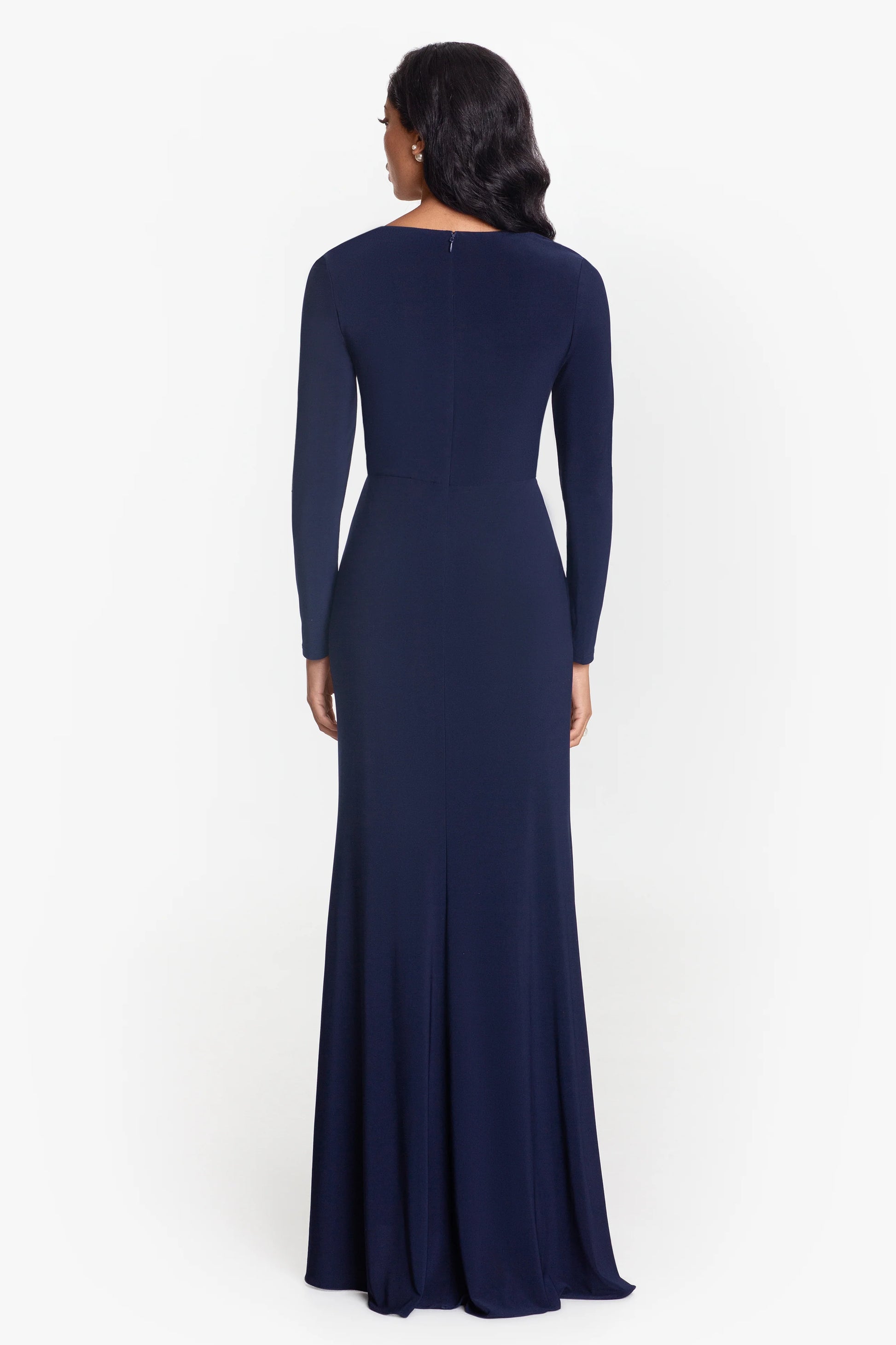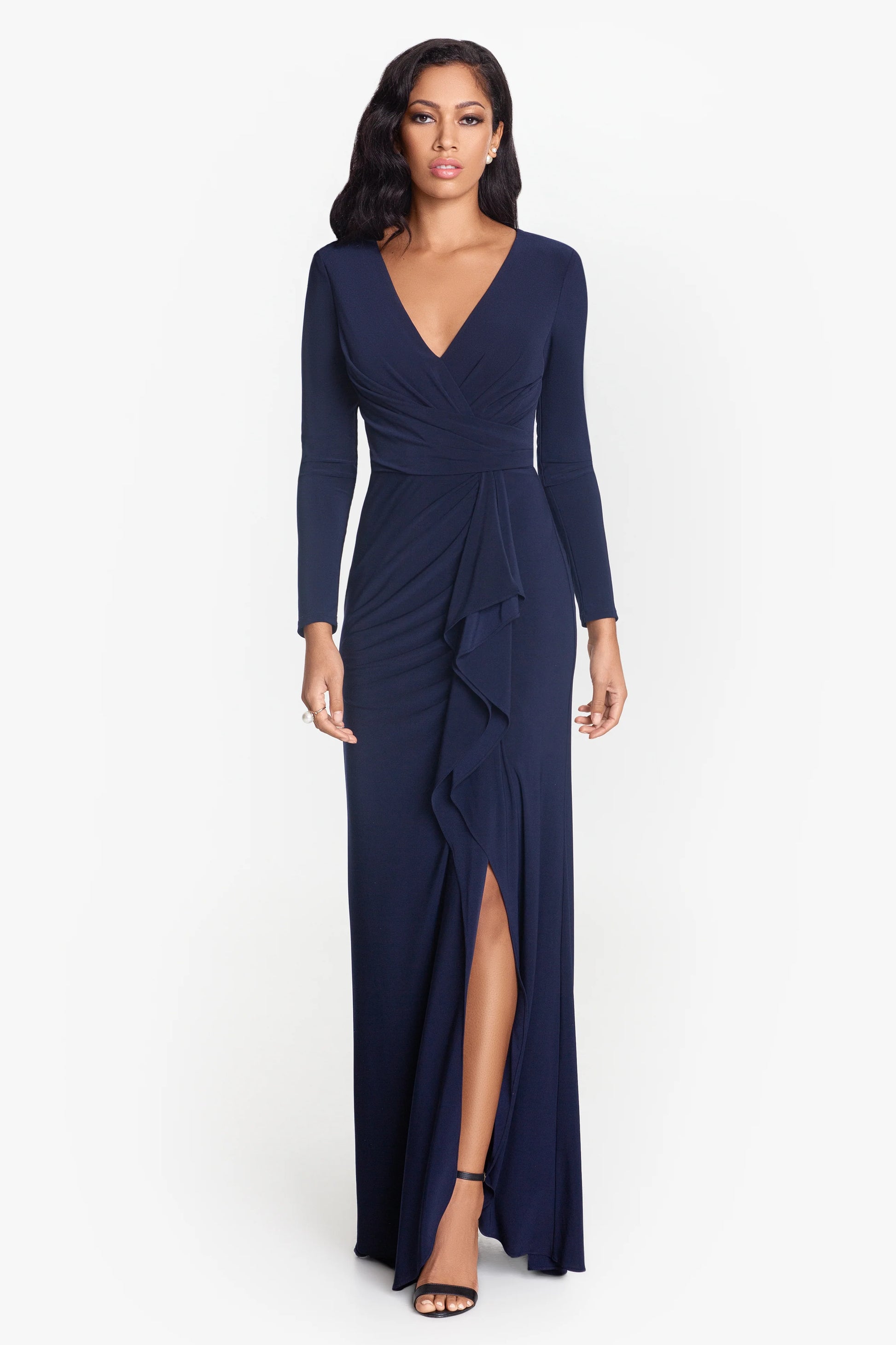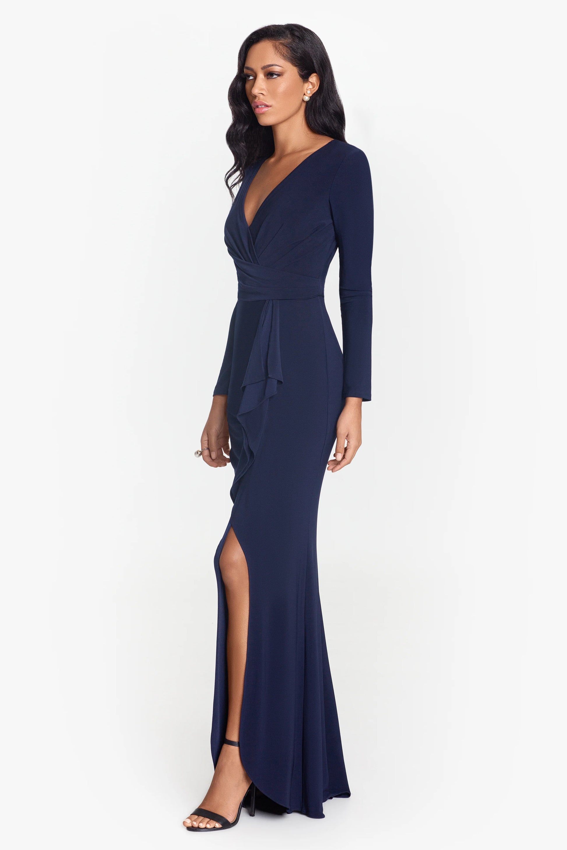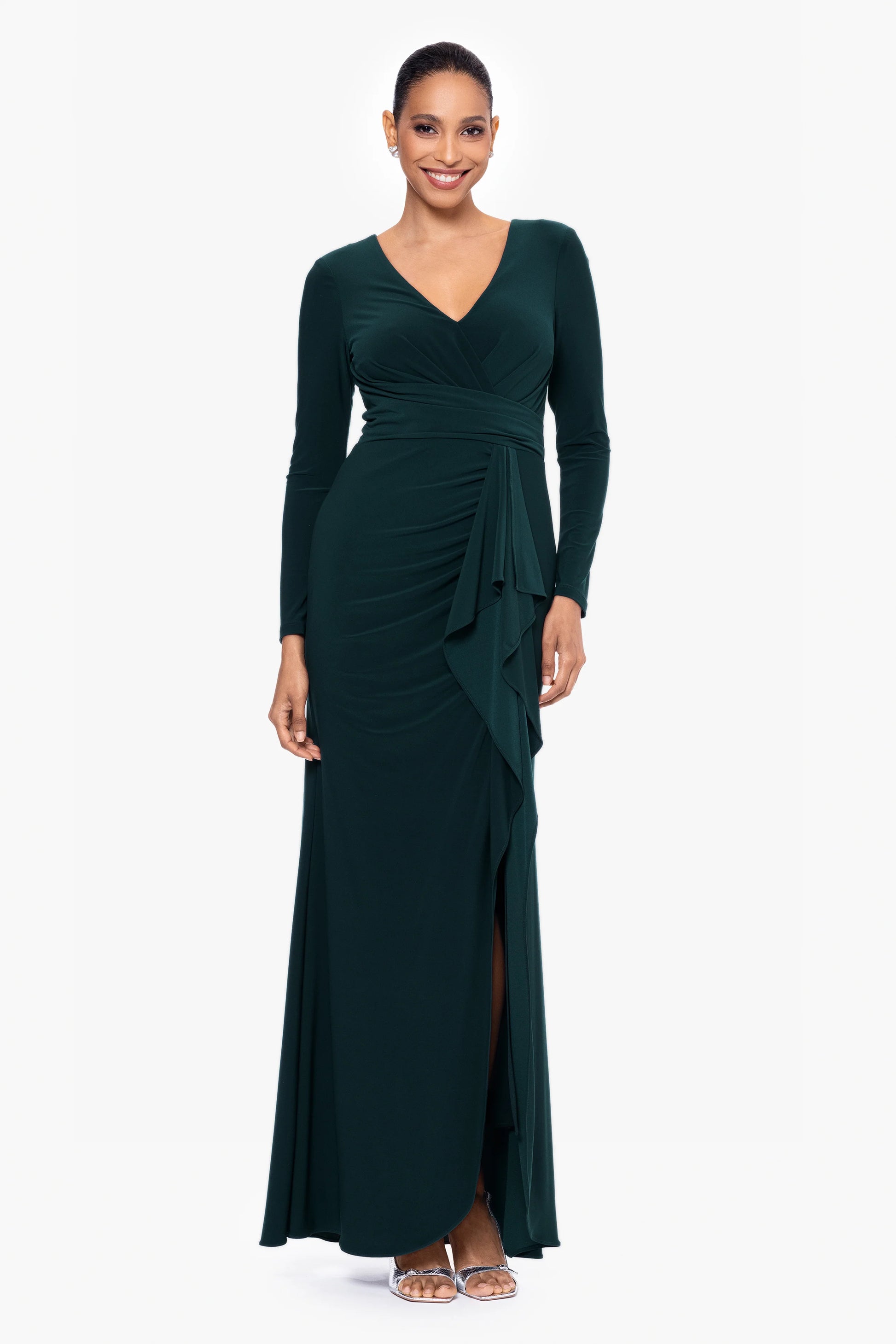 "Elle" Long Sleeve Side Ruffled Slit Gown