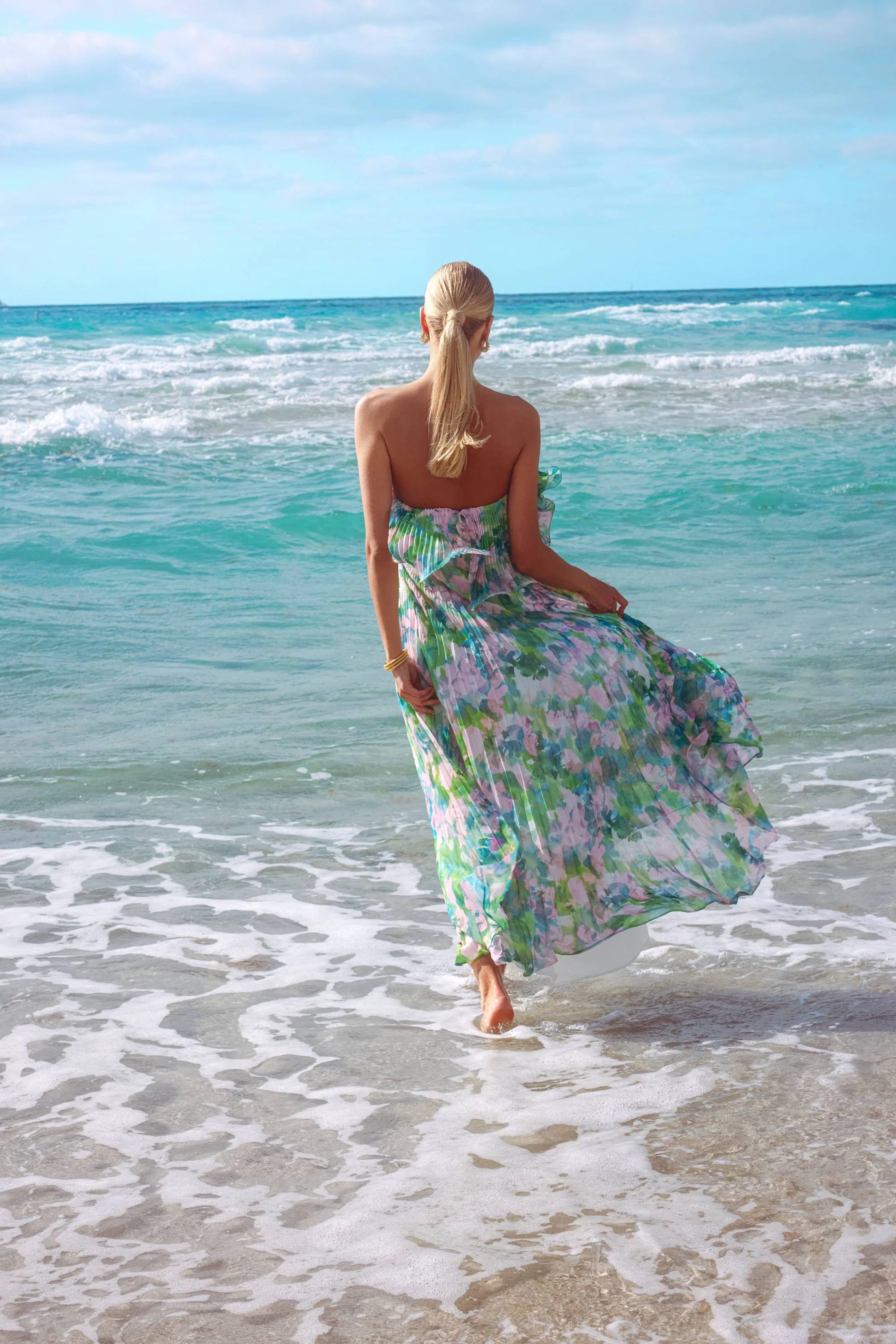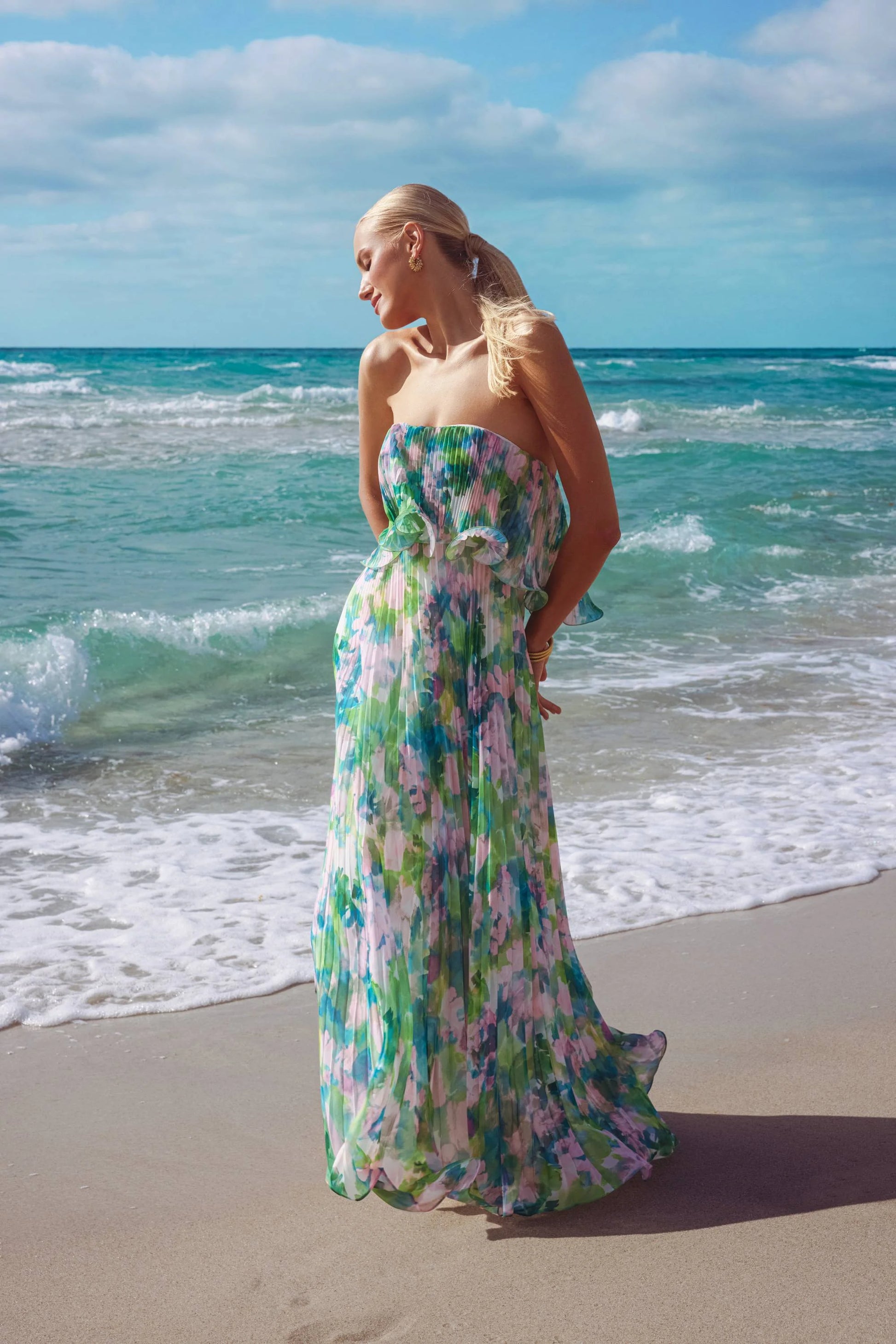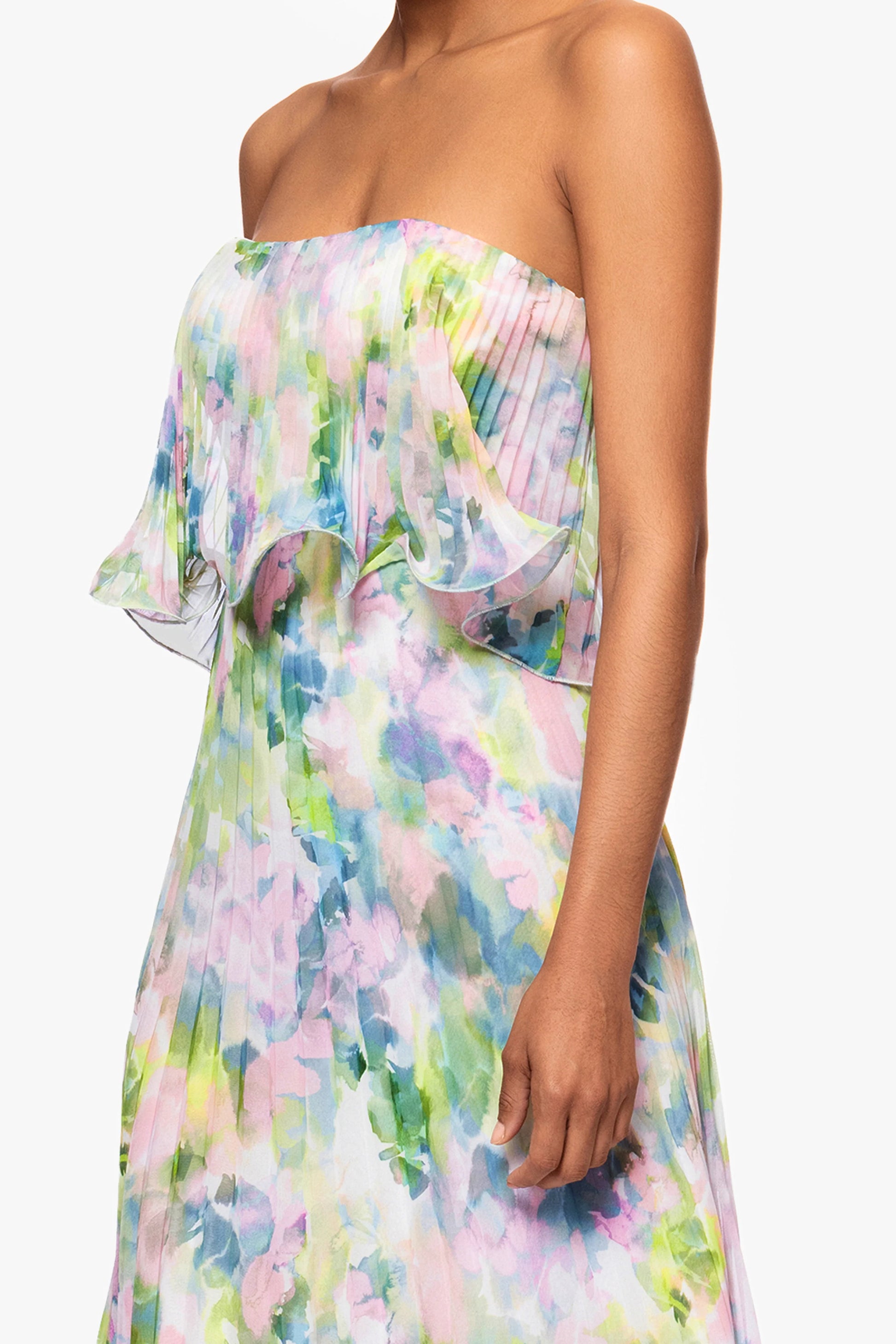 "Enid" Strapless Print Chiffon Pleated Floor Length Dress