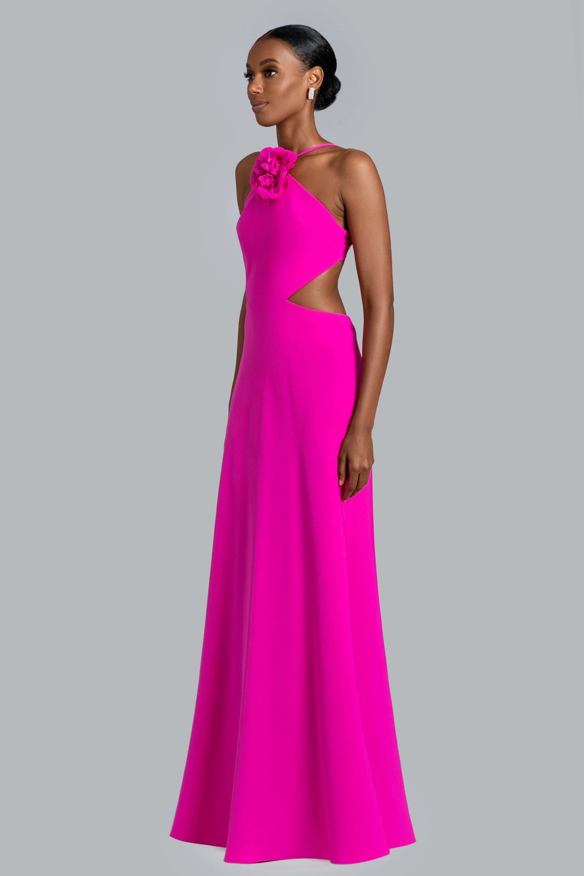 Stand out in the crowd with the "Aria" Crepe Gown. Made of luxurious crepe fabric, this gown boasts a modern silhouette and trendy flower trim in a vibrant fuchsia color. Elevate your style to the next level with this elegant and exclusive piece.