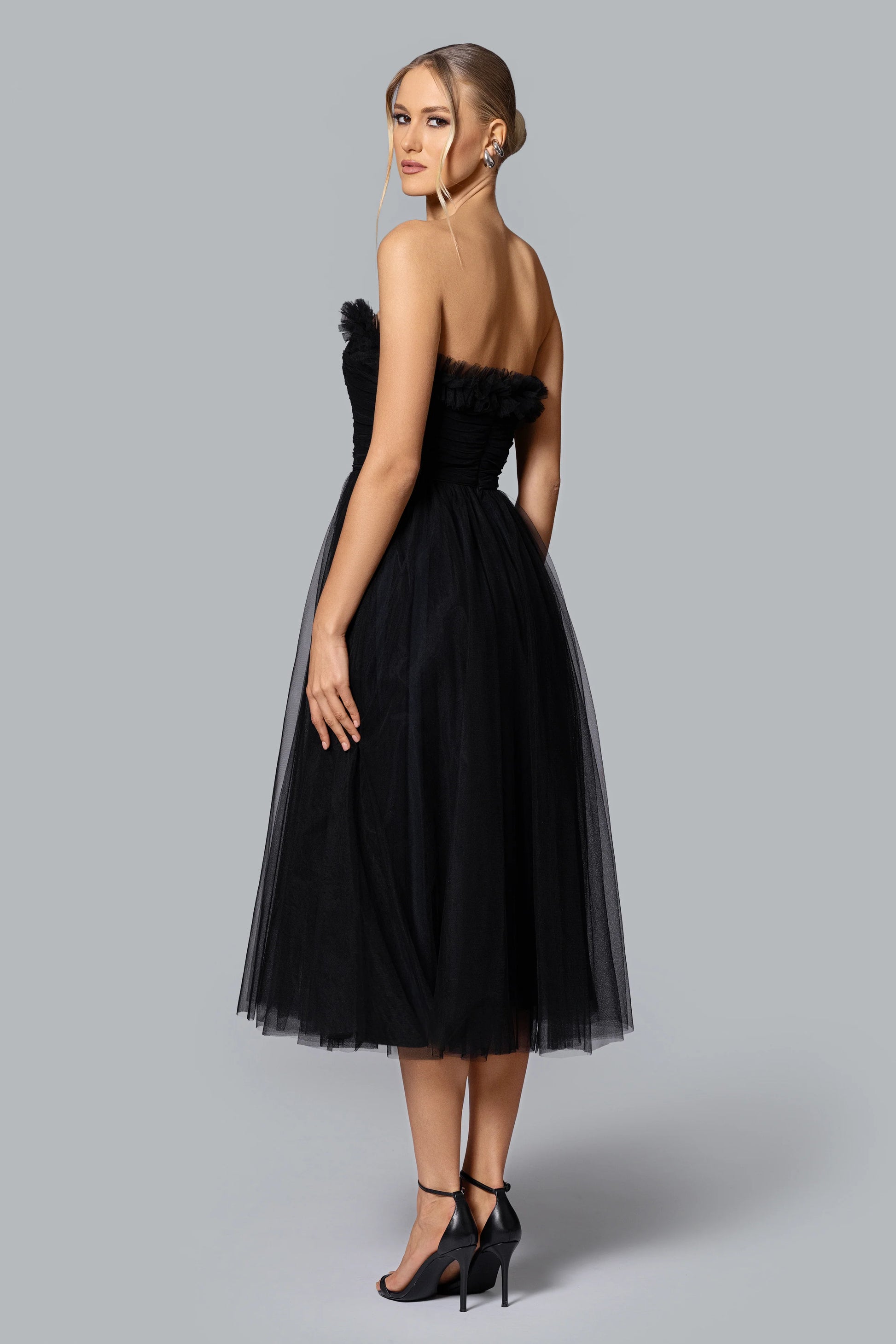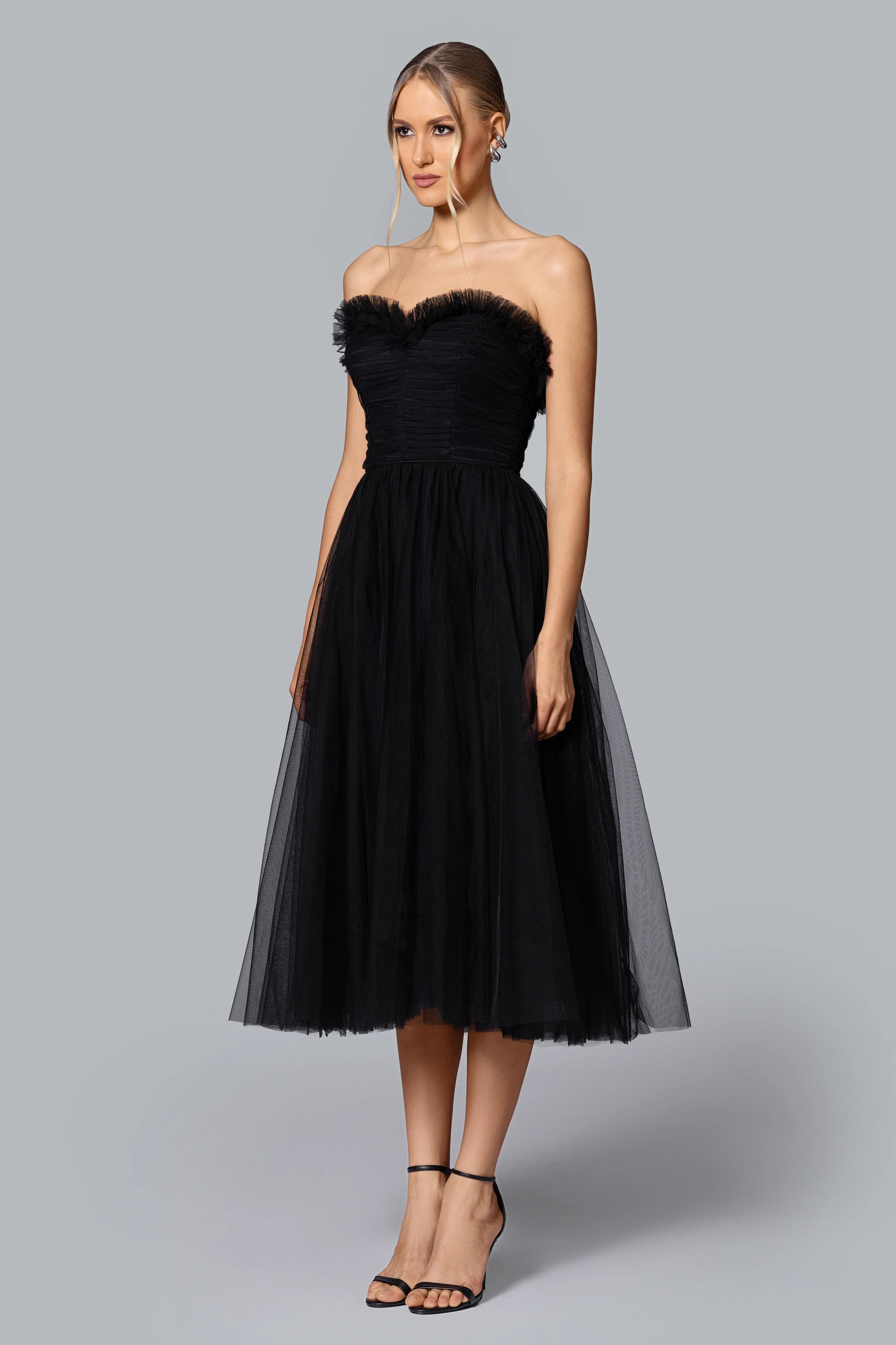 The Brielle dress is a strapless midi gown with a ruched bodice and a ruffled neckline, offering timeless elegance. Its full tulle skirt adds a romantic touch, perfect for weddings and special occasions.