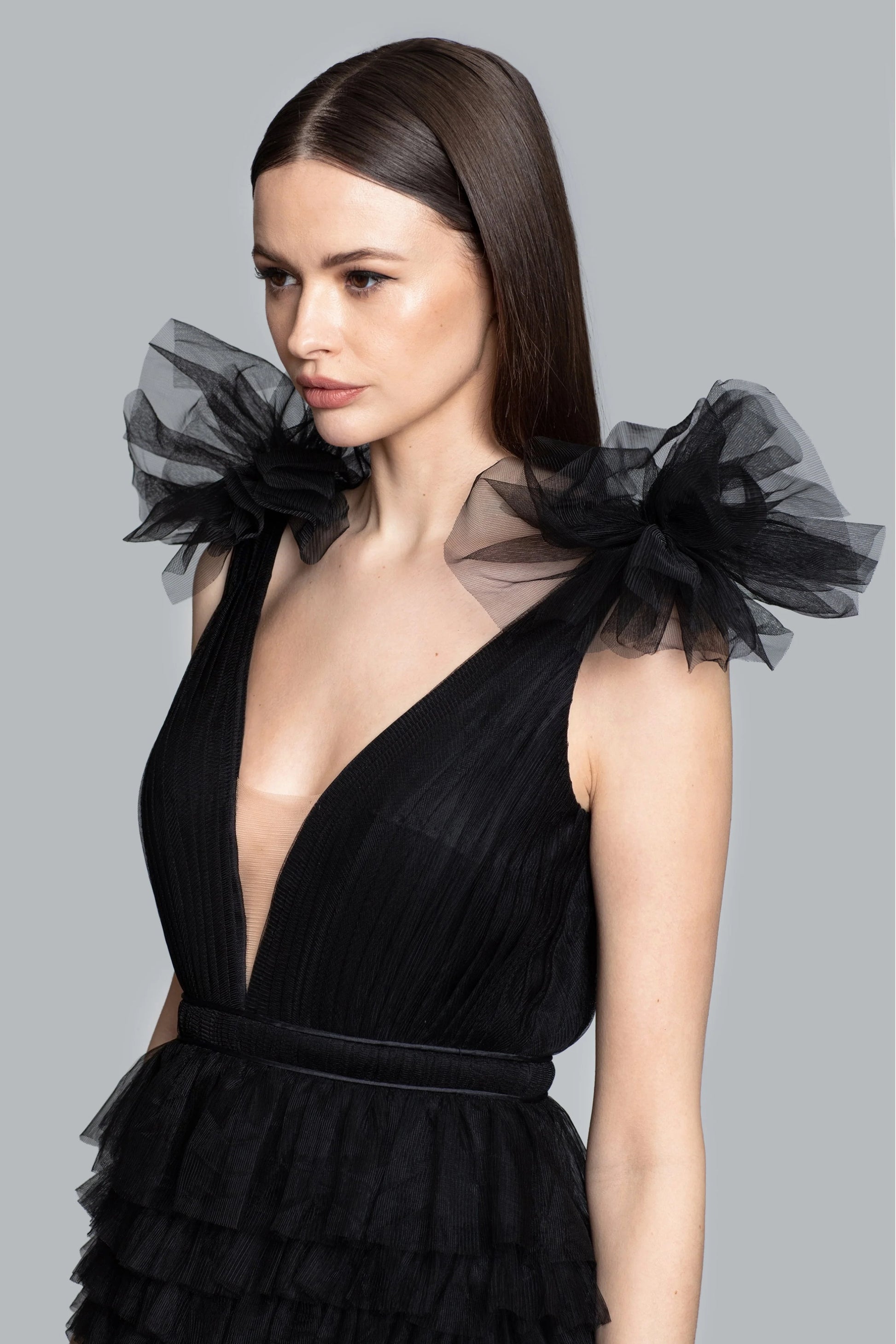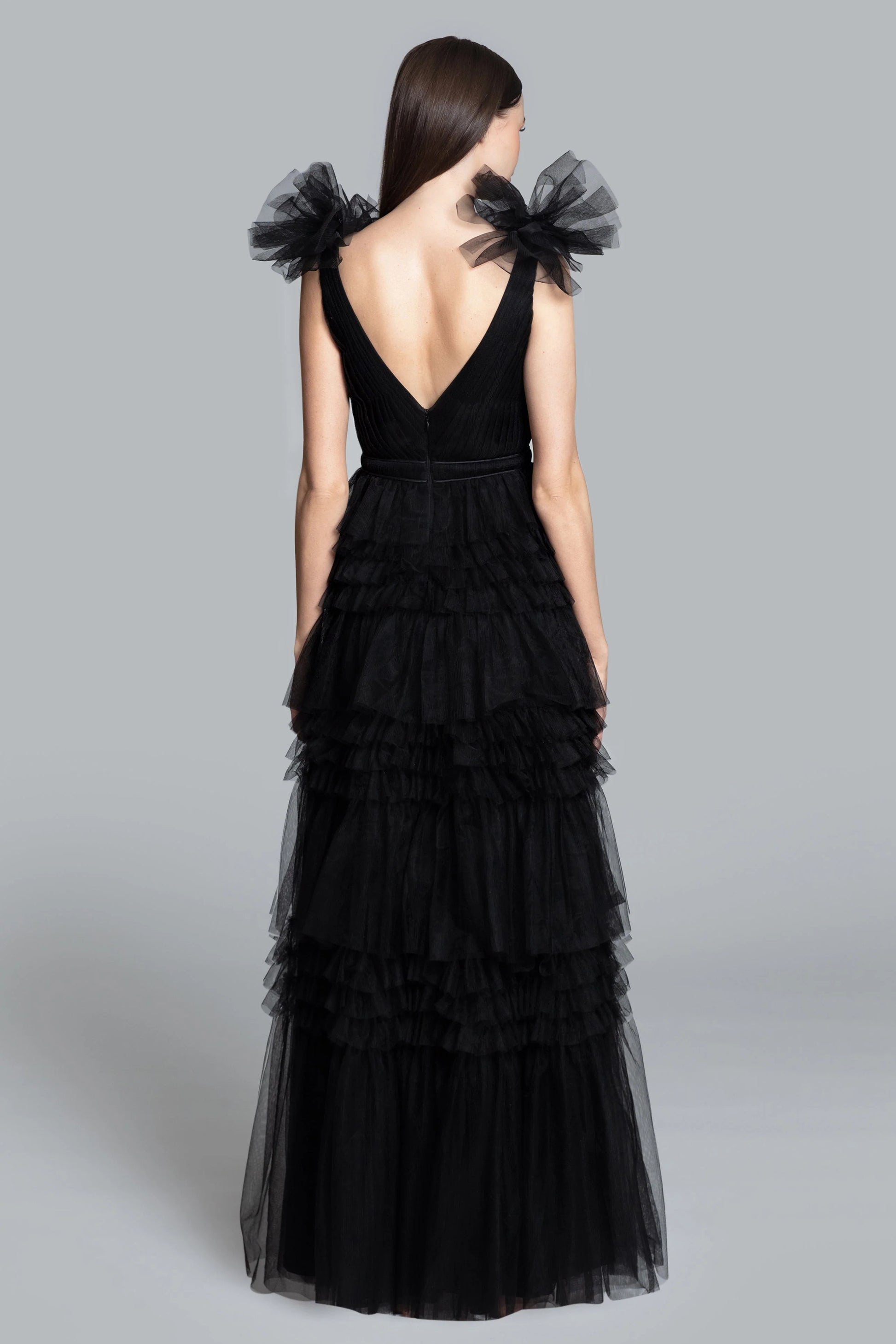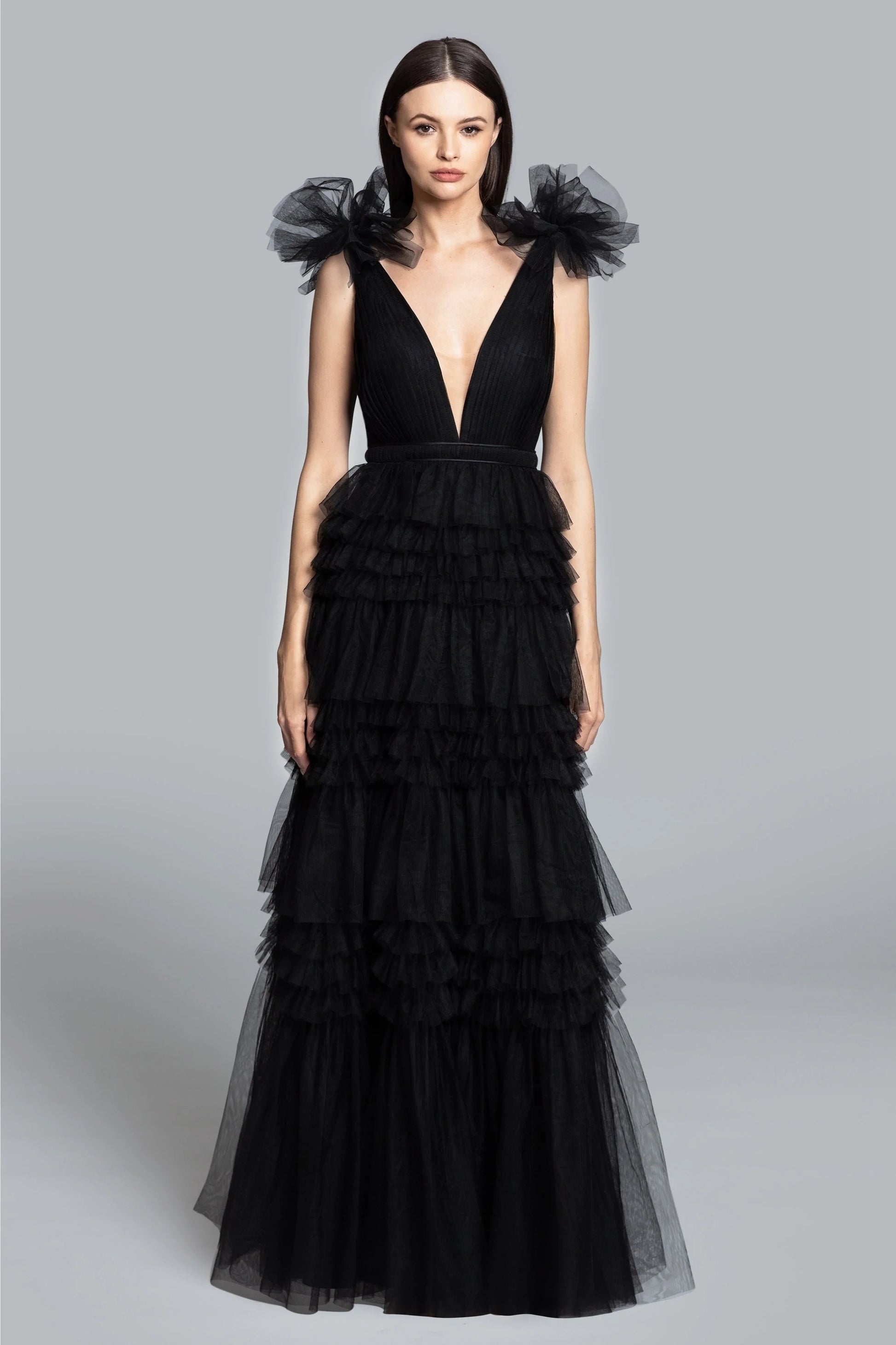 Introducing our Brooklyn Gown, a graceful masterpiece that exudes timeless elegance. This dress features a plunging V-neckline, with an invisible mesh insert and a tiered skirt. Whether you're attending a black-tie wedding or a formal soirée, this gown is your perfect choice for making a lasting impression.