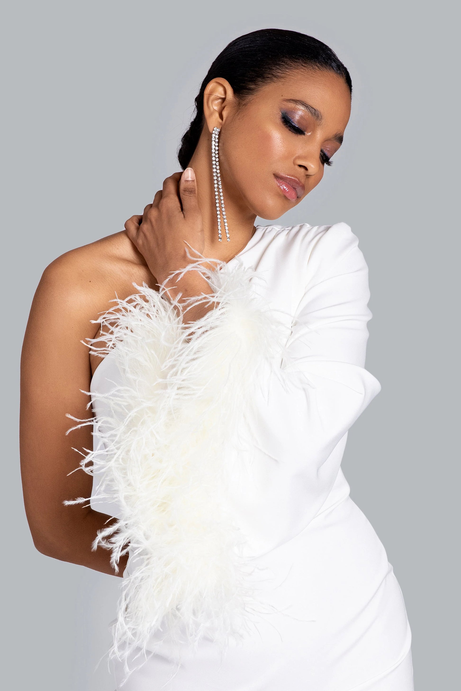 Step out in style in our Ellis Mini. Be prepared to turn heads in this sexy one-shoulder dress with a feathered flair!