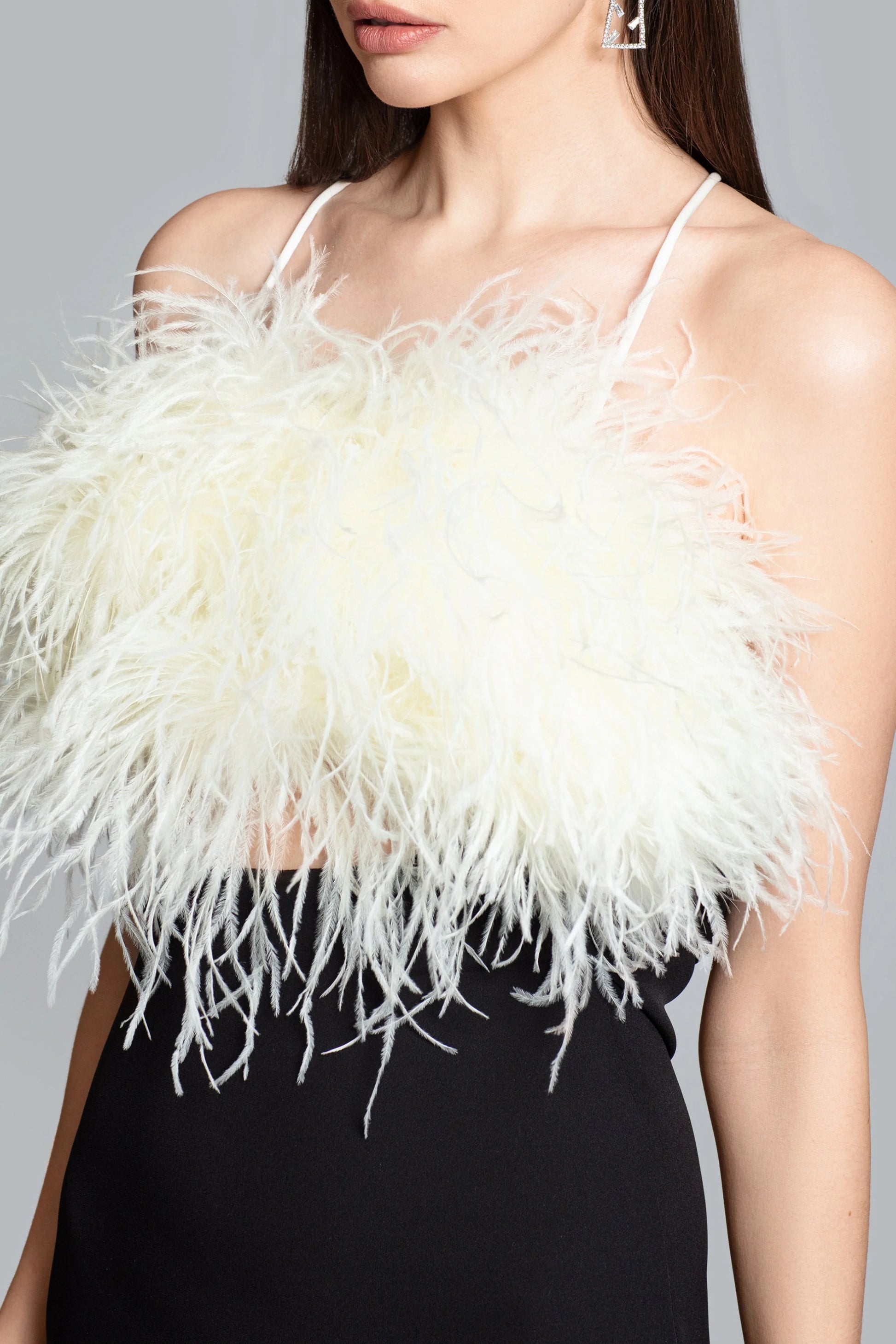 Elevate your style with our Greenwich Dress. This flirty number features a feather bodice, midriff cut out and a sexy side slit.