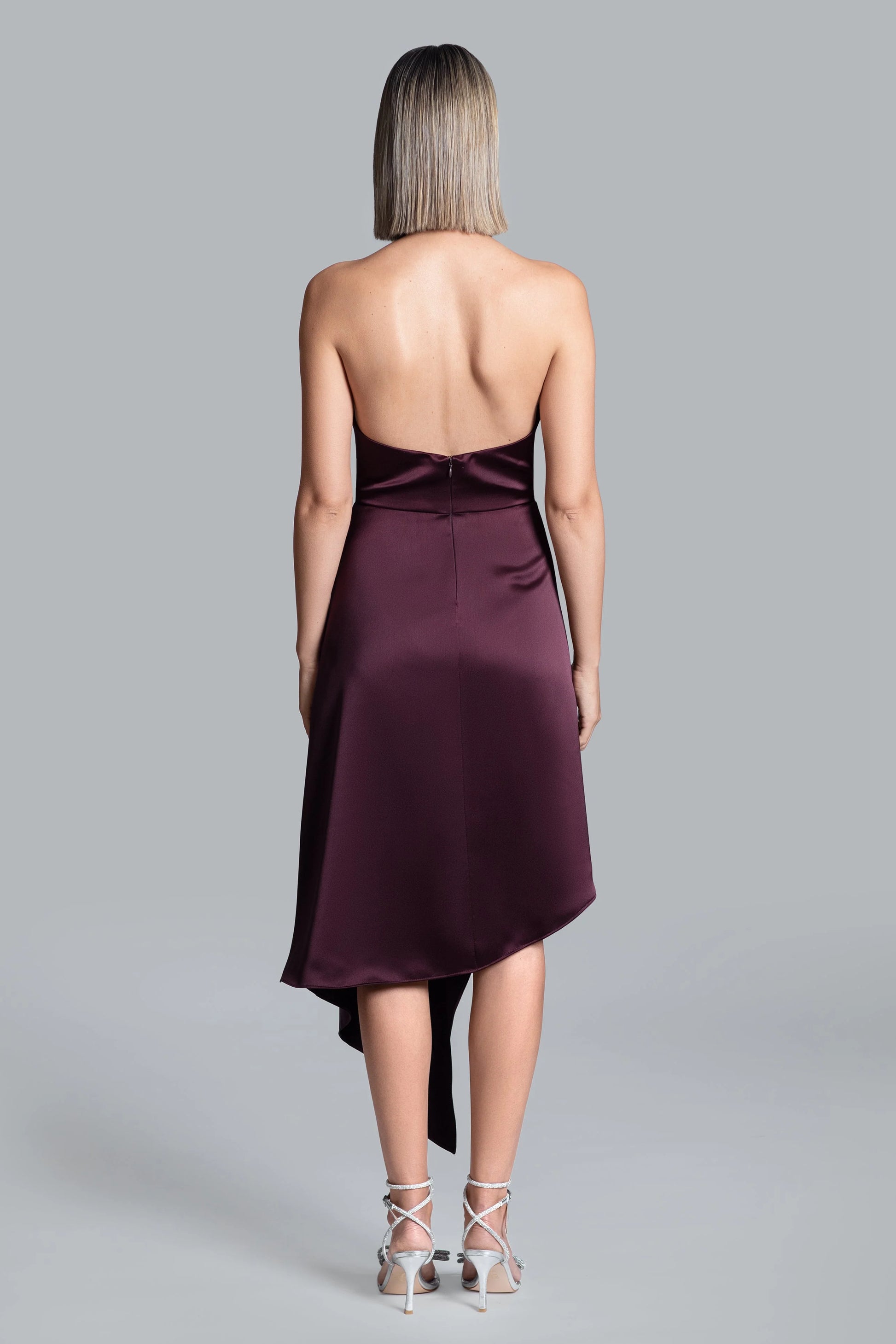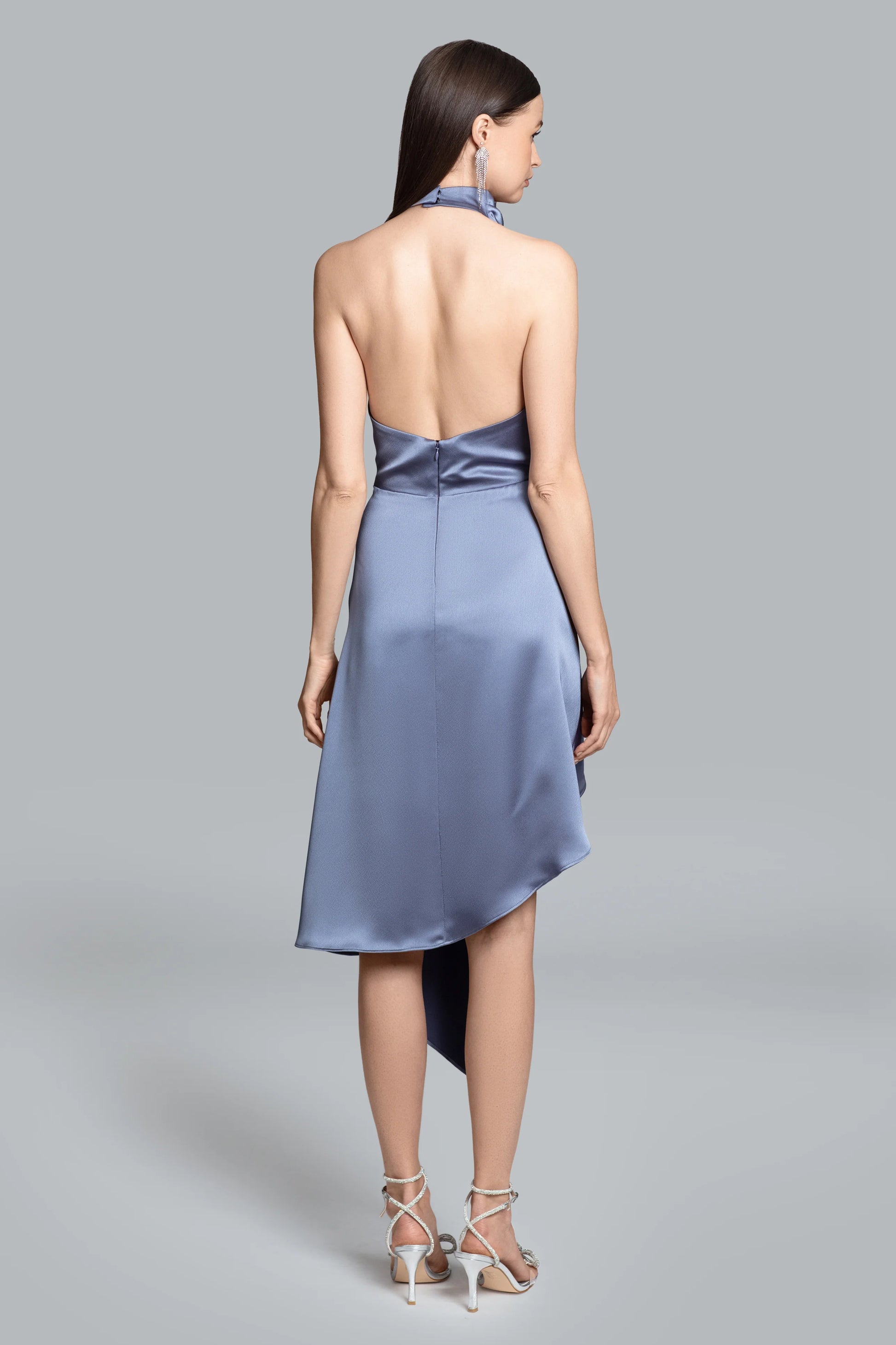 Indulge in the allure of our Hudson Dress. This style embodies sophistication and contemporary charm, featuring a halter neckline that showcases your shoulders and a playful asymmetrical hem.