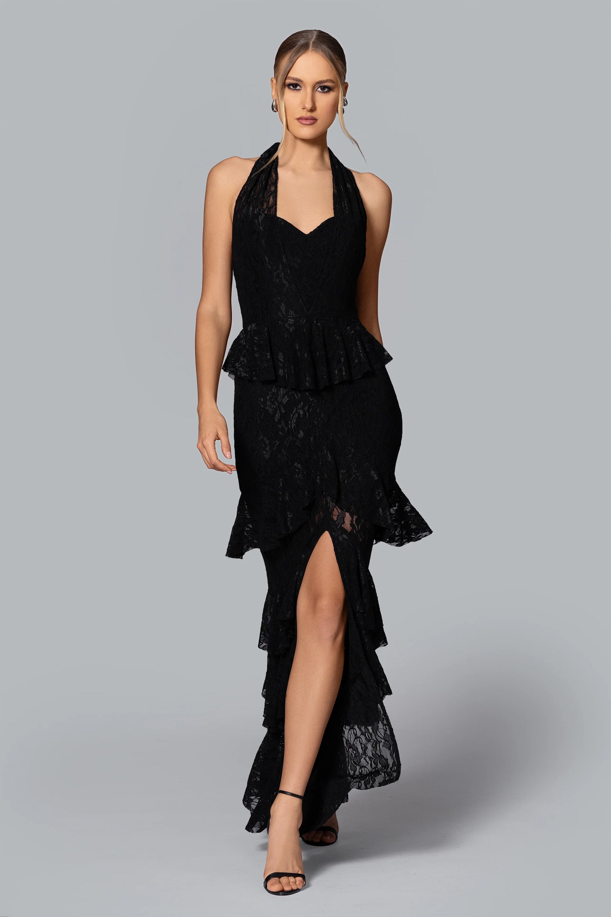This dress features a stunning lace design with a flattering peplum waist and tiered skirt for an elegant silhouette. The plunging neckline and halter-style straps add a touch of daring sophistication. Perfect for any evening affair, it combines boldness with timeless charm.