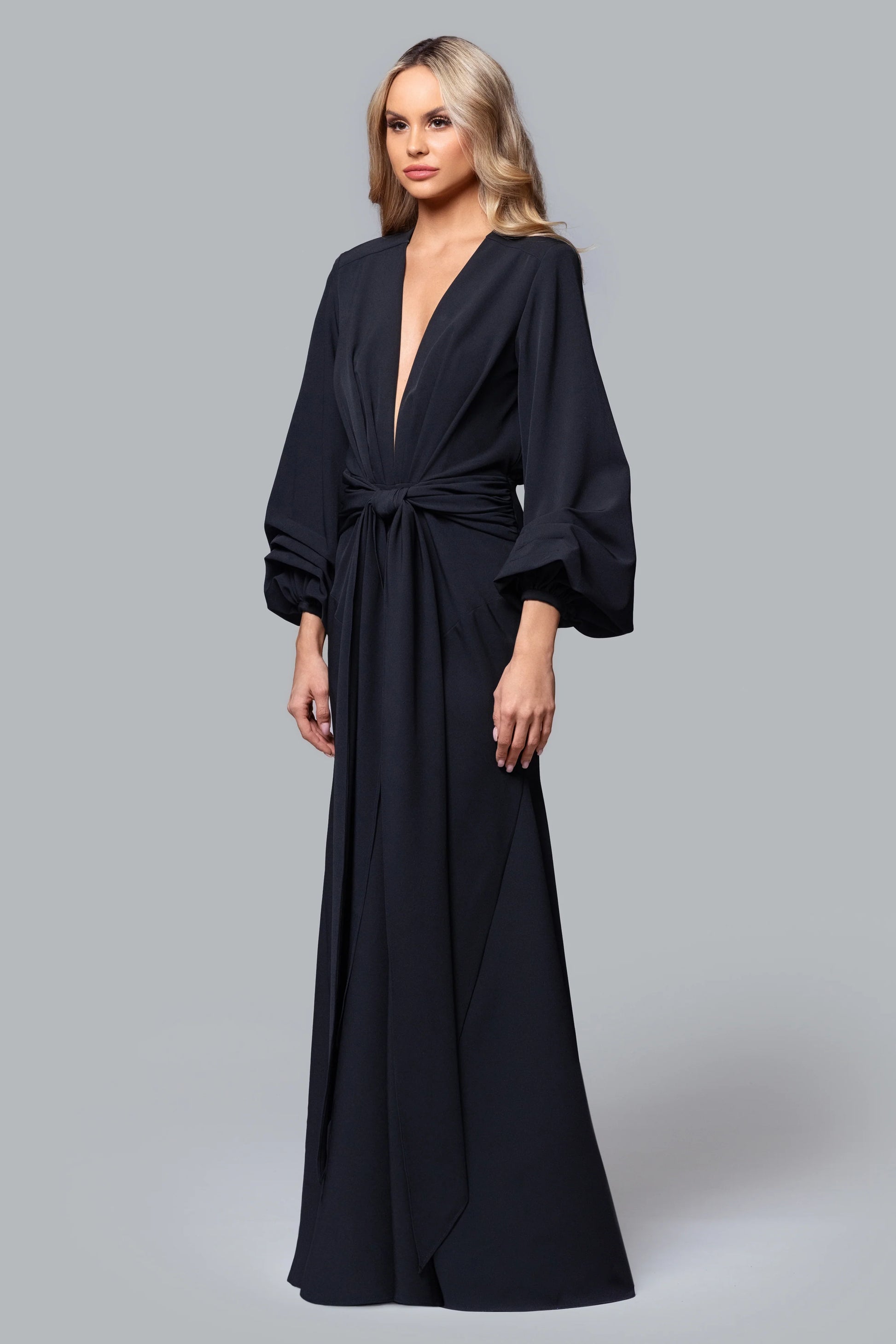 Make a bold statement in this dramatic long-sleeve gown, featuring a deep V-neckline and voluminous balloon sleeves. The cinched waist, accentuated by a flowing tie, creates a stunning silhouette that exudes both power and grace. Perfect for formal events, this gown is designed for those who want to stand out with sophistication and confidence.