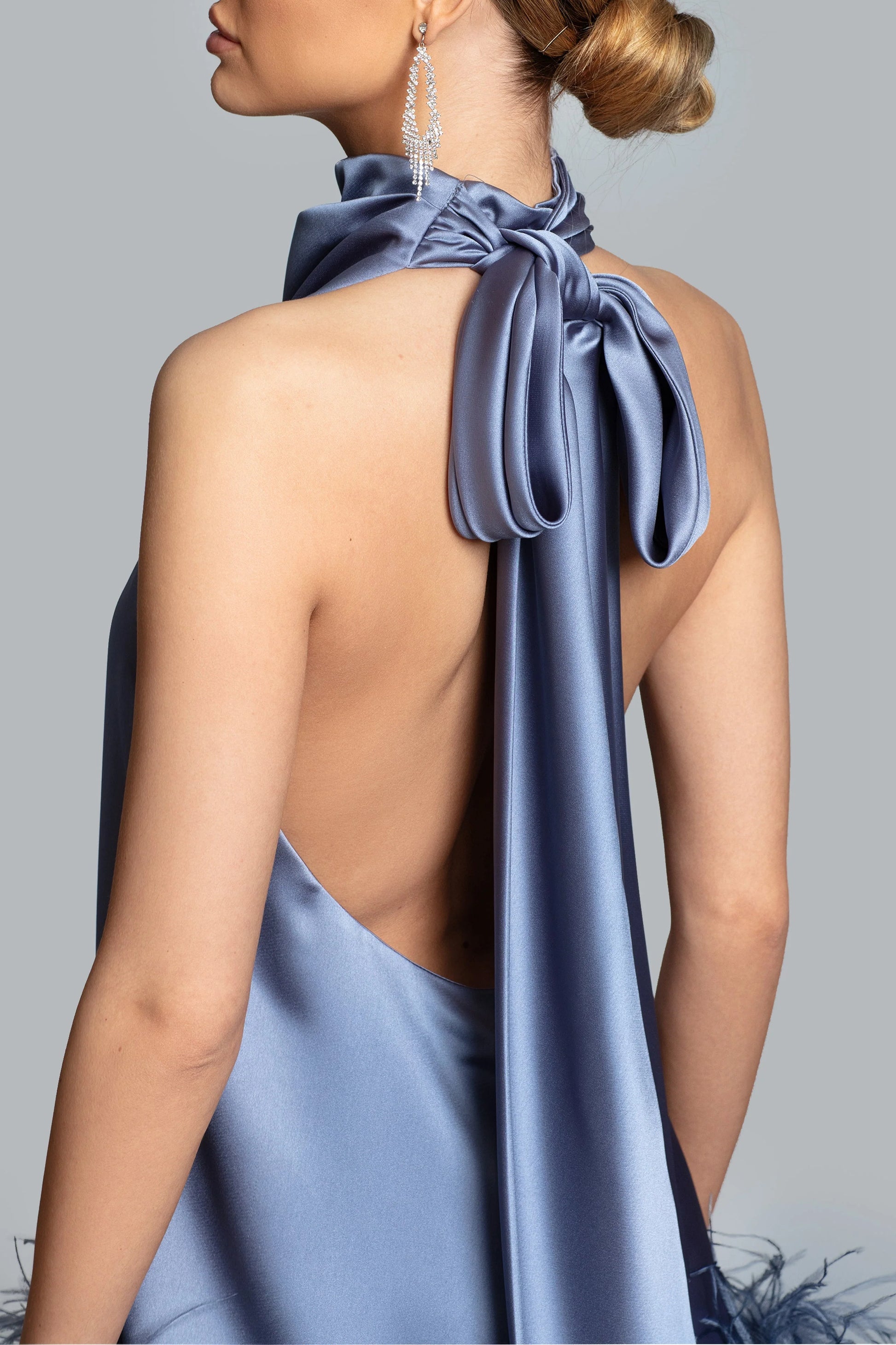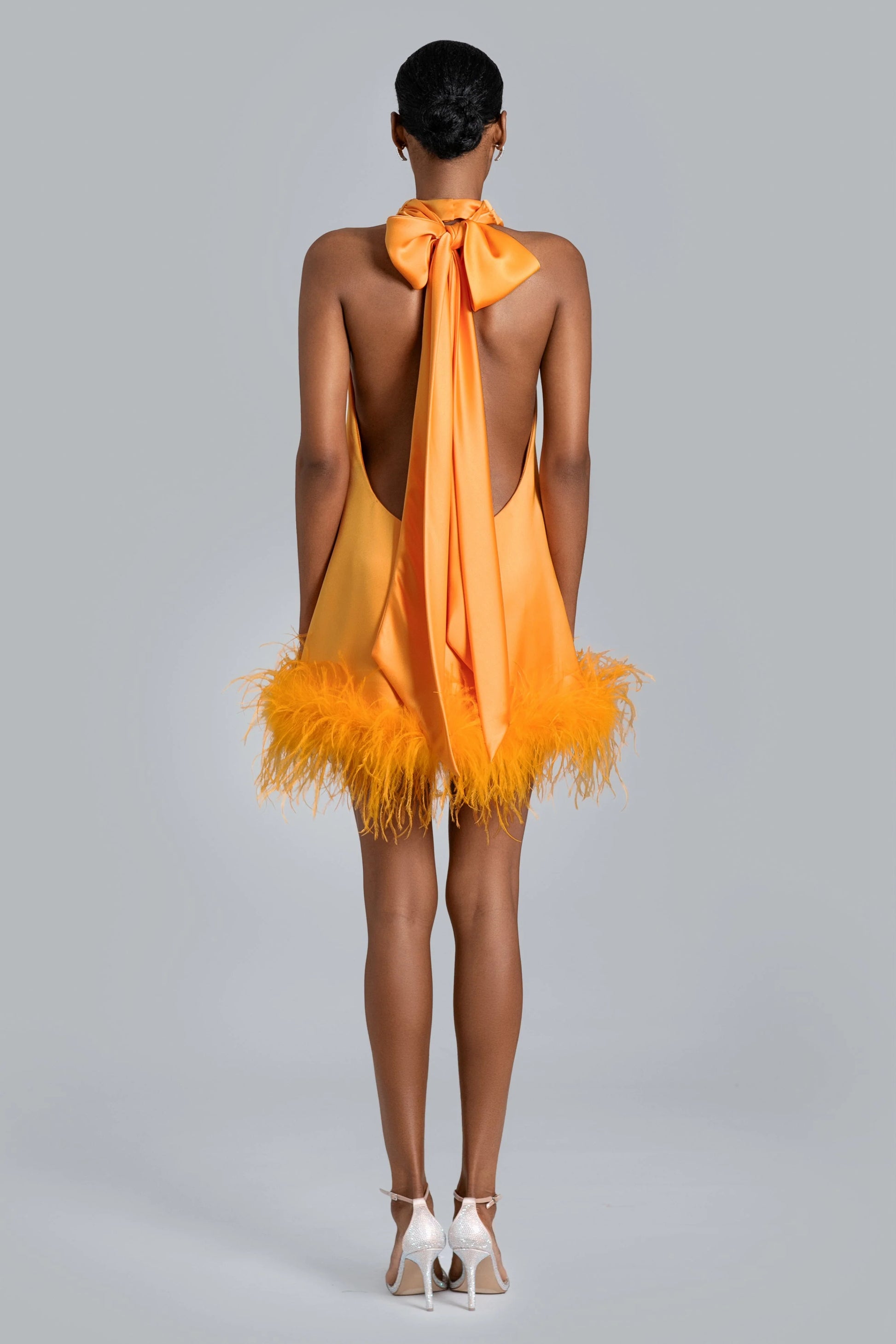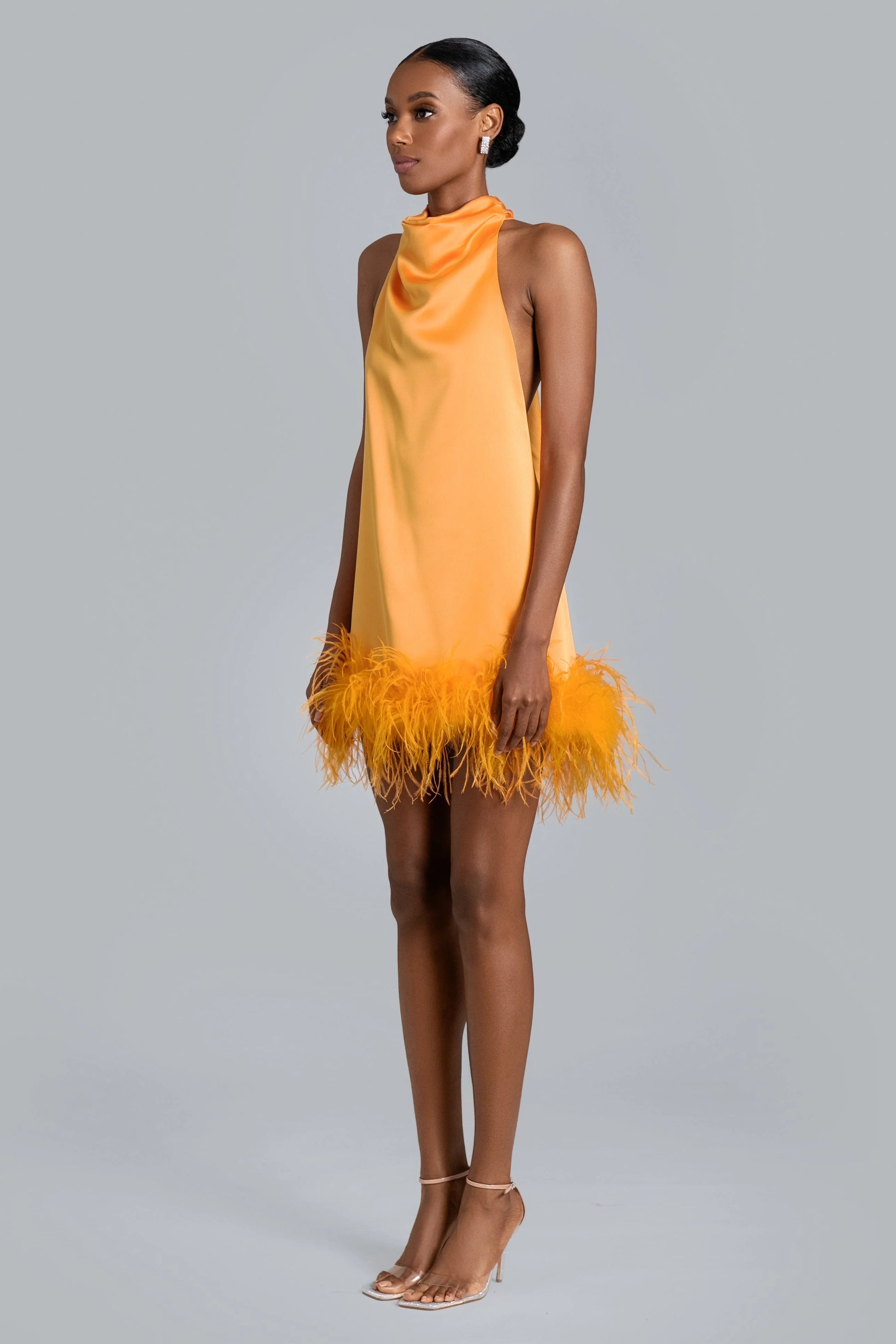 Stand out in our Nolita Mini. This fabulous satin dress features a draped mock neckline with cascading ties down the back and a flirty feather trim at the hem. The A-line silhouette makes it easy to step in...and slip off.