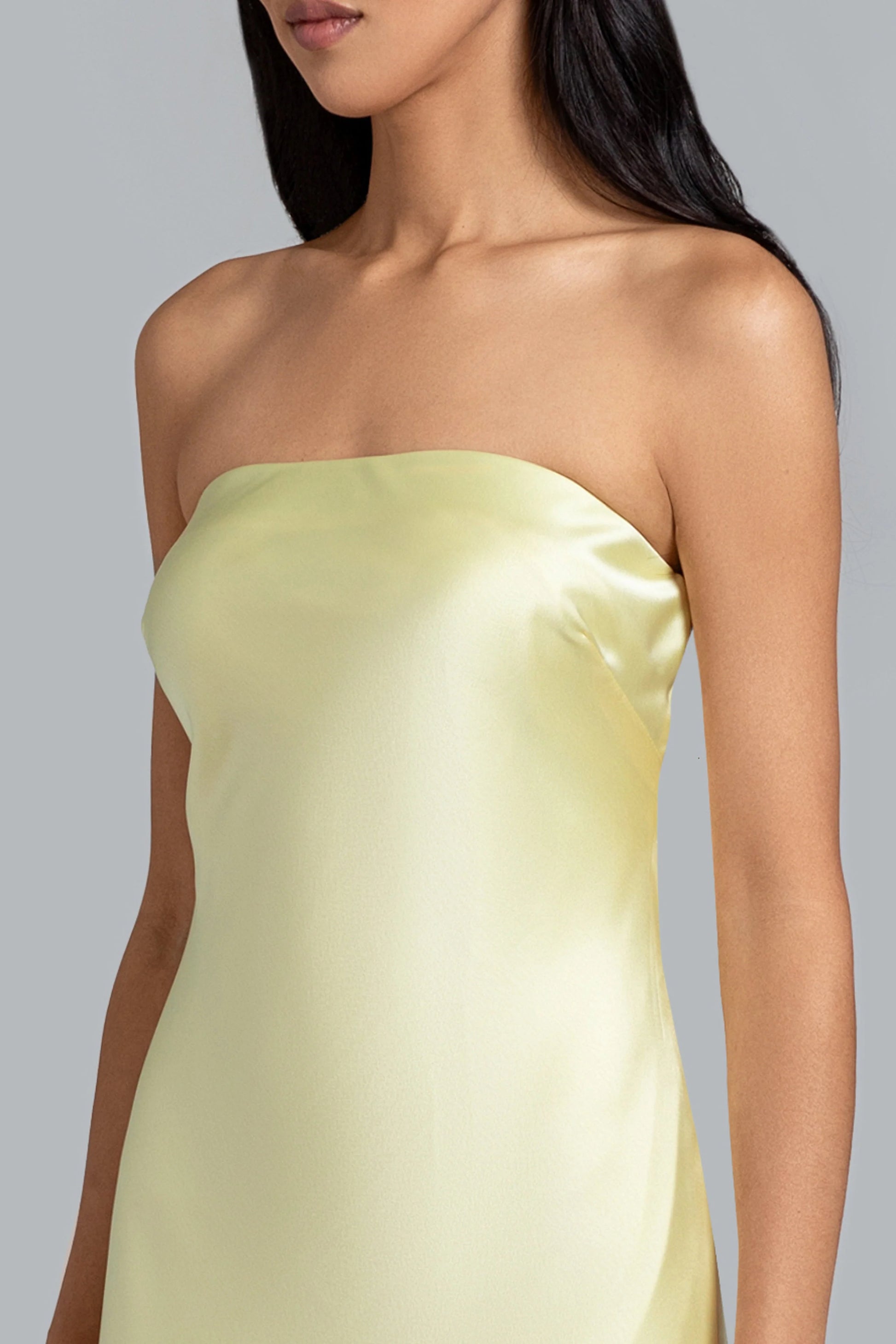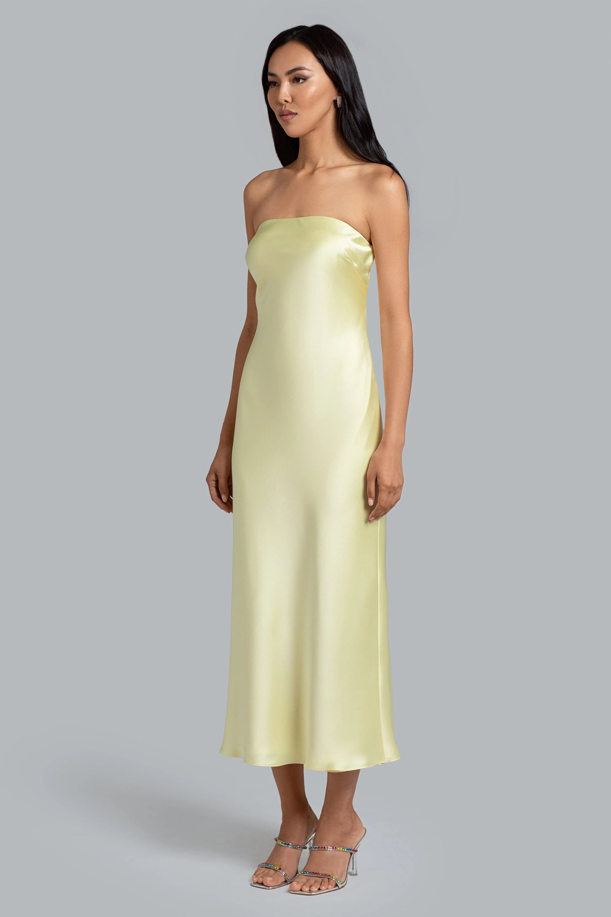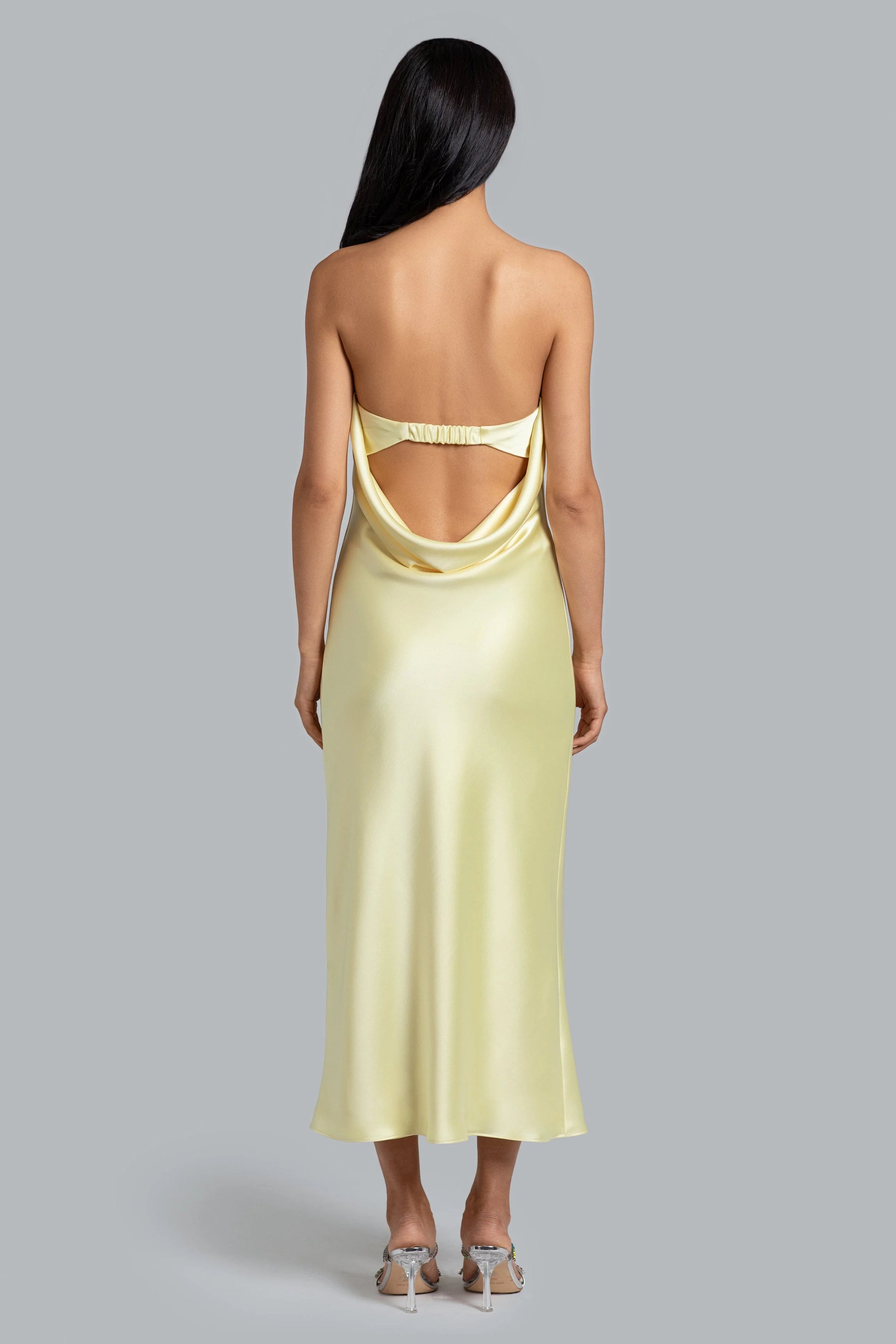 Introducing "Nora," the perfect addition to your spring/summer wardrobe. Crafted from luxurious satin in a soft yellow hue, this midi dress exudes elegance and charm. Experience the effortless sophistication and timeless style of "Nora."