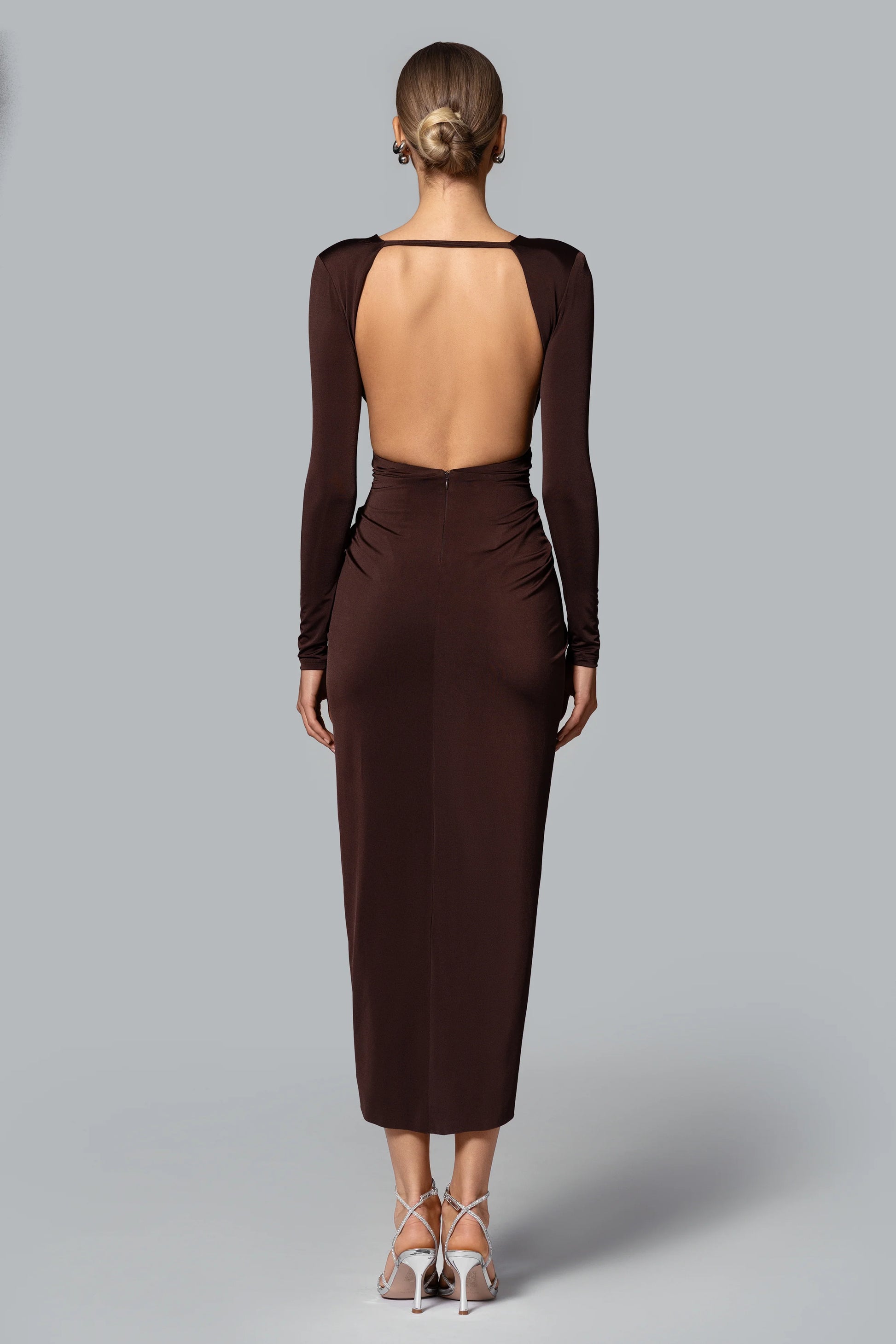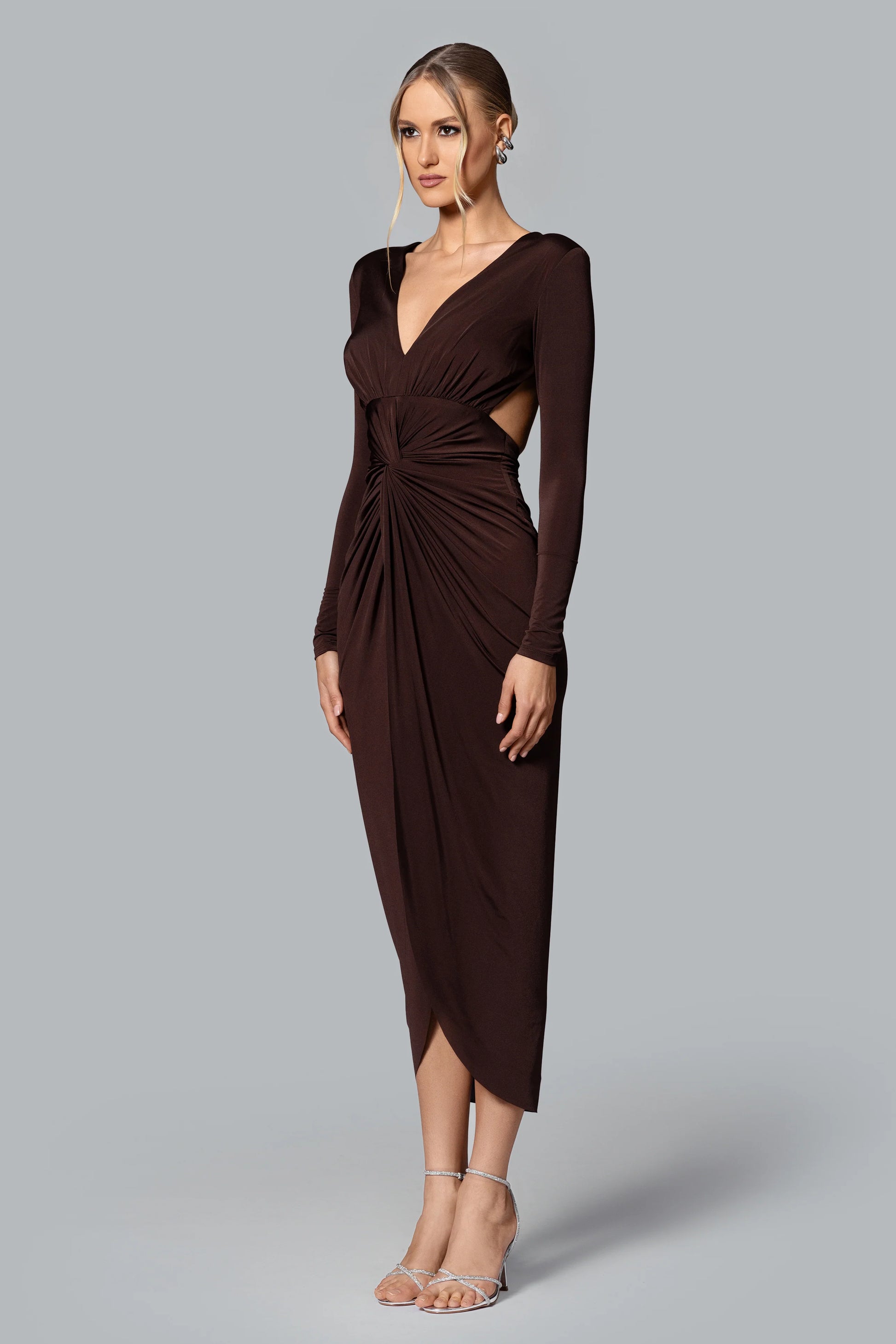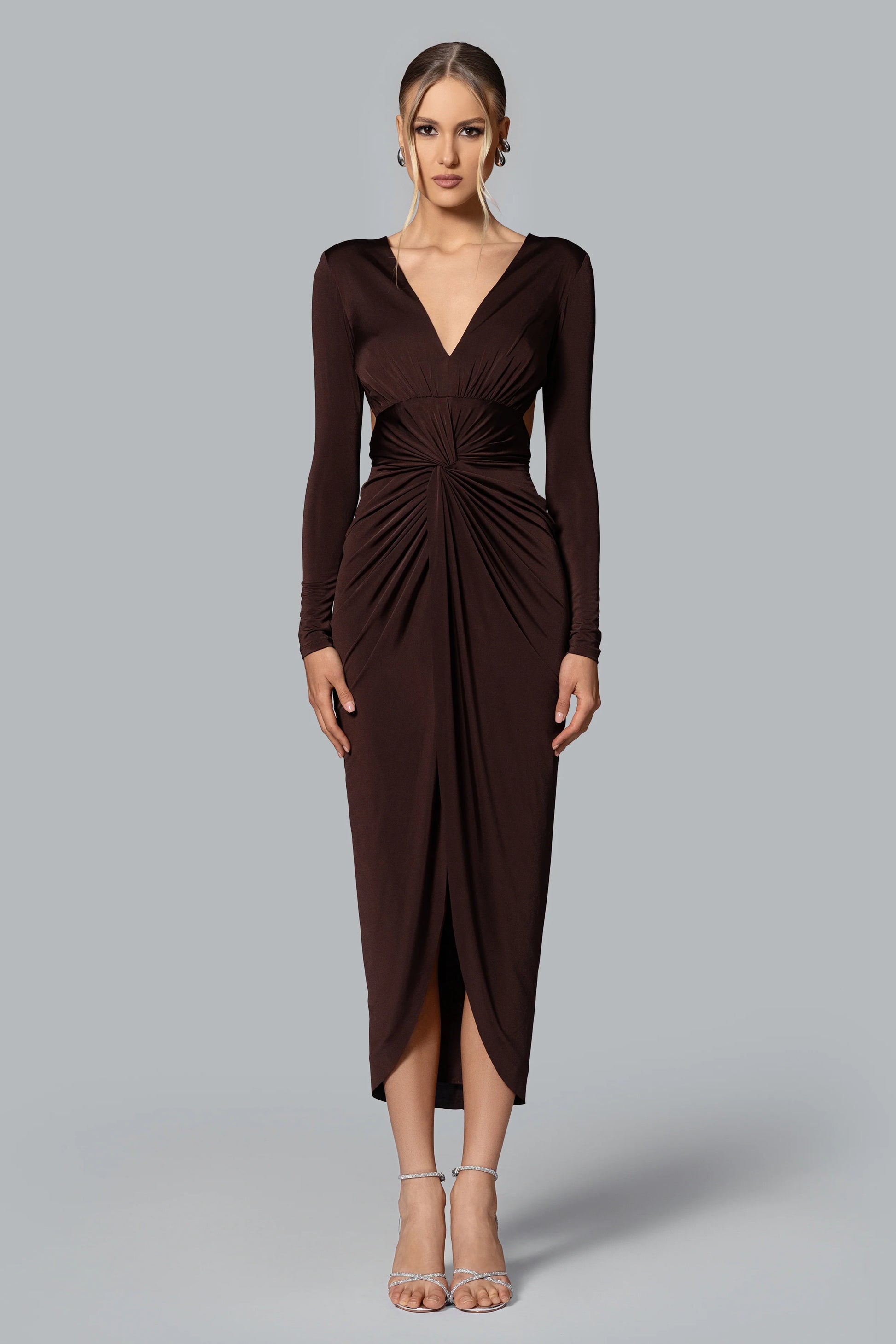 This elegant dress features a plunging neckline and long sleeves, with chic ruching for added flair. Perfect for a bold and flirty look at evening events!