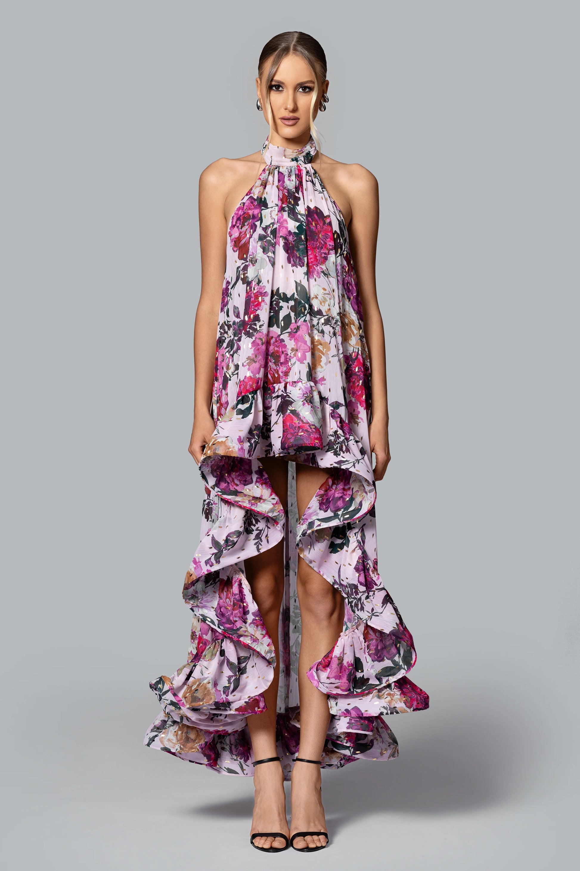 This flirty floral halter dress features a playful high-low hem with ruffles for added flair. Perfect for summer parties, it’s both fun and fabulous with a carefree, feminine vibe.