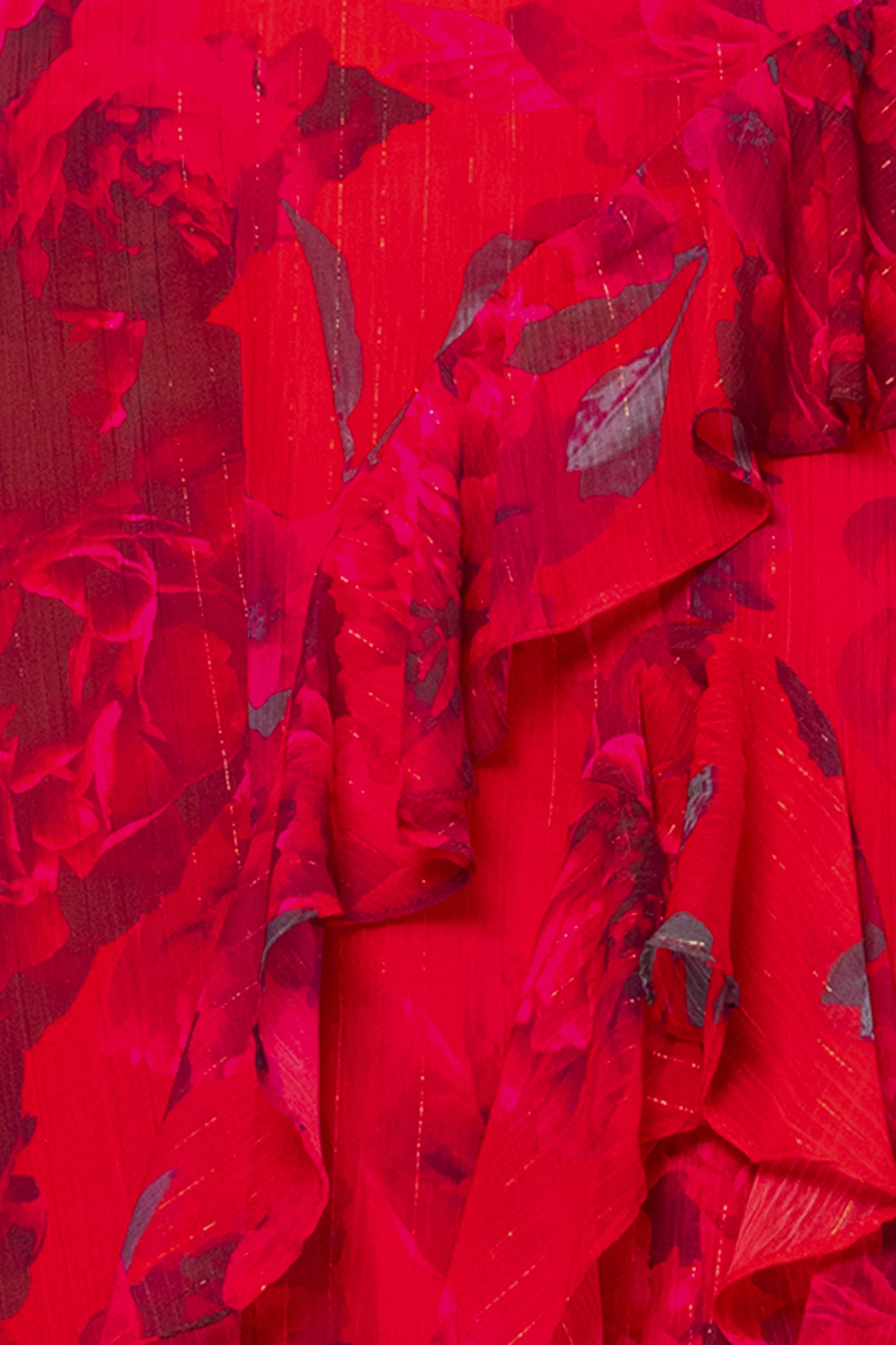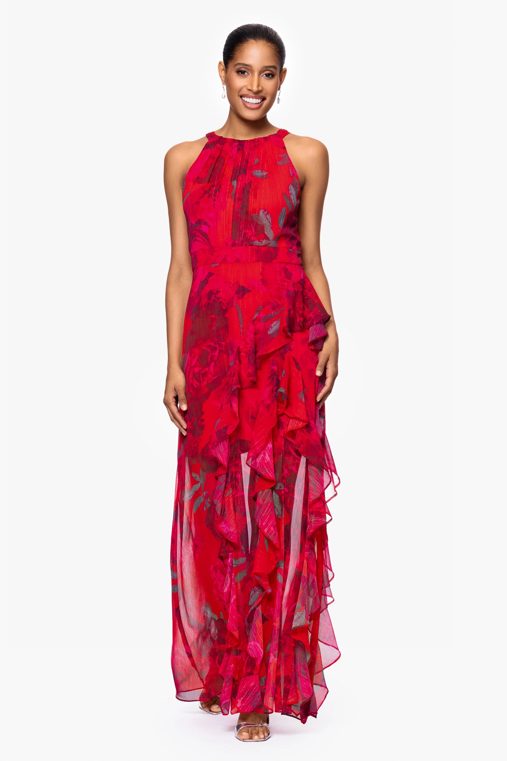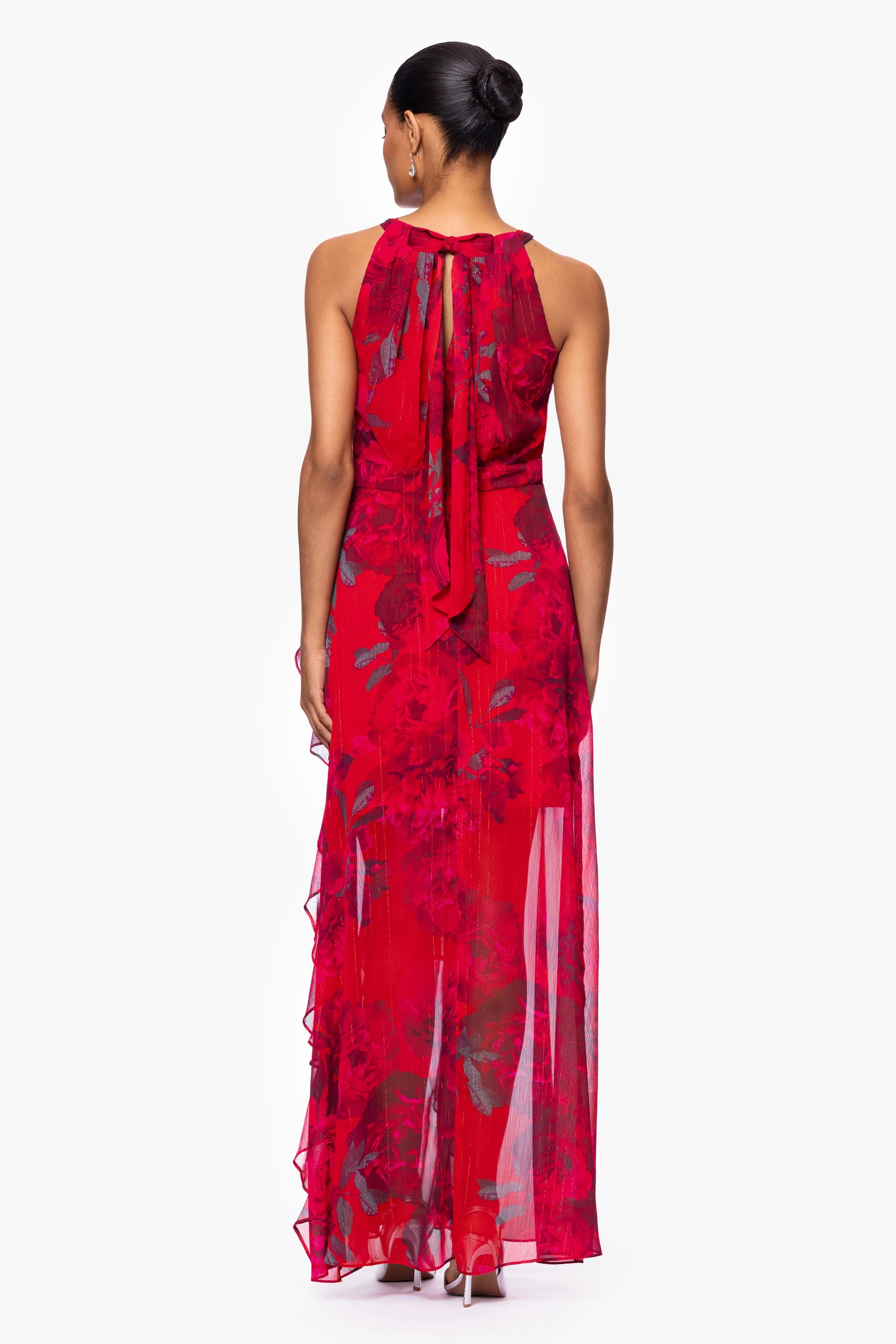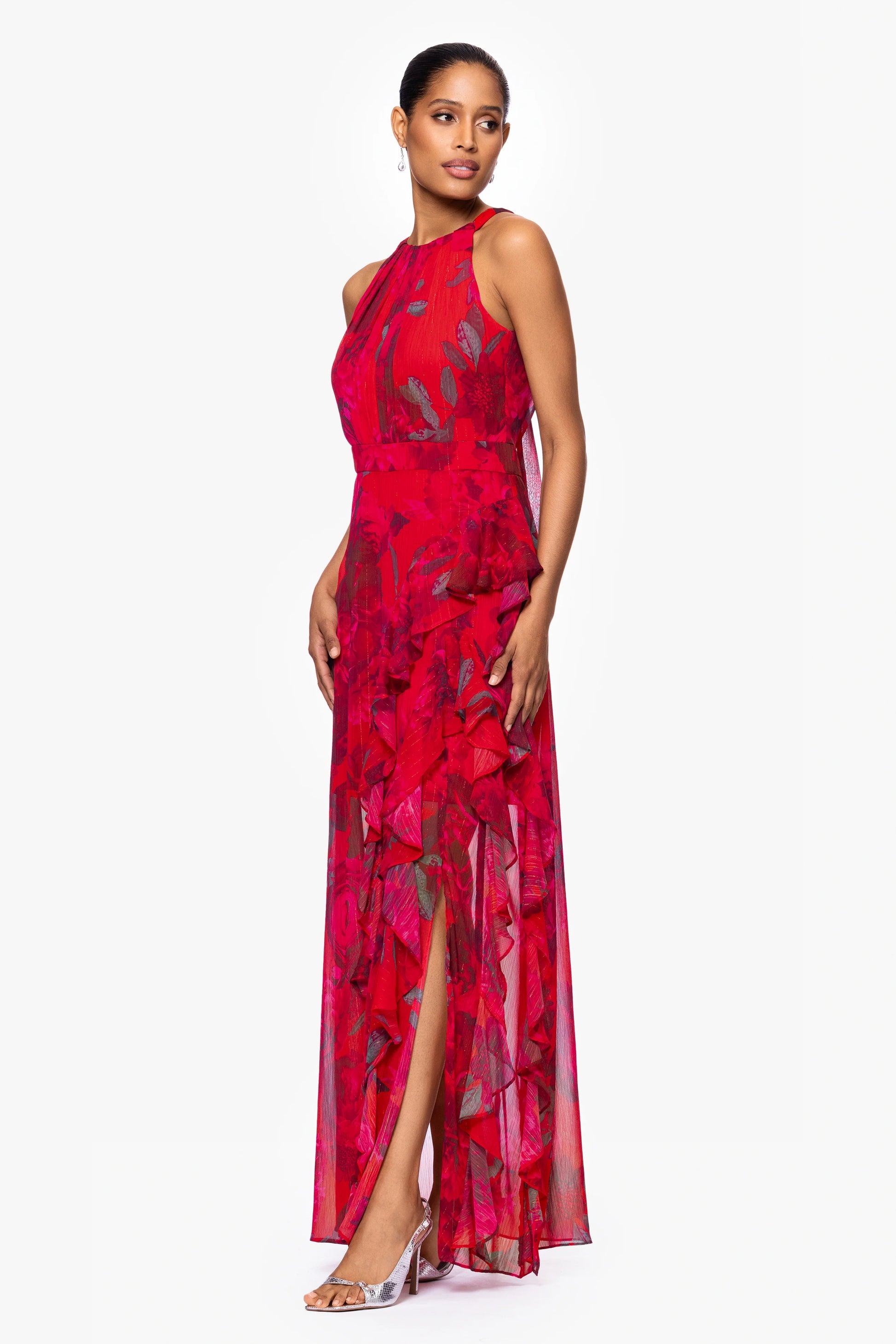 "Ginny" Chiffon Print Floor Length Ruffle Dress
