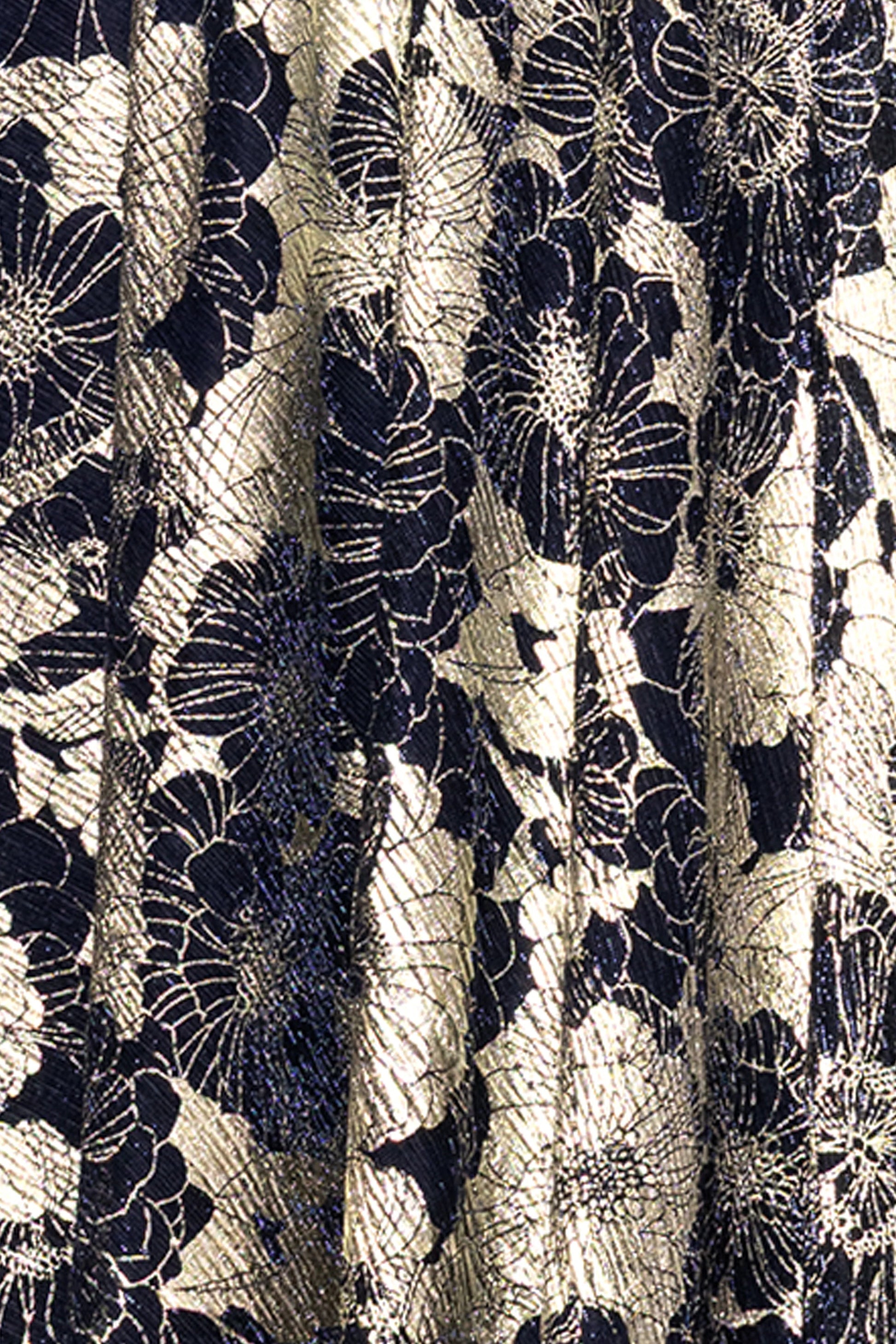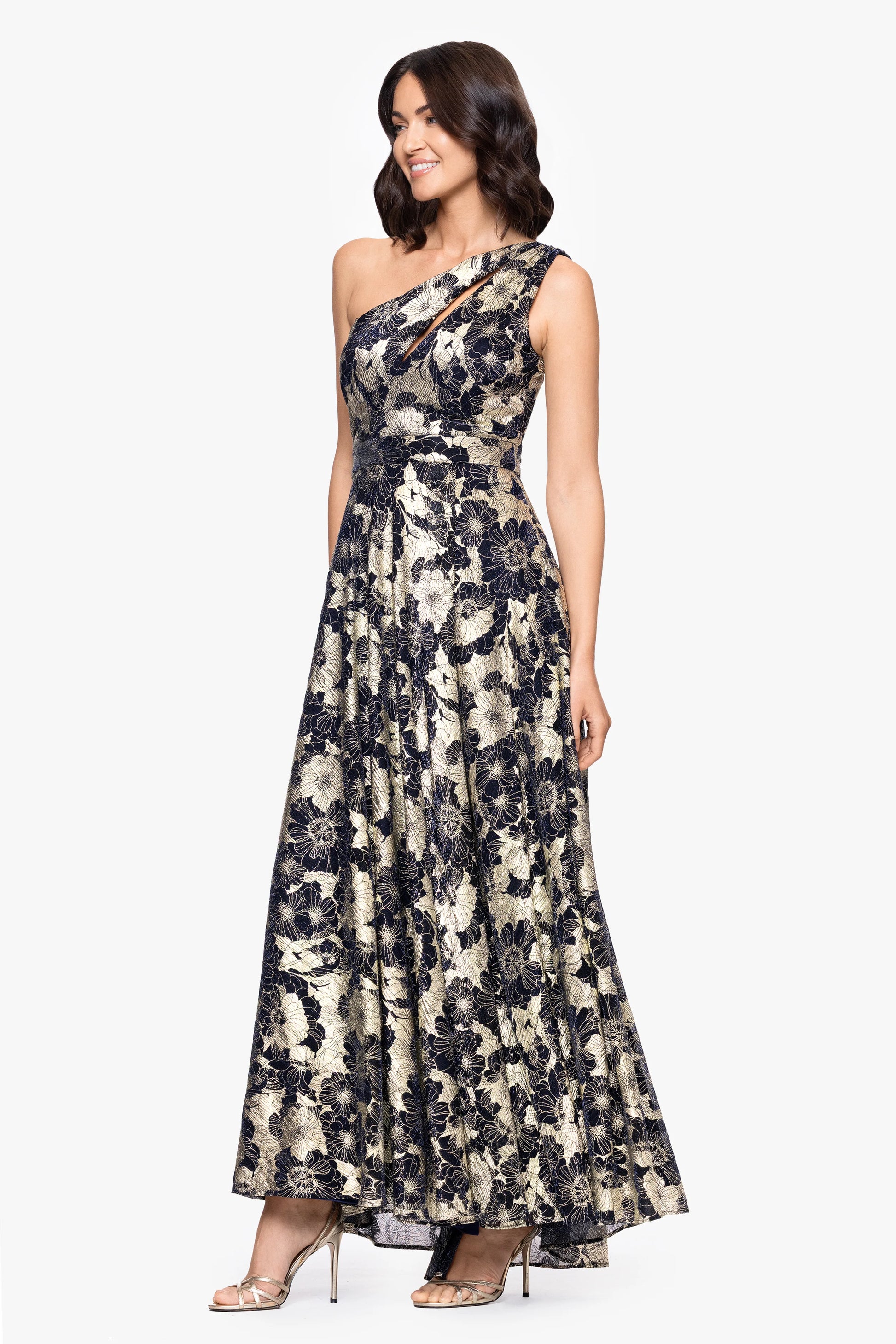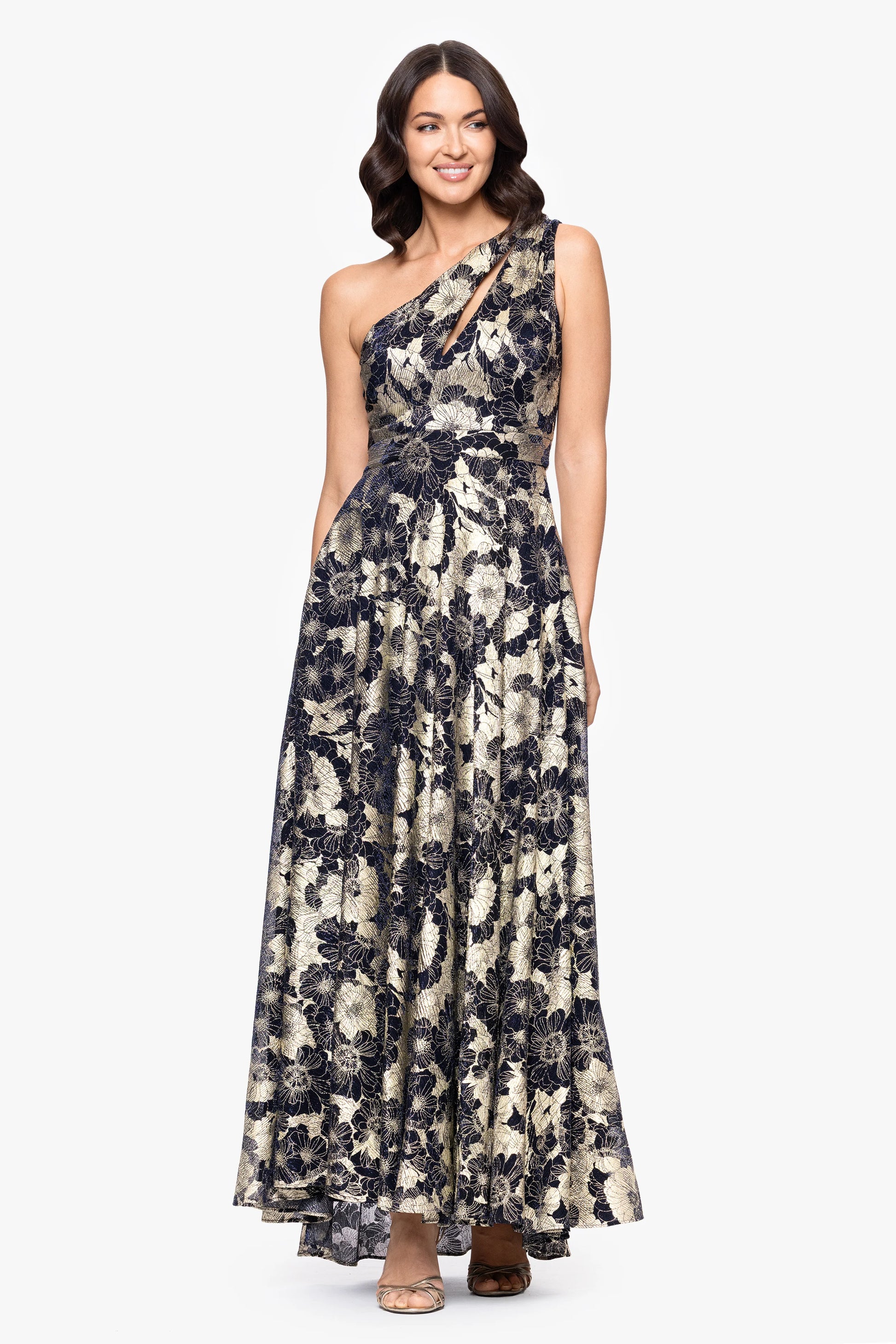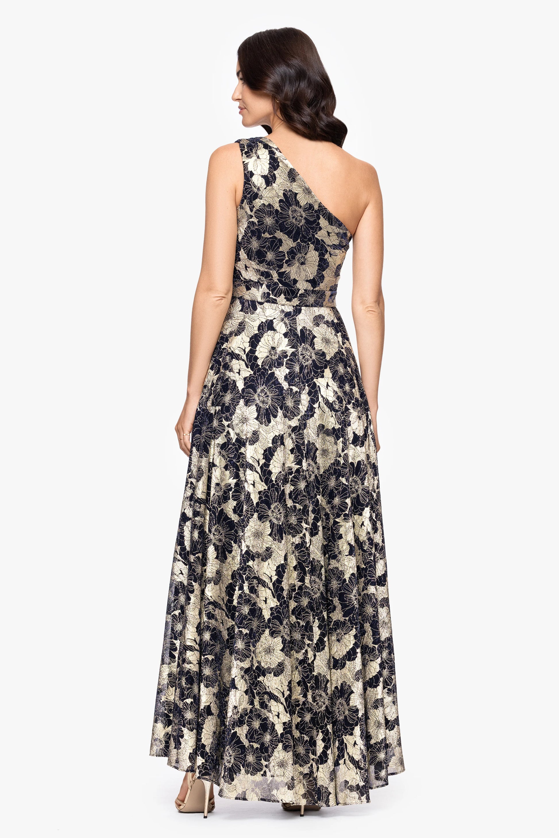 "Gwen" Long One Shoulder Wrap Foil Flower Dress