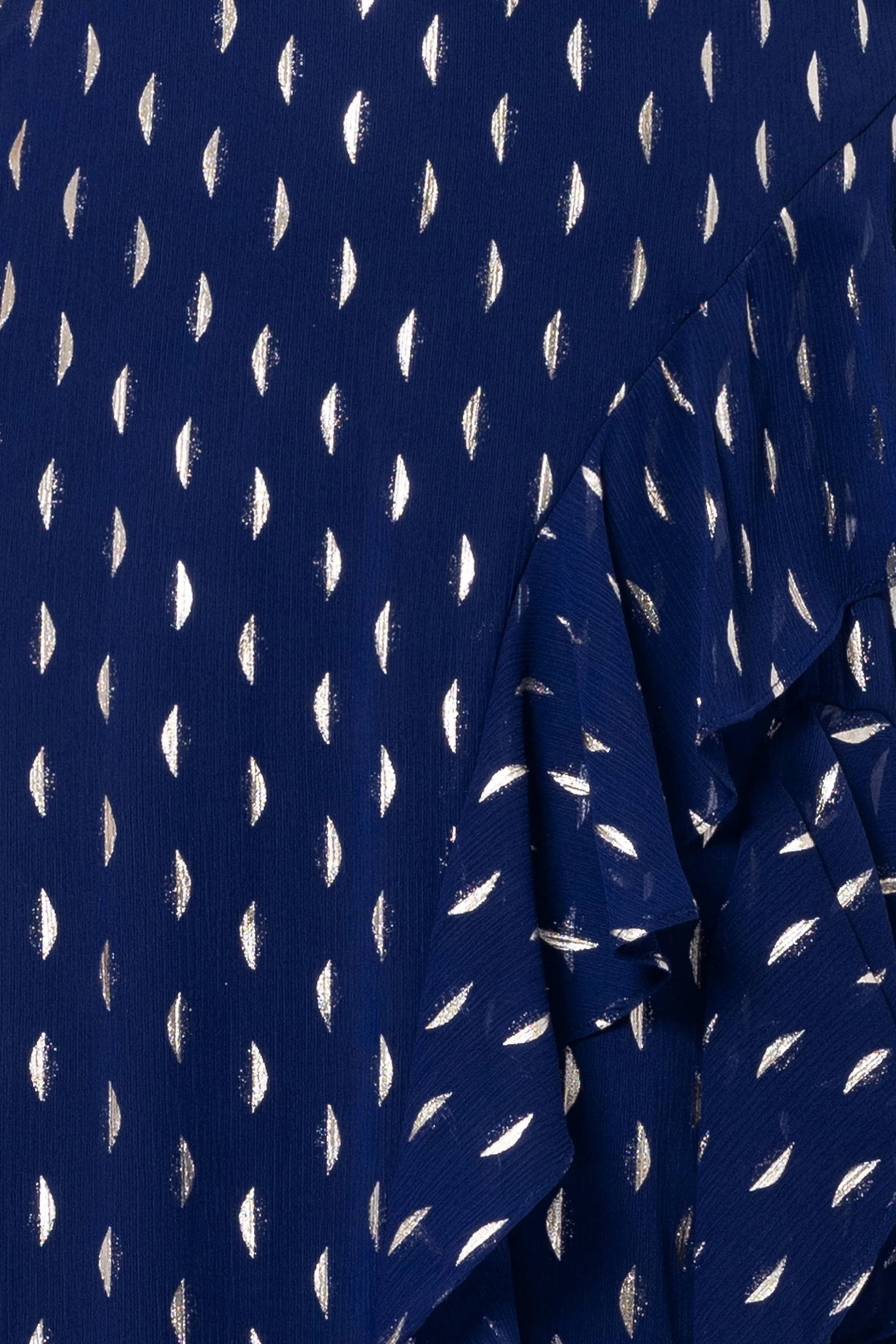 Enchant your way into their hearts in 'Becky.' The ruffle in soft chiffon flows with every move, and the metallic pattern strikes a mood. Wear an updo to show off the bow at the back of the neck and take lots of pictures.