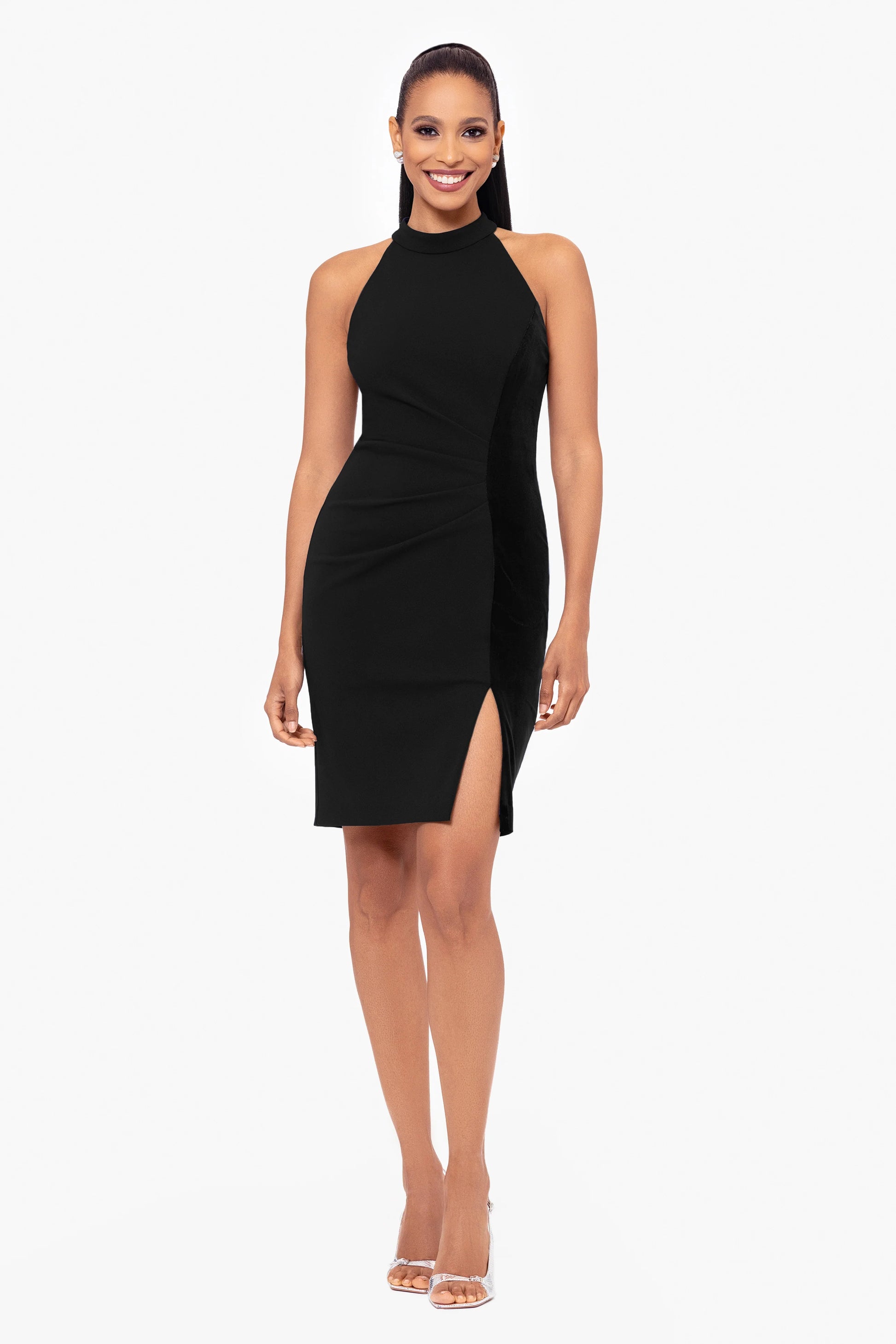 "Mariana" Short Halter Neck Scuba Crepe and Velvet Stripe Dress