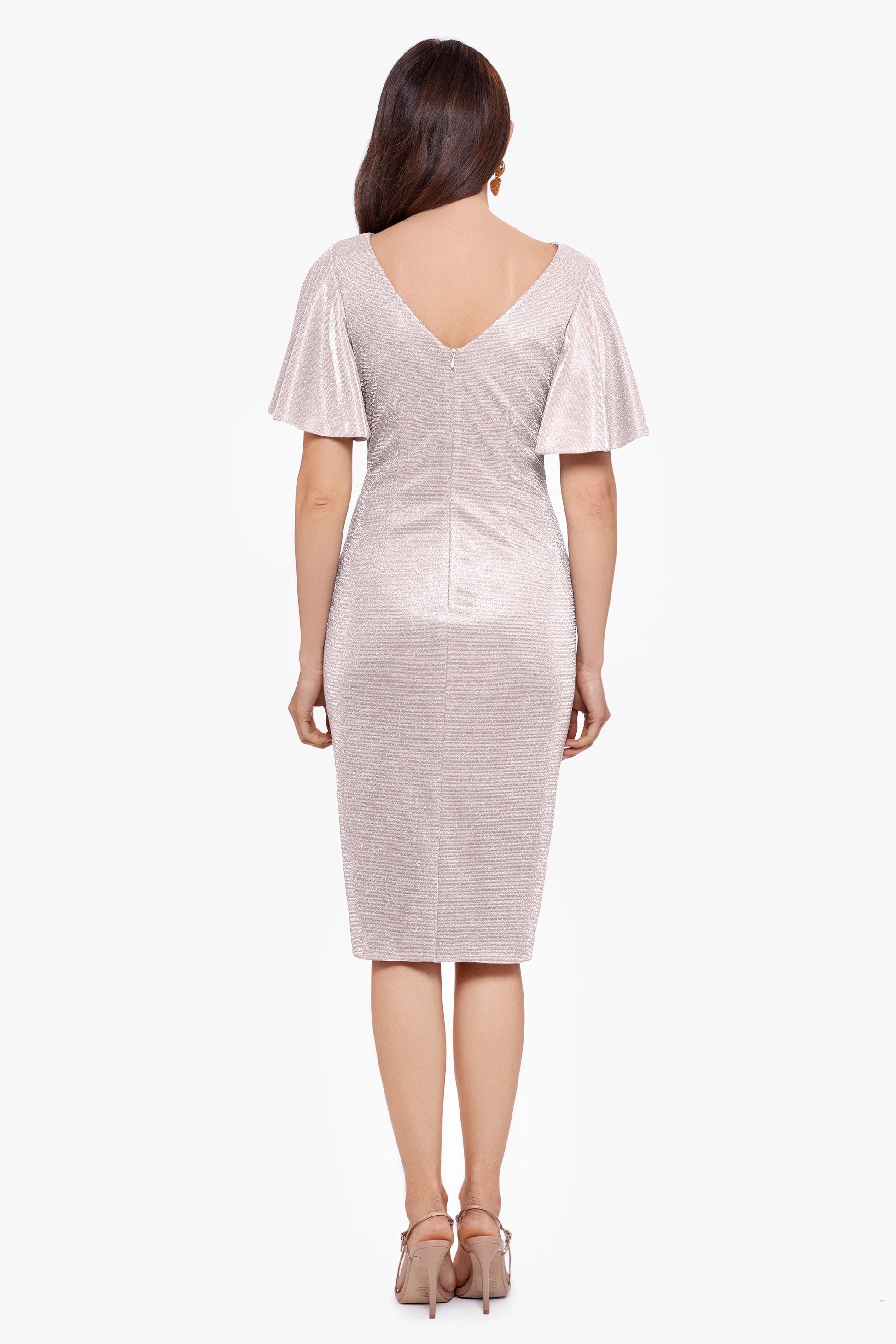 - Details: Flutter Sleeves, Ruching, Ruched Back, Knee Length