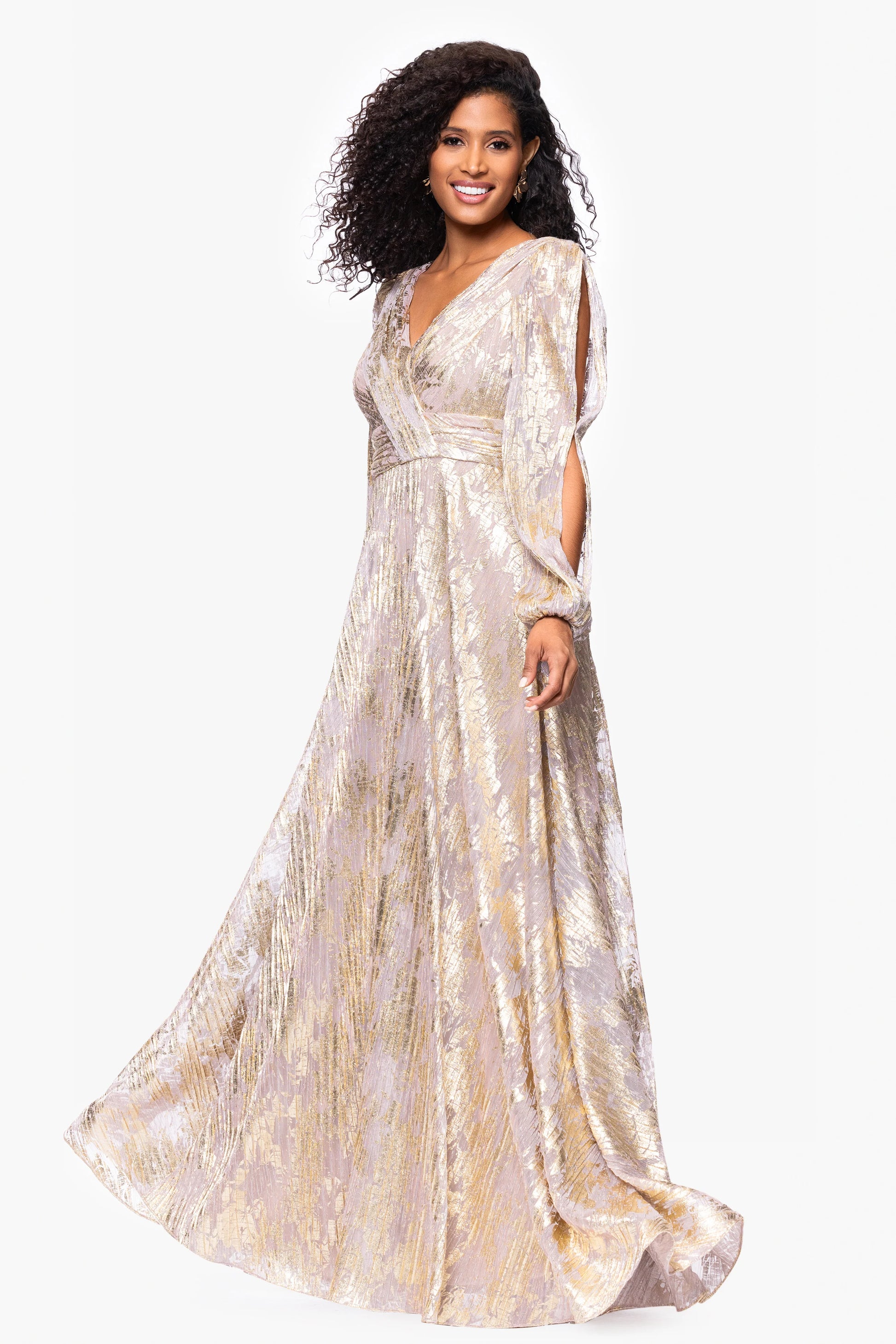 This elegant gown features long, billowy sleeves and a wrap-style bodice, enhanced with a shimmering metallic pattern that exudes sophistication. The luxurious fabric creates a flattering silhouette, making it perfect for formal events such as galas, weddings, or evening receptions. With its beautiful texture and timeless design, this dress ensures you radiate elegance and charm at any occasion.