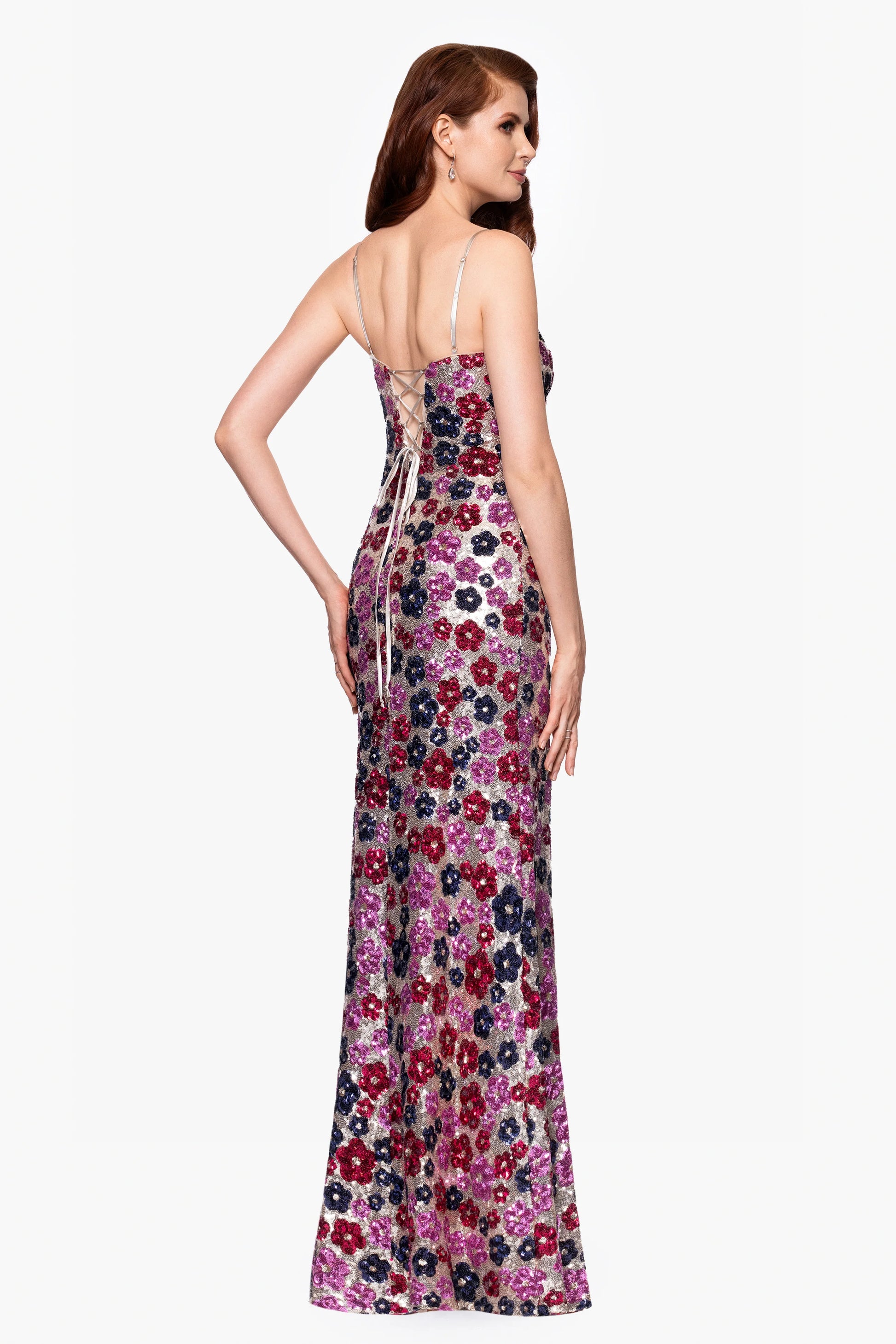 "Miley" Long Floral Sequin Spaghetti Strap Floor Length Dress