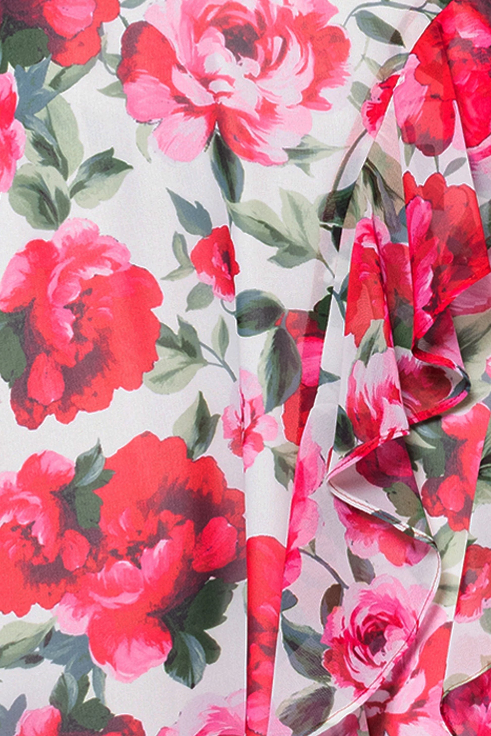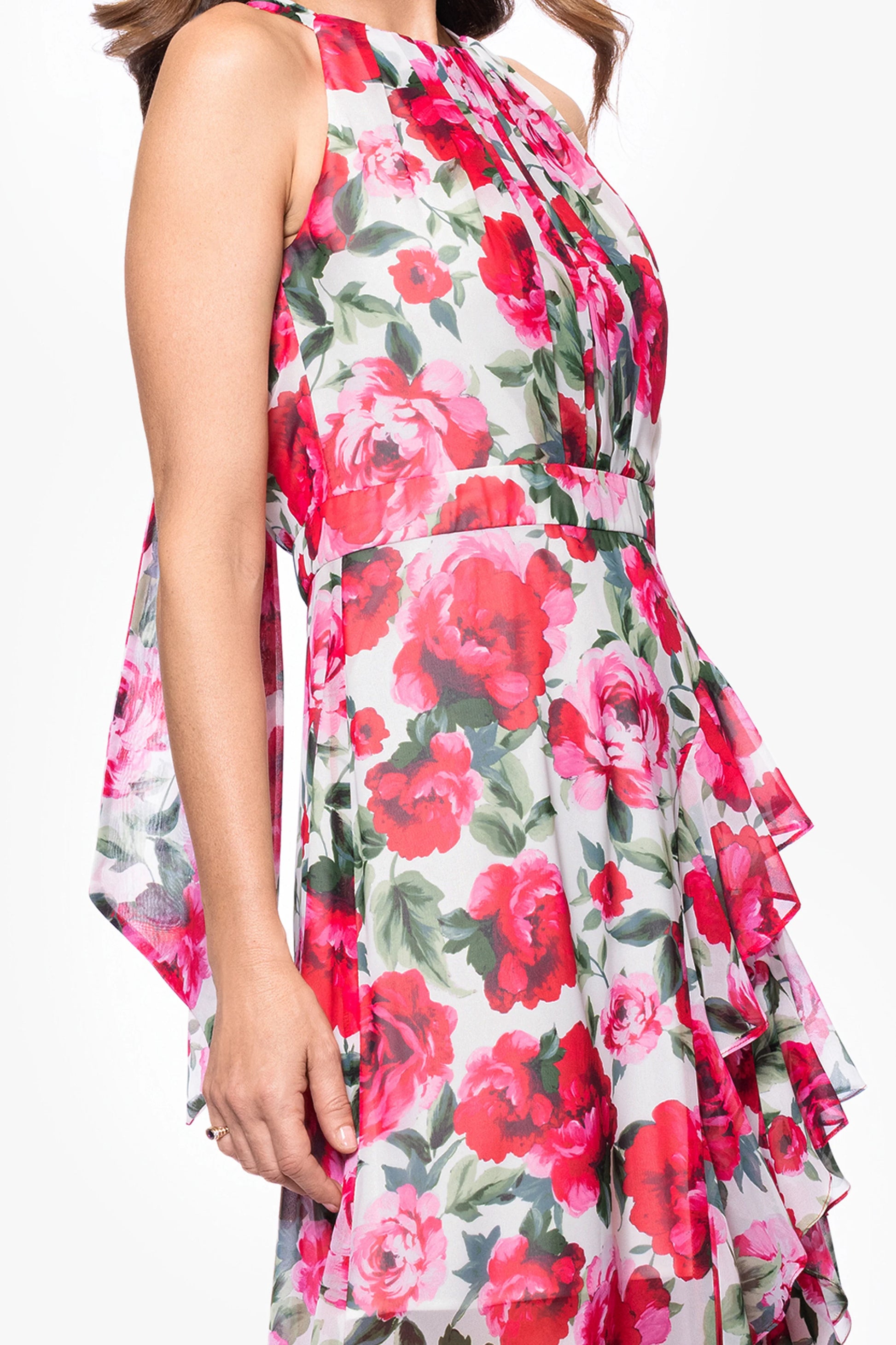 This stunning floral gown features a flattering halter neckline and a flowy, ruffled skirt, creating a feminine and romantic look. The bold, vibrant print in shades of red and pink makes it perfect for spring or summer events, like garden parties or weddings. With its light, airy fabric and playful design, this dress combines elegance with effortless charm.