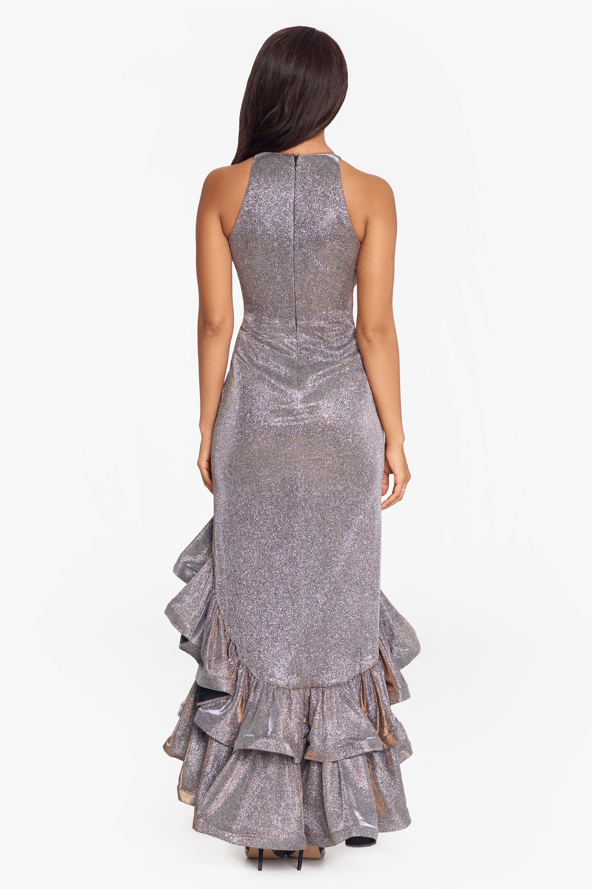 Turn heads in this dazzling high-low gown, featuring a shimmering metallic fabric and a chic high neckline. The dramatic ruffled hemline and front slit add a playful yet sophisticated touch, perfect for making a grand entrance at any formal event. With its captivating sparkle and unique design, this dress is sure to make you the center of attention.