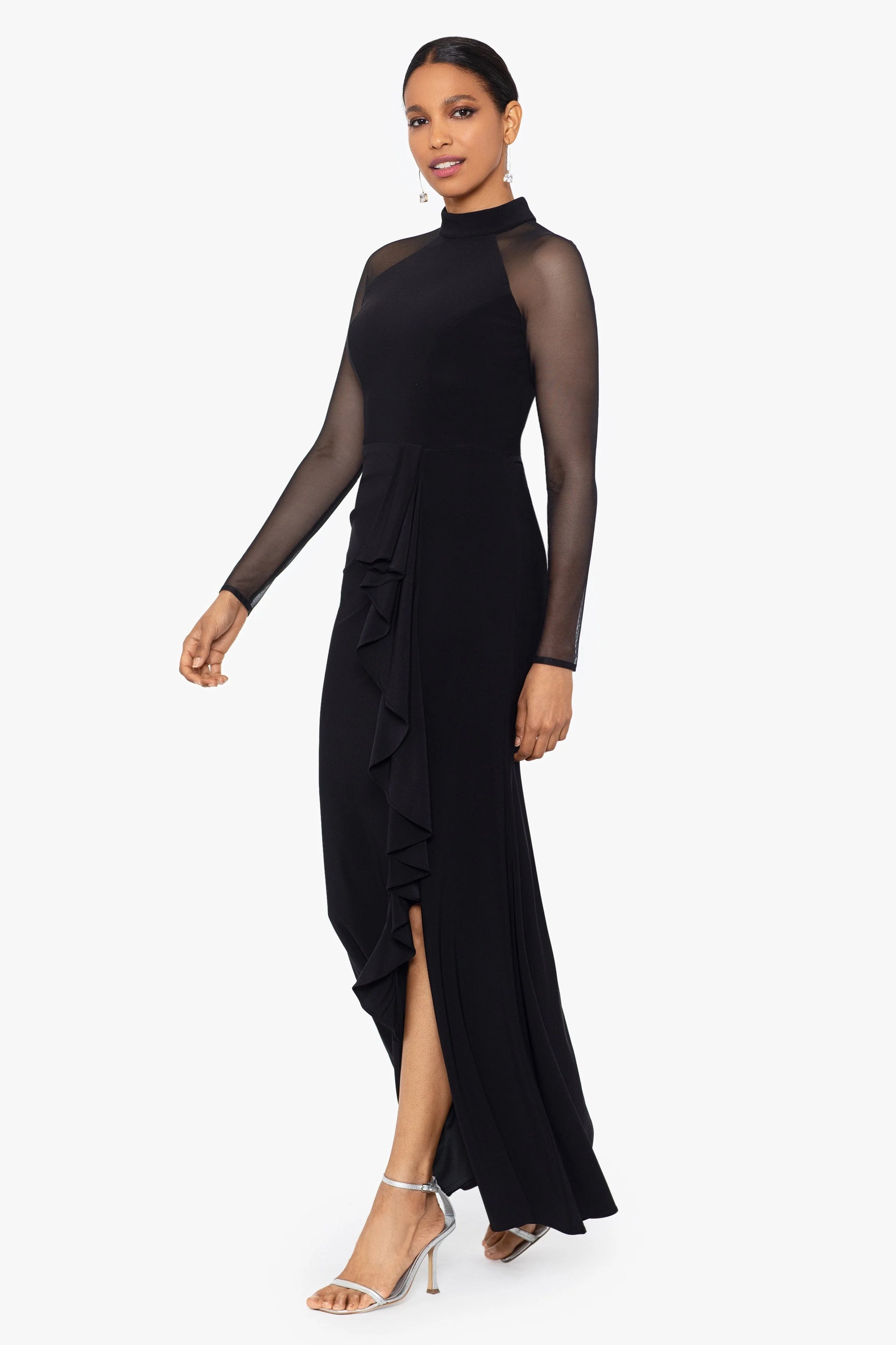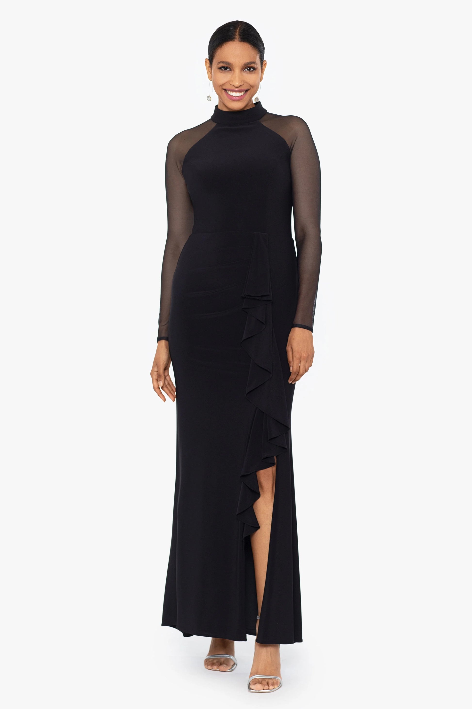 Look great and feel confident in the stunning "Natalie" long mock neck dress. Crafted with delicate mesh sleeves and elegant ruffle detailing, this black dress will turn heads wherever you go. A subtle slit is featured in the front, adding a hint of drama that will make you the center of attention. Enjoy timeless style and perfect fit with this special piece.