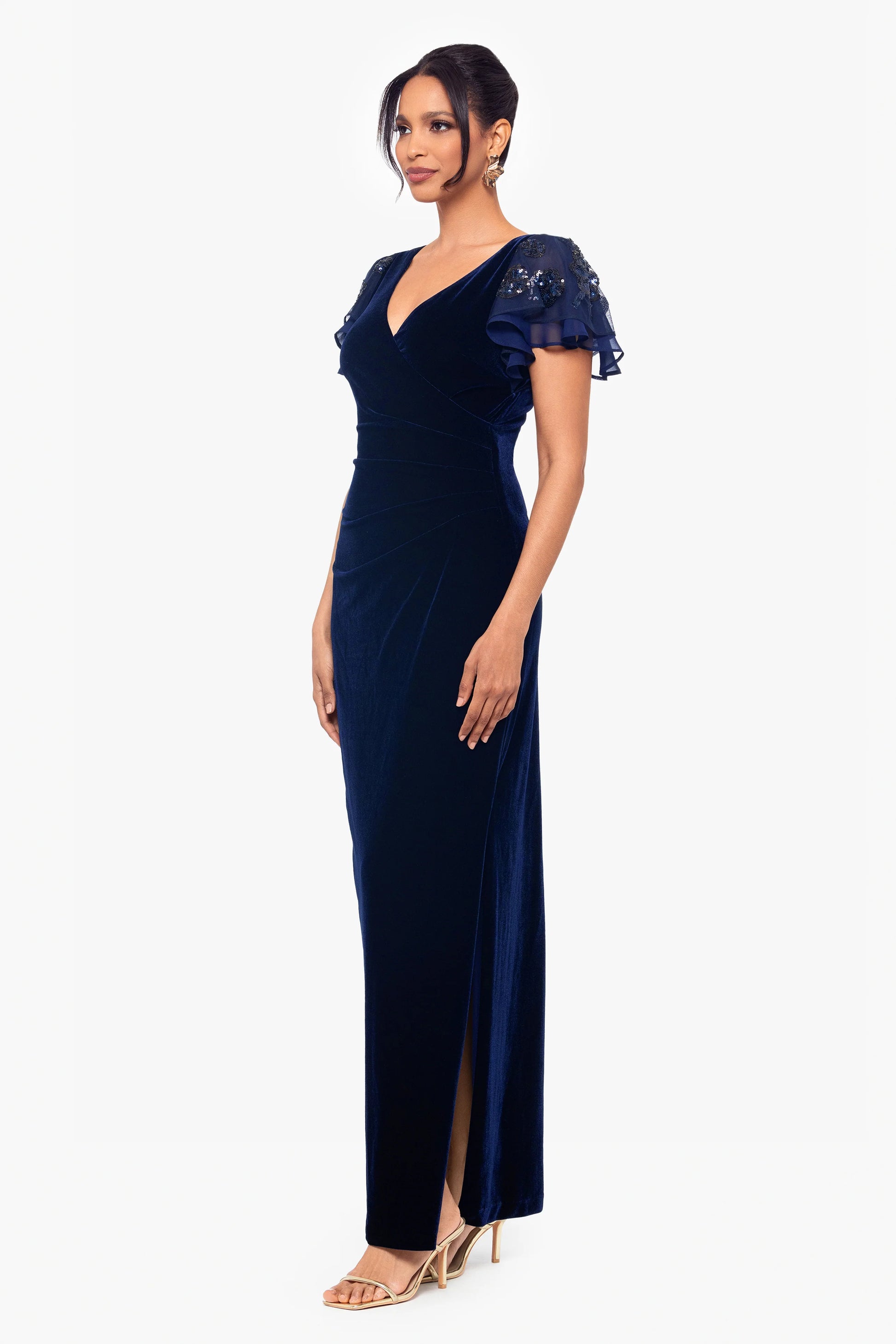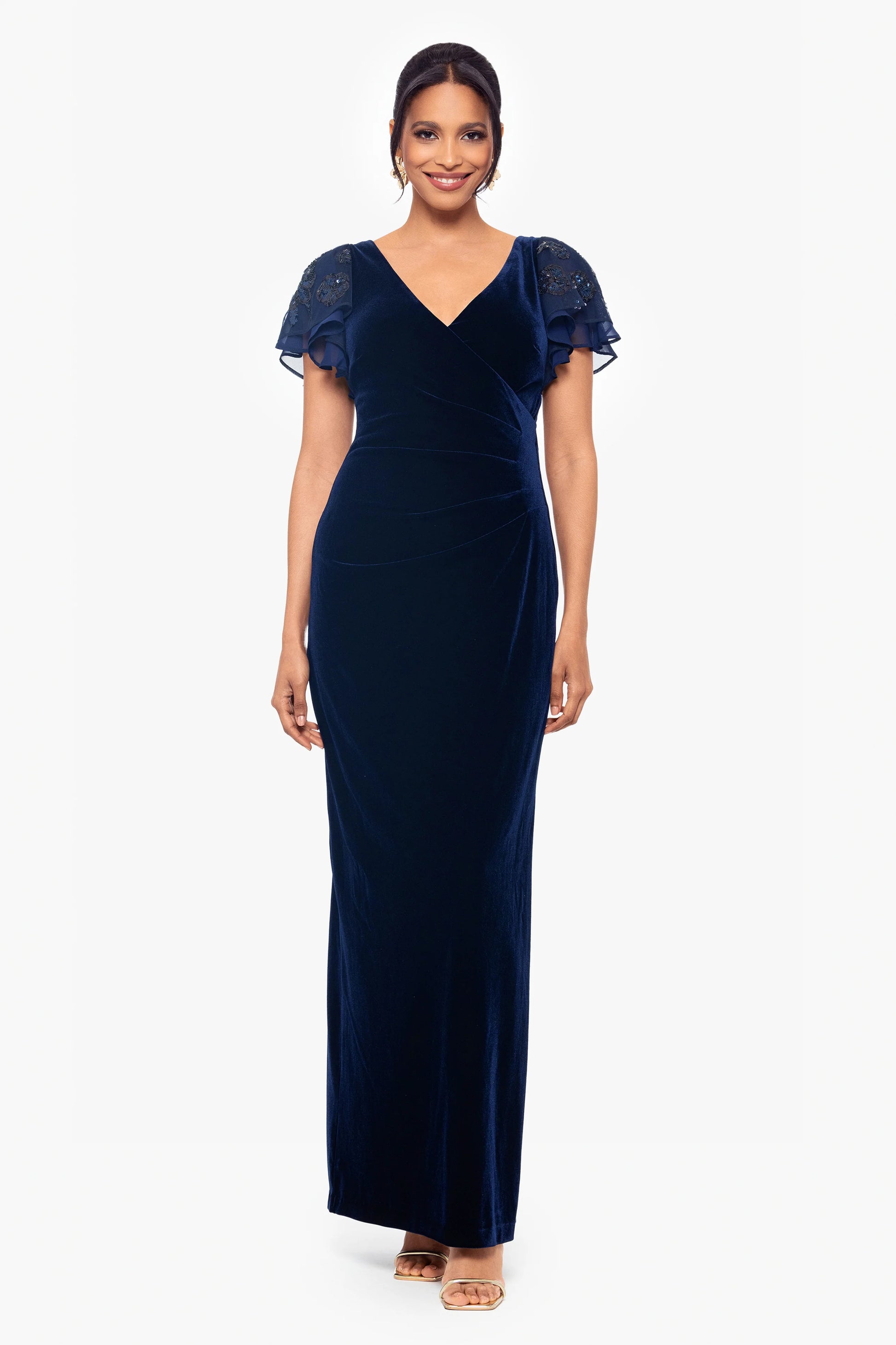 This dress features flutter sleeves with delicate embellishments that add a touch of elegance. The V-neckline and wrap-style bodice create a flattering silhouette, emphasizing the waist. The floor-length design offers a sophisticated and graceful look, perfect for formal occasions.