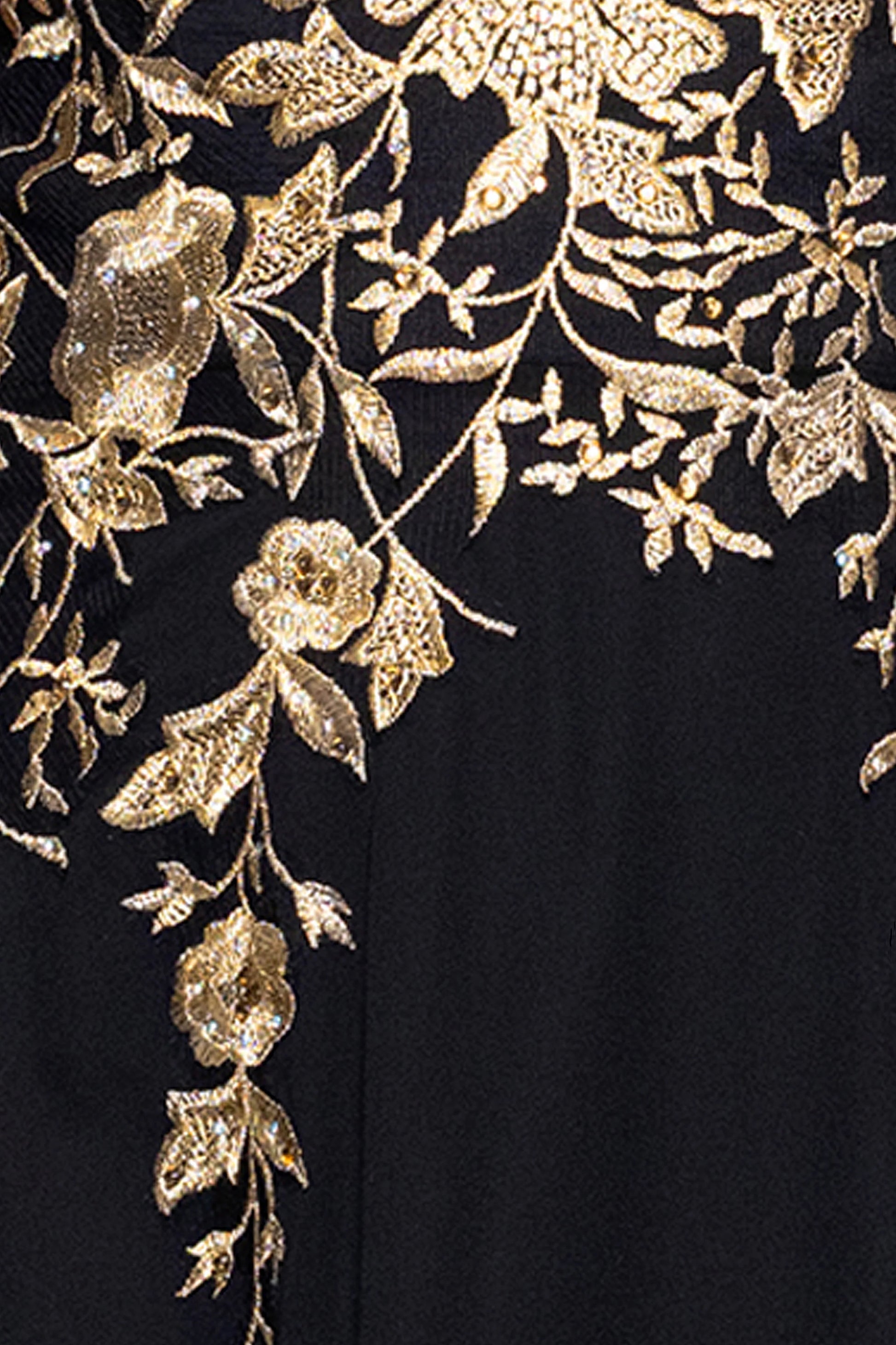 Make a statement in this effortlessly elegant gown, featuring intricate floral embroidery that adds a touch of romance. The flattering V-neckline and cap sleeves enhance the fitted bodice, while the flowing chiffon skirt moves beautifully with every step. A subtle front slit adds just the right amount of drama, making this dress a perfect choice for your next formal occasion.