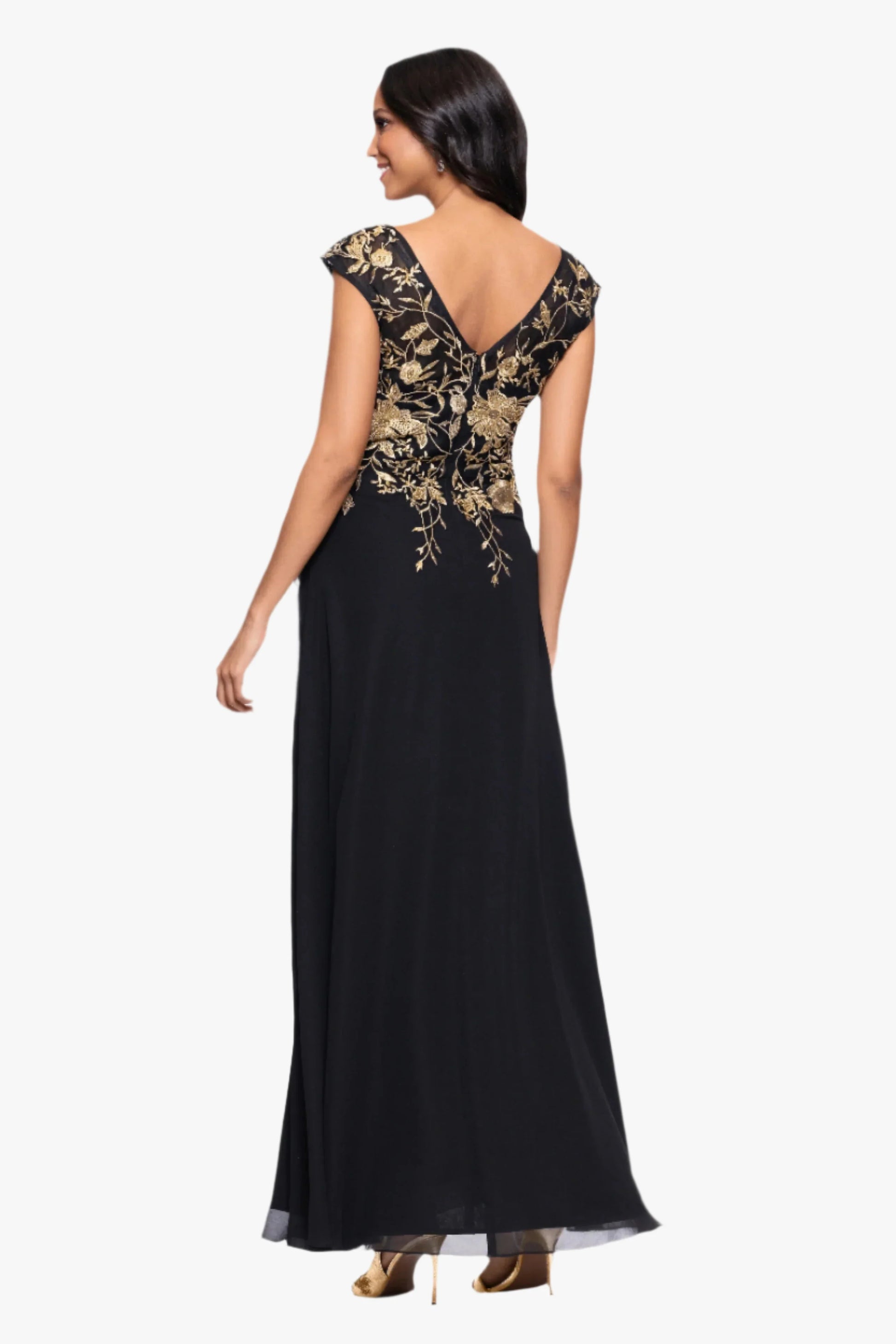 Petite "Maeve" Chiffon Embroidered Bodice Floor Length Dress