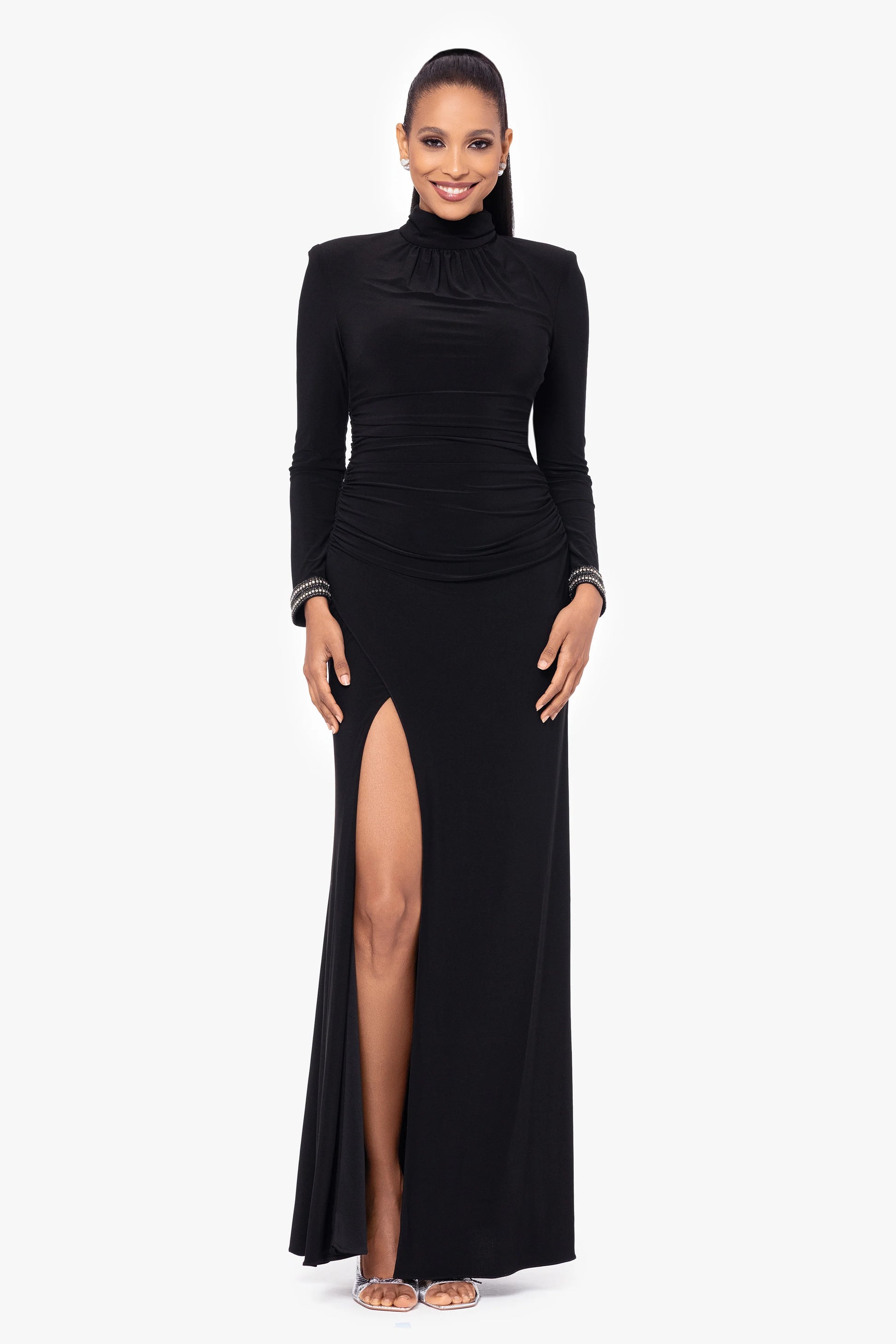 This elegant gown features a high neckline with ruched detailing, providing a refined and sophisticated silhouette. The form-fitting design highlights the waist and is complemented by a daring thigh-high slit, adding a touch of allure. Finished with embellished cuffs for an extra hint of glamour, this dress is ideal for any formal evening event.